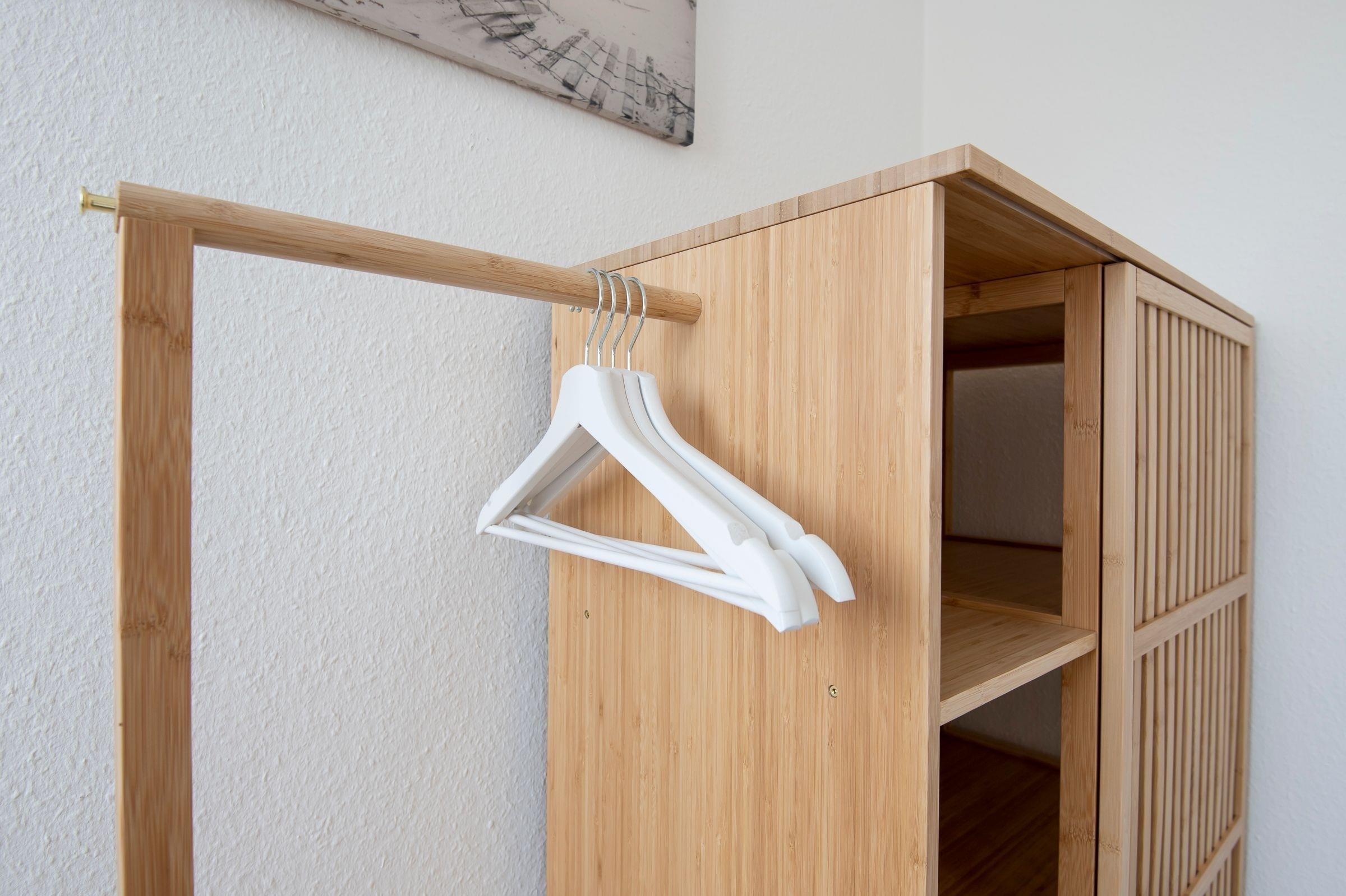 Schlafzimmer 1: 1 Doppelbett (2x 80x200 cm), Kleiderschrank, Verdunkelung (Plissees), Platz für Kinderreisebett vorhanden