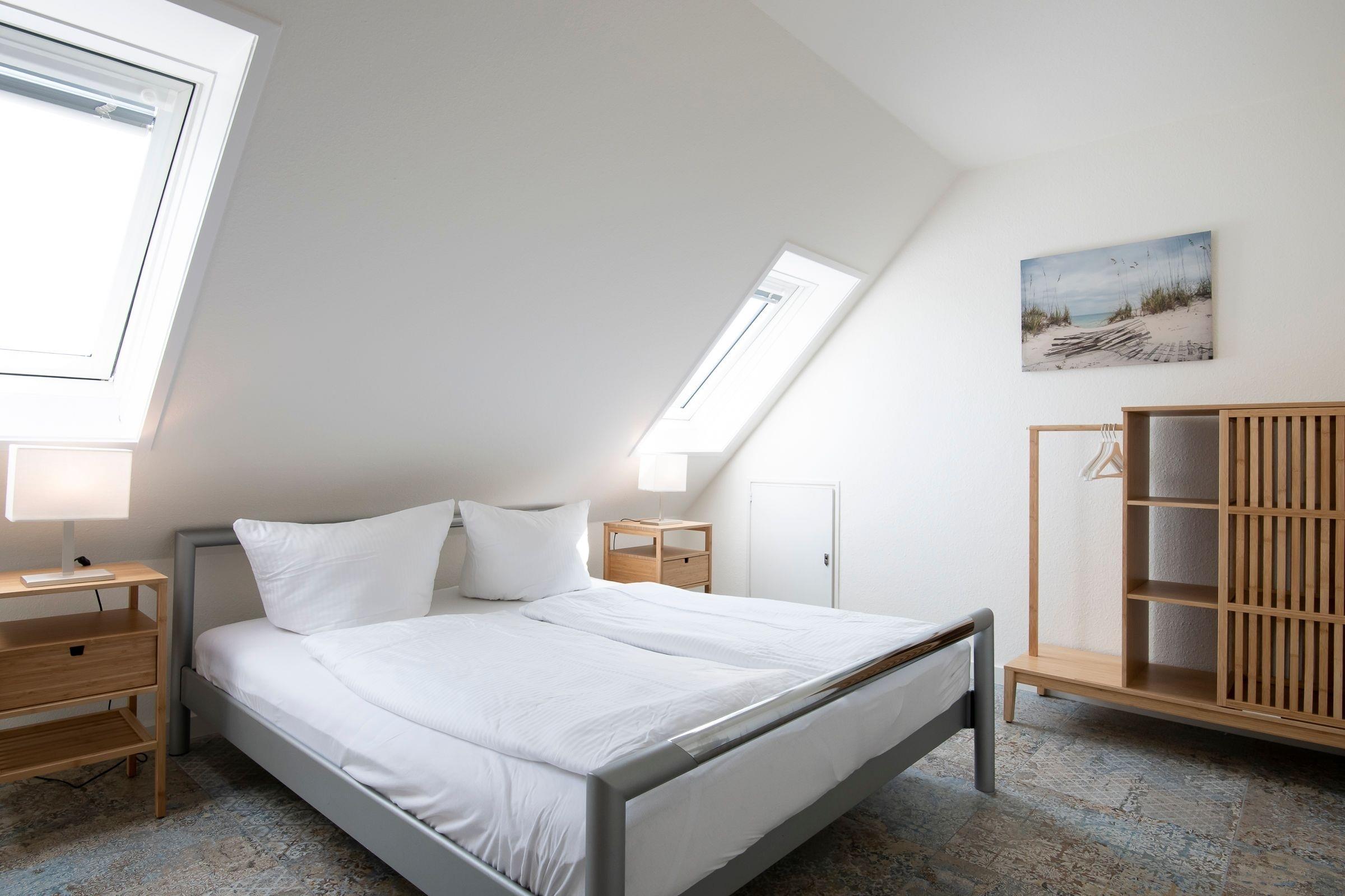 Das angrenzende Schlafzimmer mit Kleiderschrank bietet mit dem bequemen Doppelbett (2x 80x200 cm) eine Rückzugsmöglichkeit zum Erholen und Träumen. Über eine Wendeltreppe gelangen Sie in das Dachgeschoss, wo Sie sich in Ihr eigenes Reich mit 2 Einzelbetten (je 90x200 cm) unter gemütlichen Dachschrägen zurückziehen können.