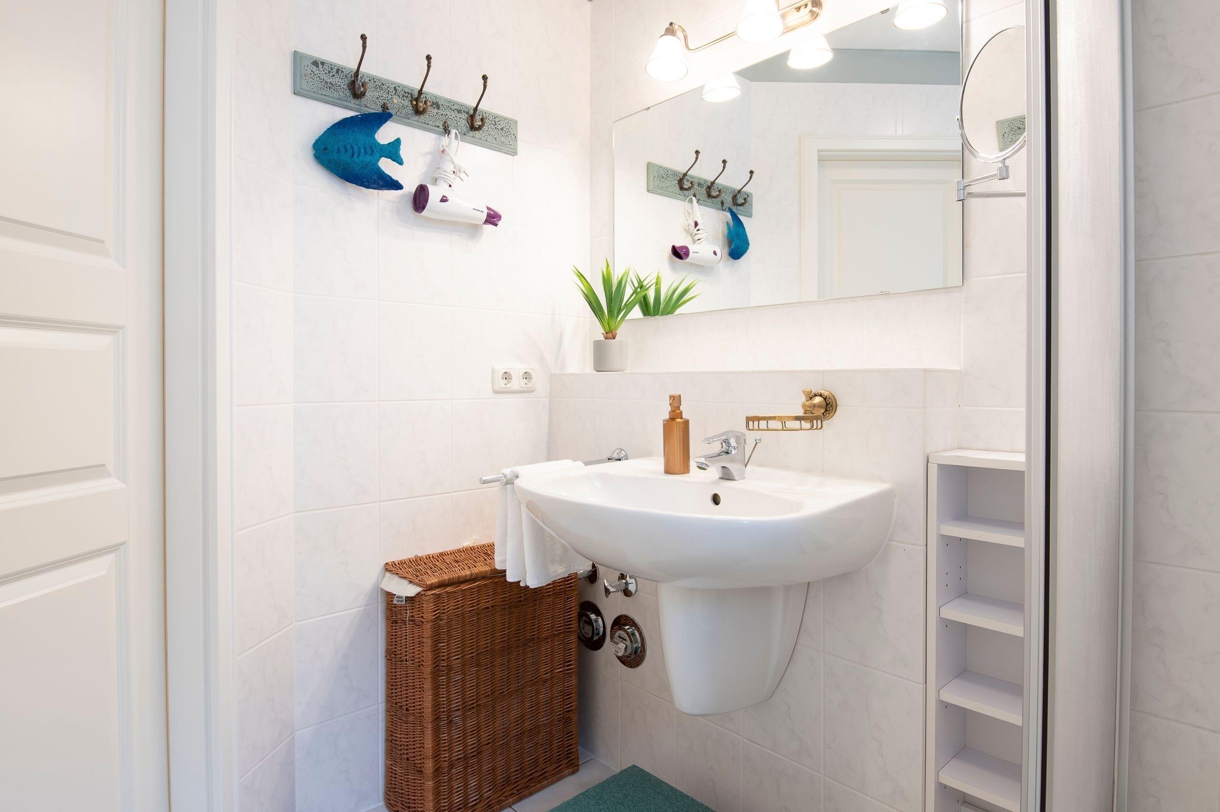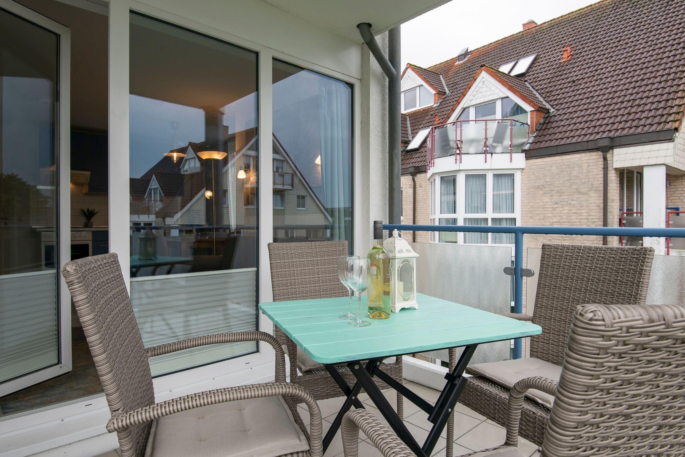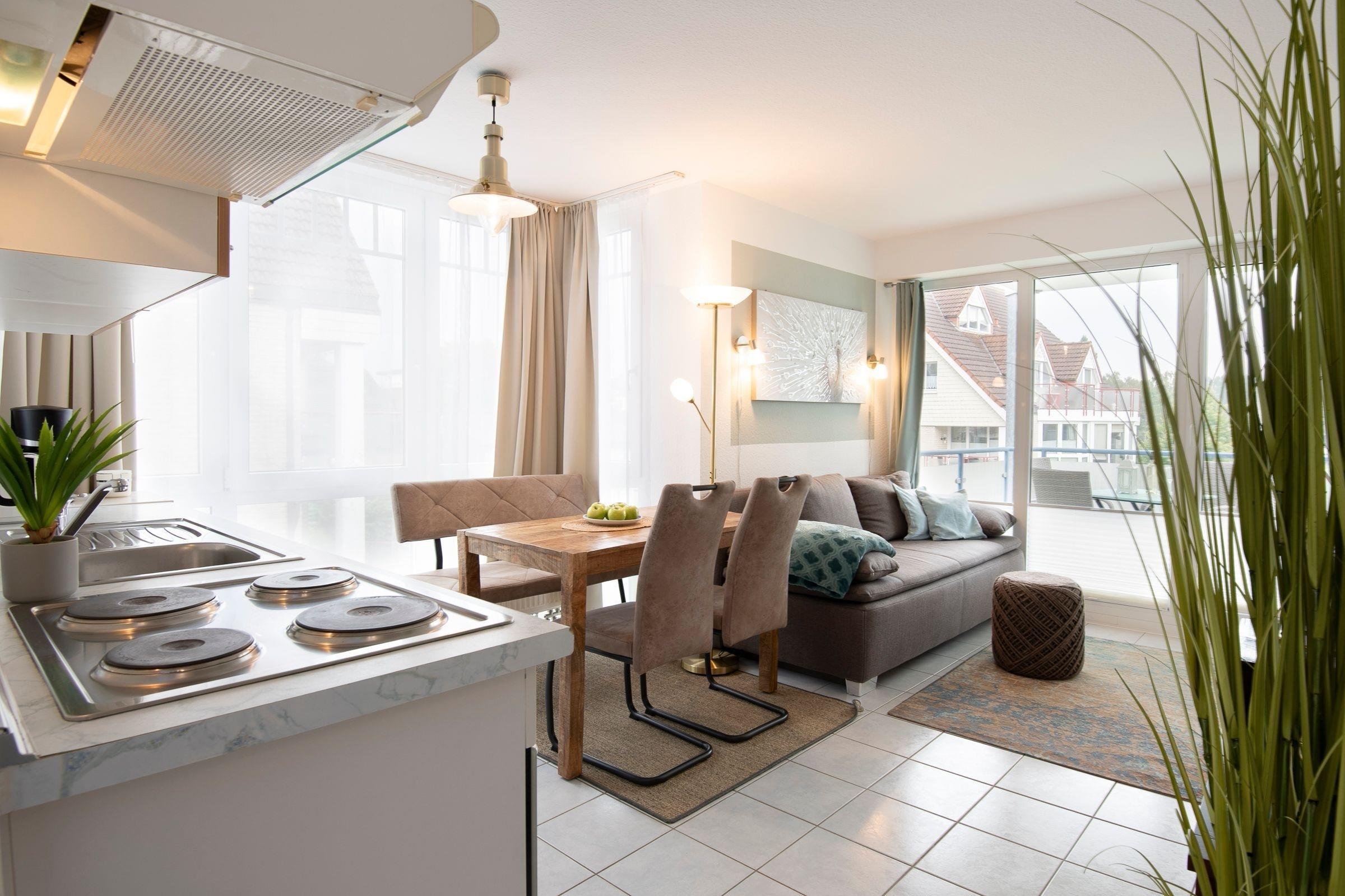 Im geschmackvoll eingerichteten Wohn-/Ess- und Kochbereich ist an alles gedacht worden, um Ihnen einen angenehmen Urlaub zu bescheren. Auf der kuscheligen Couch können Sie es sich vor dem Fernseher gemütlich machen. Diese können Sie im Handumdrehen in zwei weitere Schlafplätze (2x 80x200 cm) verwandeln. Direkt daneben bietet der rustikale Holztisch Platz zum Essen oder Spielen. Sollte Ihnen einmal nichts auf den Speisekarten der umliegenden Restaurants finden, können Sie sich in der kleinen gut ausgestatteten Küche selbst verwöhnen. Genießen Sie die gute Ostseeluft auf dem überdachten, möblierten Eckbalkon, der Sie zu lauschigen Abenden einlädt. Gleich nebenan im separaten Schlafzimmer verbringen Sie erholsame Nächte im bequemen Doppelbett (2x 80x200cm). Zur täglichen Körperpflege steht Ihnen ein Tageslichtbad mit Dusche (Duscheinstieg: ca. 35 cm) zur Verfügung.