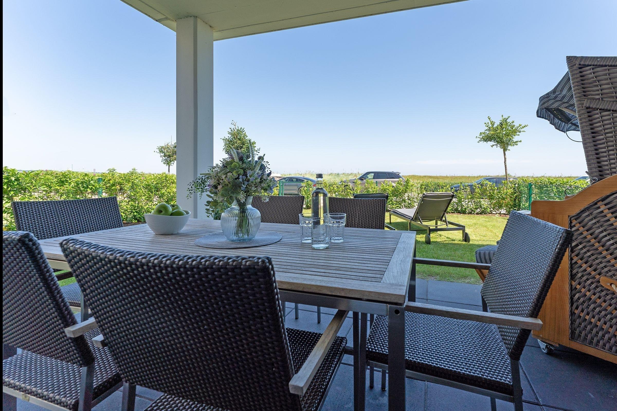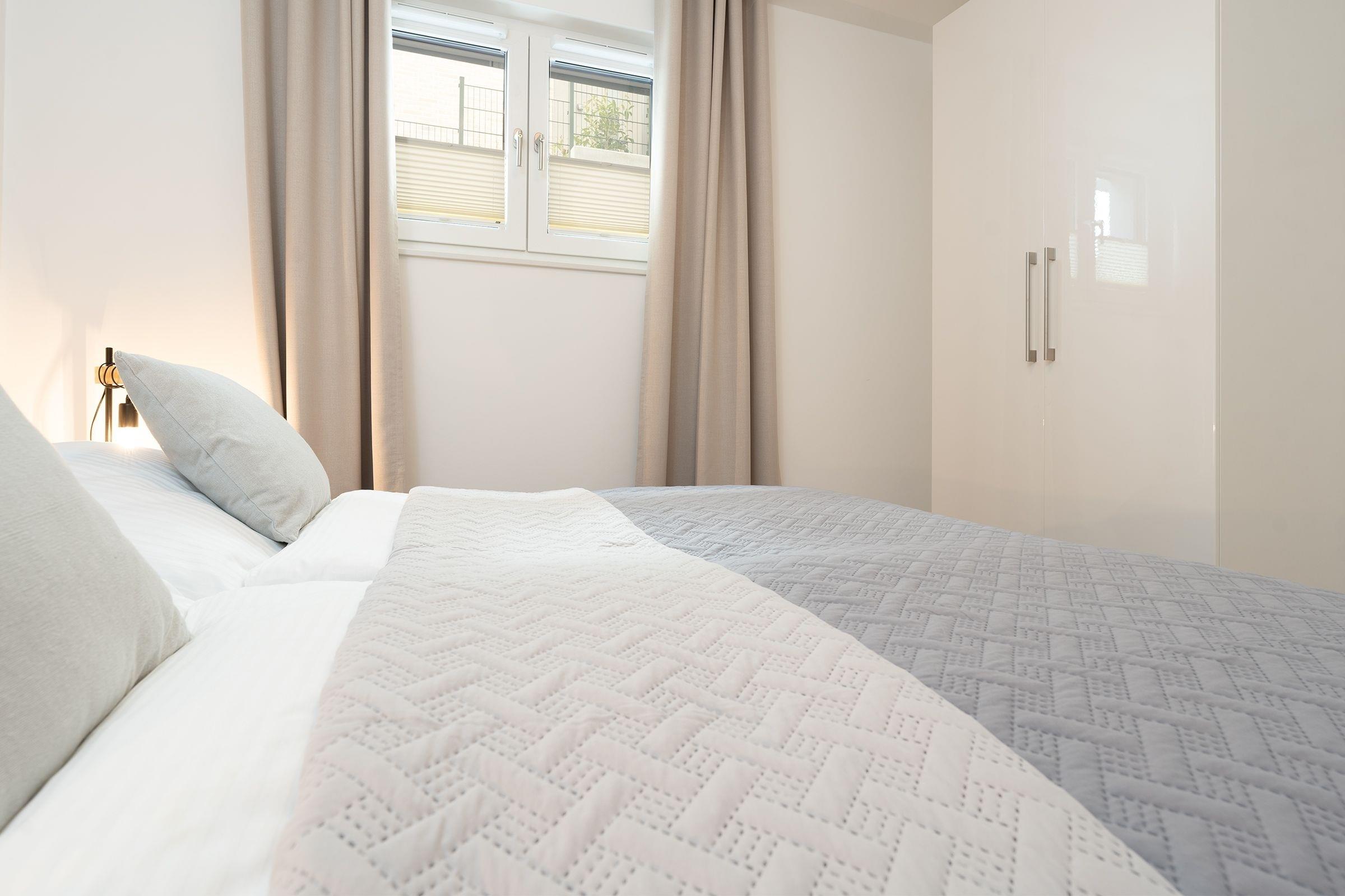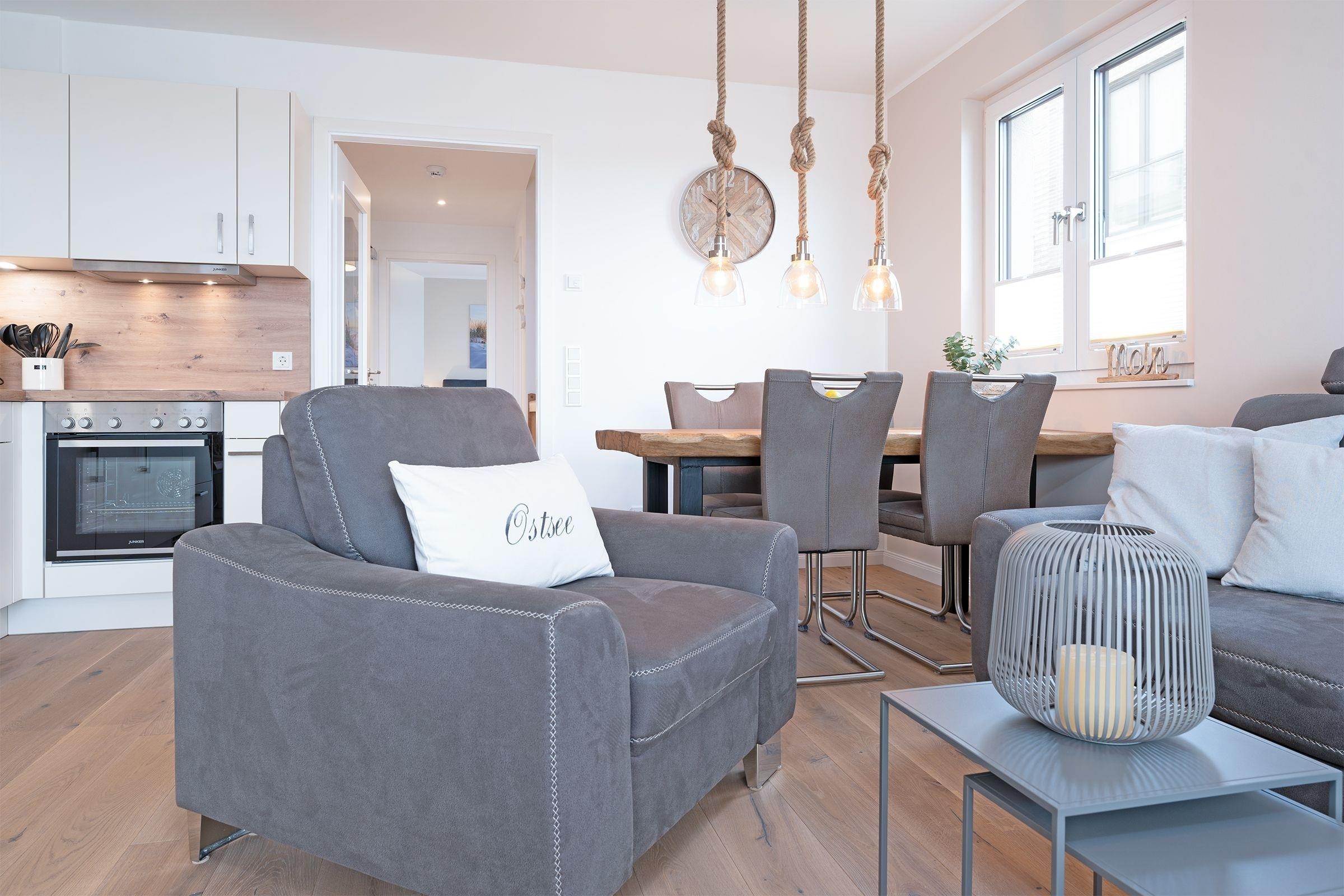 Hell, modern und in maritimem Chic empfängt Sie der offene Wohnbereich mit gemütlicher Couch, die bei Bedarf in einen weiteren Schlafplatz (120x230 cm) verwandelt werden kann. In der hochwertigen Küche, die mit allen Annehmlichkeiten ausgestattet ist, bereitet Ihnen das Zubereiten der Mahlzeiten bestimmt besonders viel Freude. Nehmen Sie Platz am großzügigen Esstisch und planen Sie gemeinsam den kommenden Urlaubstag. Genießen Sie zahlreiche Sonnenstunden auf der möblierten Terrasse und machen Sie es sich im windgeschützten Strandkorb gemütlich - untermalt vom Rauschen der Ostsee. Im Erdgeschoss befindet sich neben dem Gäste-WC außerdem eines der beiden Schlafzimmer, das Sie mit einem luxuriösen Boxspringbett (ca. 180x200cm) empfängt. Das zweite Schlafzimmer mit Bad en Suite erwartet Sie im Souterrain, ebenfalls mit einem großen Boxspringbett (ca. 180x200cm). Das Badezimmer mit ebenerdiger Dusche und Doppelwaschtisch vermittelt Wellness-Feeling. Zur Nacht lassen sich alle Zimmer angenehm abdunkeln.