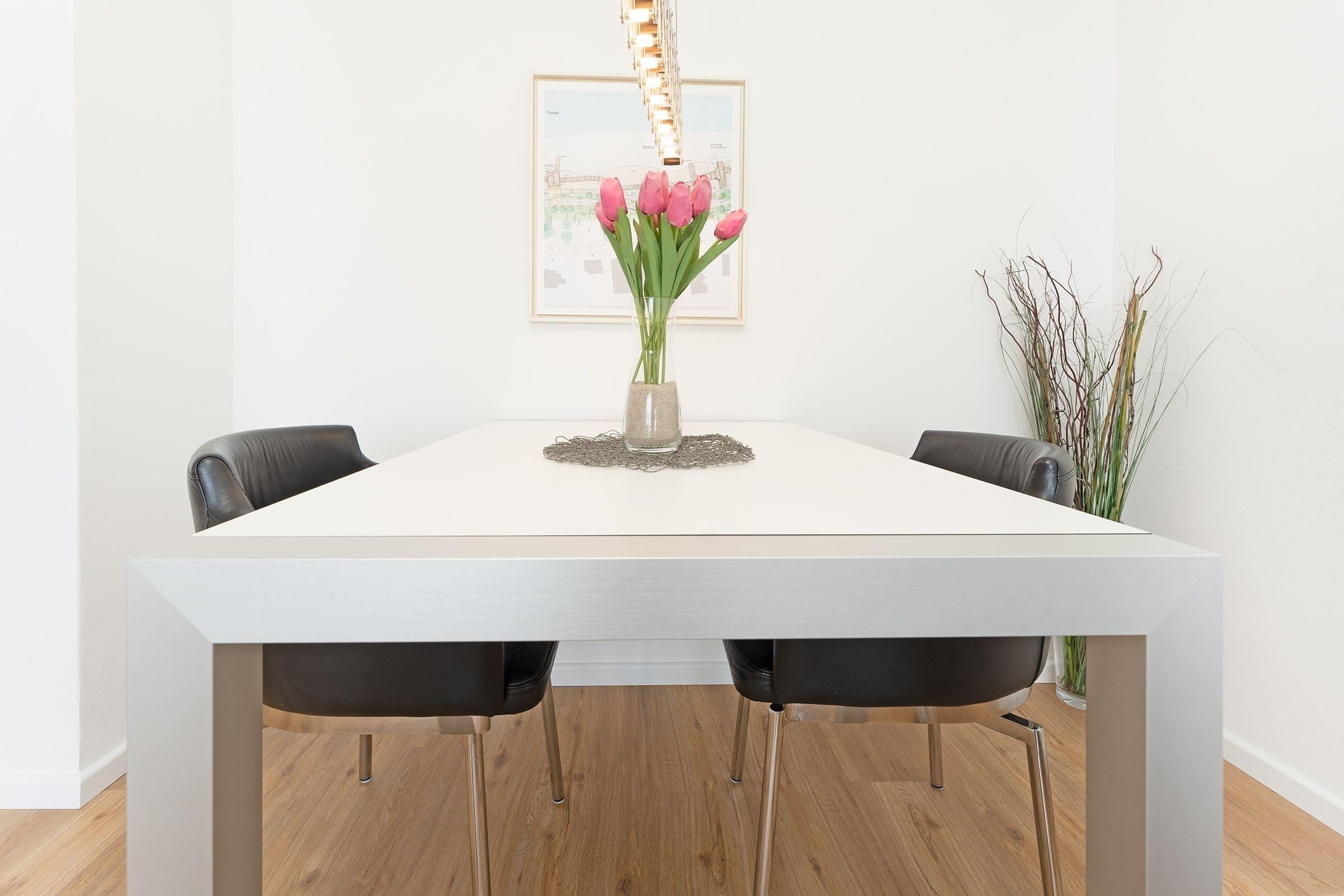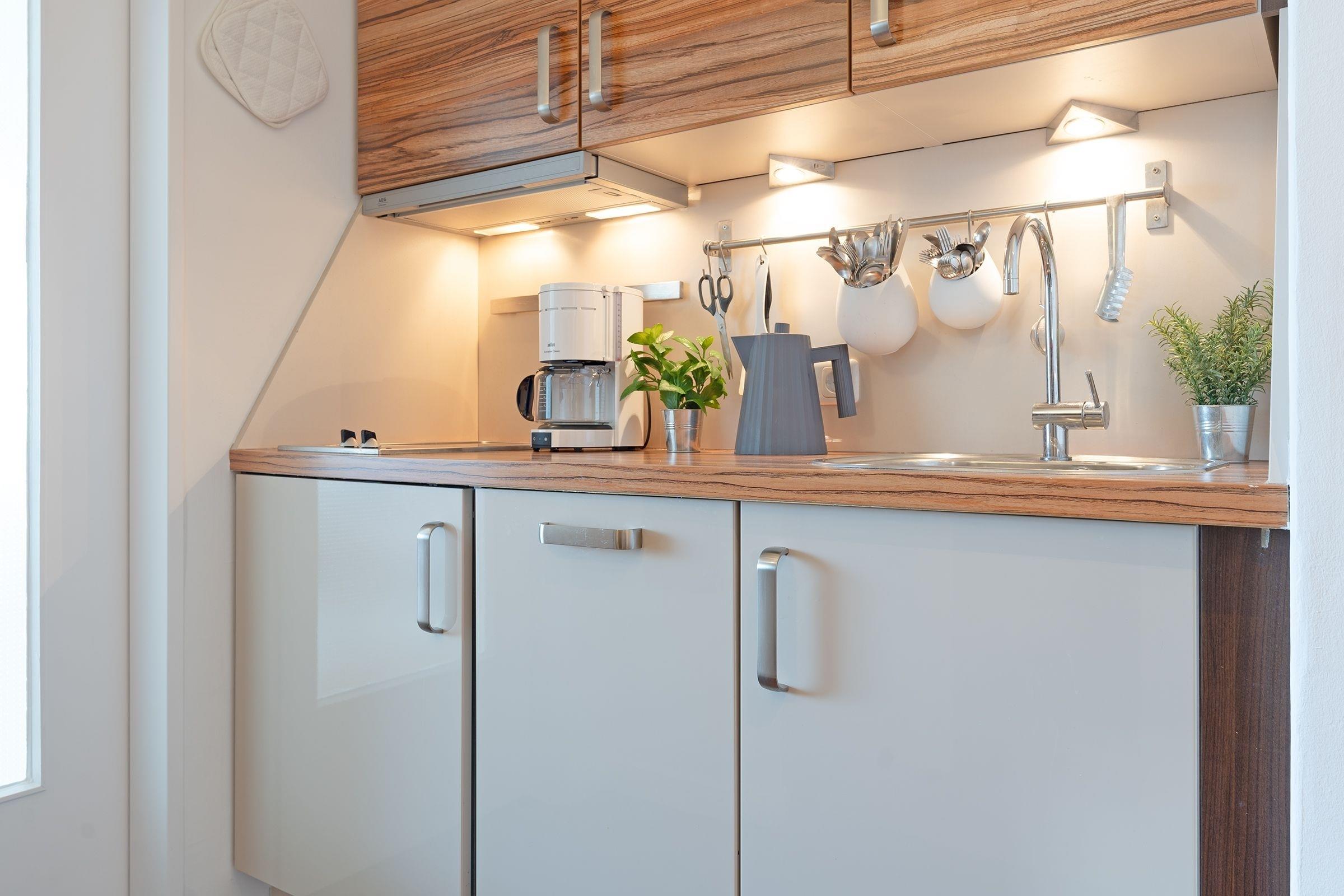 Im Flur befindet sich die funktionale und mit vielen Annehmlichkeiten ausgestattete Küchenzeile. Die dort zubereiteten Mahlzeiten können Sie im Wohnzimmer am Esstisch einnehmen.