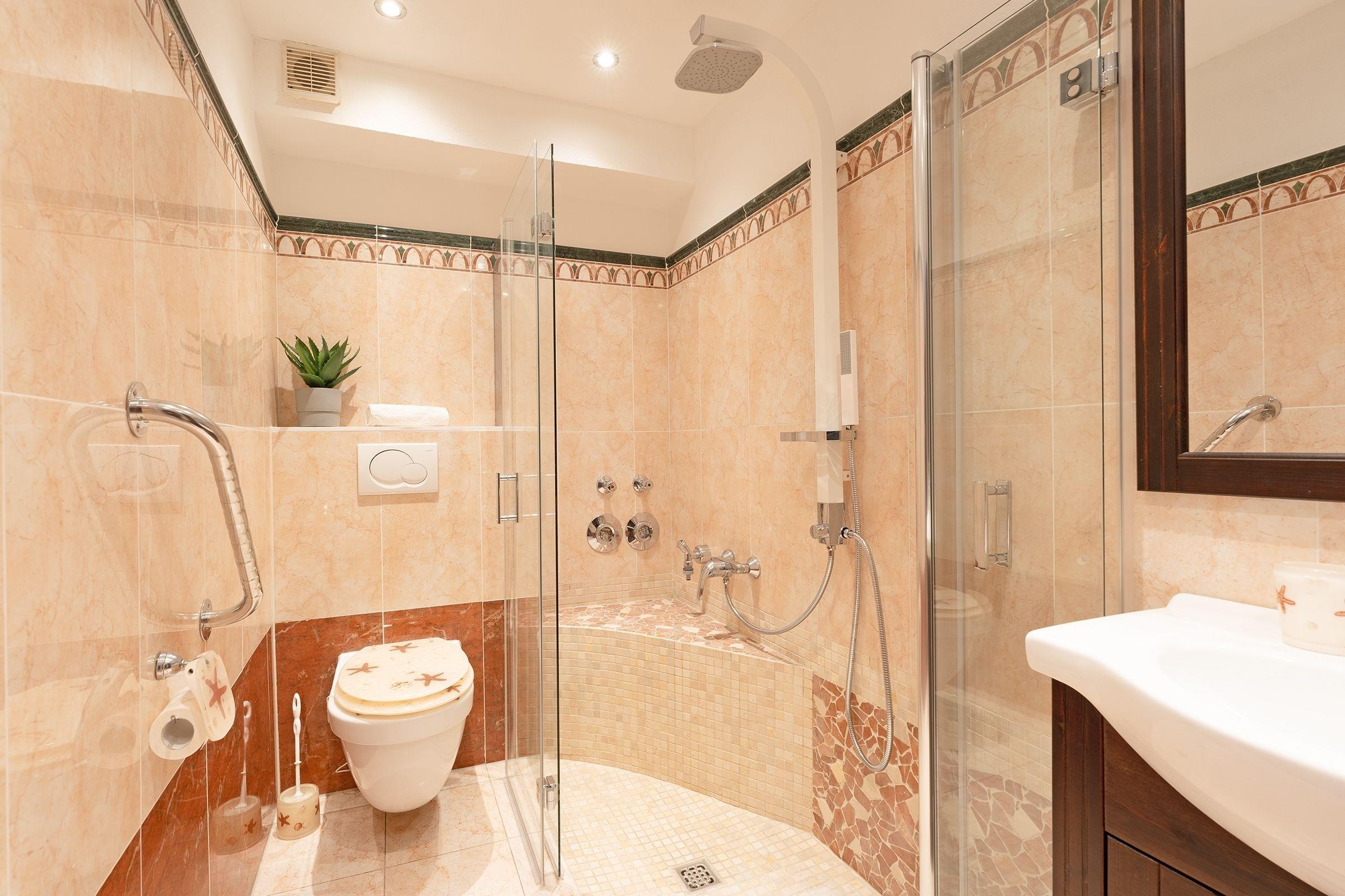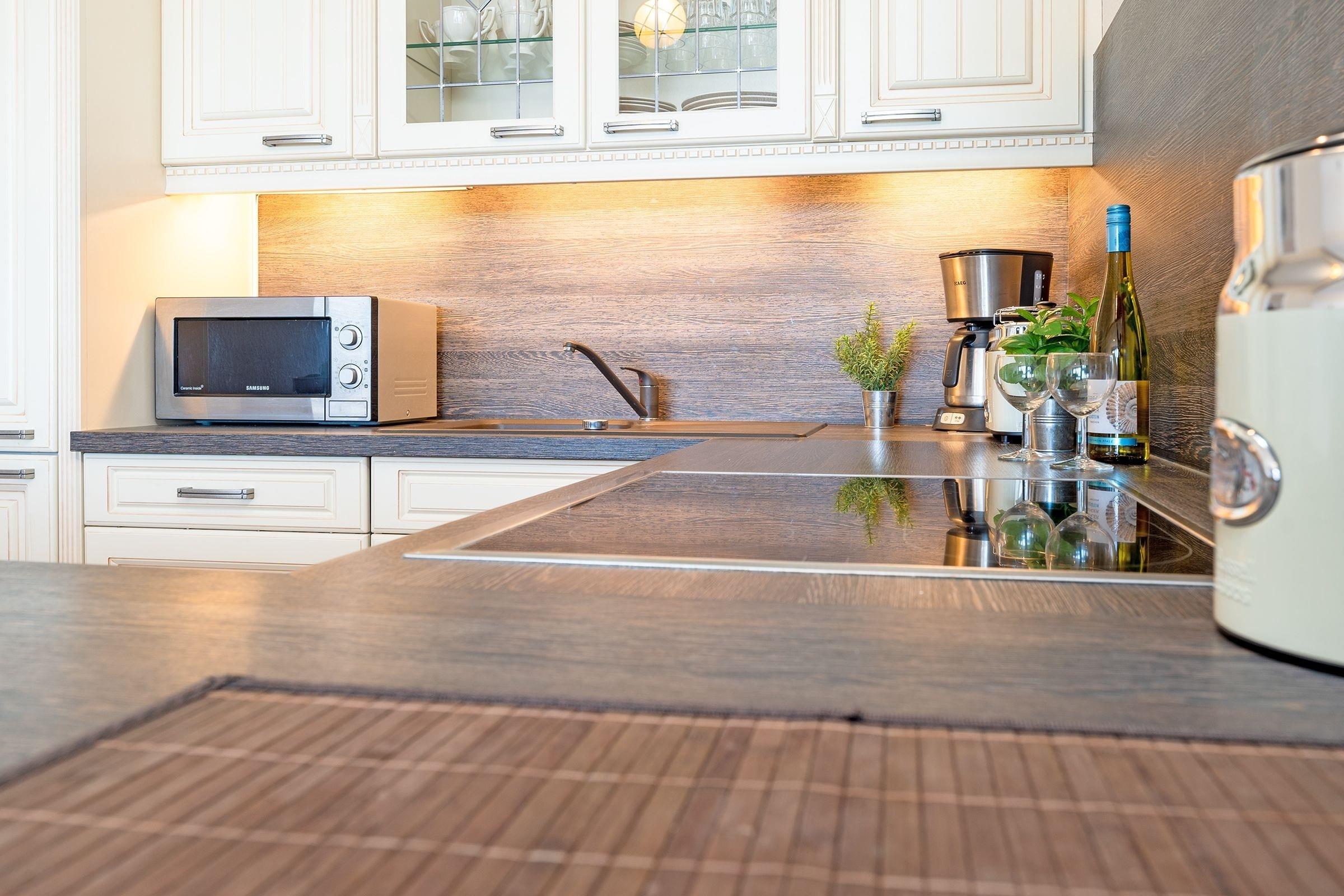 Diese zauberhafte Ferienwohnung heißt Meerblick Lounge – und macht ihrem Namen alle Ehre. Betreten Sie das lichtdurchflutete Wohnzimmer mit der großer Fensterfront, nehmen Sie Platz auf der kuscheligen Sofa-Landschaft und lassen Sie sich von dem sagenhaften Meerblick verzaubern. Für Unterhaltung sorgt ein TV-Gerät – aber auf die Ostsee zu schauen, ist sicher schöner. Kommen Sie raus auf die davor liegende, geräumige Terrasse. Hier können Sie im Strandkorb Ihren ersten Morgenkaffe trinken und den Sonnenaufgang über dem Meer genießen. Der Strand selbst ist auch nur rund 60 Meter entfernt. Ostsee pur. Die in den Wohnbereich integrierte Küche mit Spülmaschine bietet Ihnen alle Annehmlichkeiten, die Sie im Urlaub für die Zubereitung Ihrer Lieblingsmenüs brauchen. Raffiniert: Sie können komfortabel am Ess-Tresen sitzen, gleichzeitig sorgt der Tresen als Raumteiler für eine gemütliche Atmosphäre. Nach einem erlebnisreichen Tag an der Küste finden Sie angenehme Nachtruhe zum einen im Wohnzimmer: Das Sofa lässt sich in ein Doppelbett (ca. 140x200 cm) verwandeln. Zum anderen steht Ihnen im innenliegenden Schlafzimmer ein Doppelbett (2x 90x200 cm) sowie ein weiteres TV-Gerät zur Verfügung. In beiden Räumen lässt sich ein Babybett aufstellen. Das innenliegende Bad verfügt über eine ebenerdige Dusche. Ein Kleiderschrank im Flur bietet ausreichend Platz zum Verstauen der Urlaubsgarderobe.