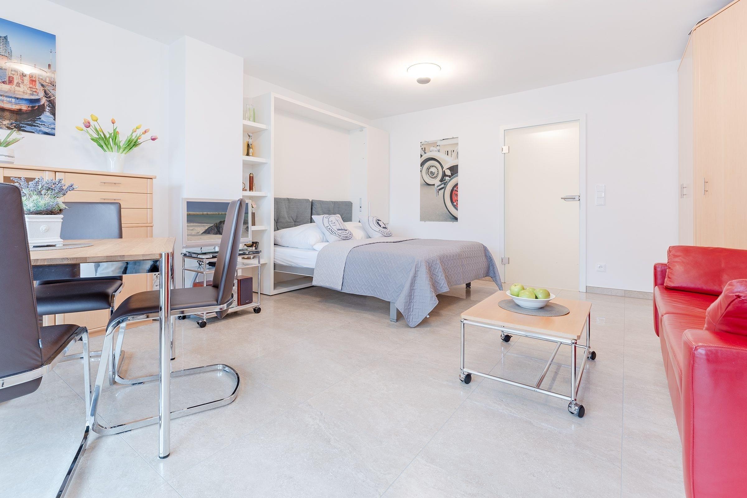Mit dem Aufzug gelangen Sie bequem in den zweiten Stock des Mehrparteienhauses und betreten Ihre Ferienwohnung. Das kombinierte Wohn-Schlafzimmer bietet Ihnen unter anderem Zugang zum möblierten Südbalkon mit Markise, ein komfortables, platzsparendes Schrankbett (ca. 160x200 cm)) sowie eine praktische Essecke und TV. Die separate Küche mit Tageslicht befindet sich gleich nebenan und ist gut ausgestattet - Kaffee-Liebhaber werden sich hier über die Nespresso-Kapselmaschine und eine French-Press freuen. Um erfrischt in den Tag zu starten, statten Sie dem Tageslichtbadezimmer mit Regendusche und Haartrockner einen kurzen Besuch ab. Für die Urlaubswäsche stehen eine Gemeinschaftswaschmaschine und -trockner bereit.