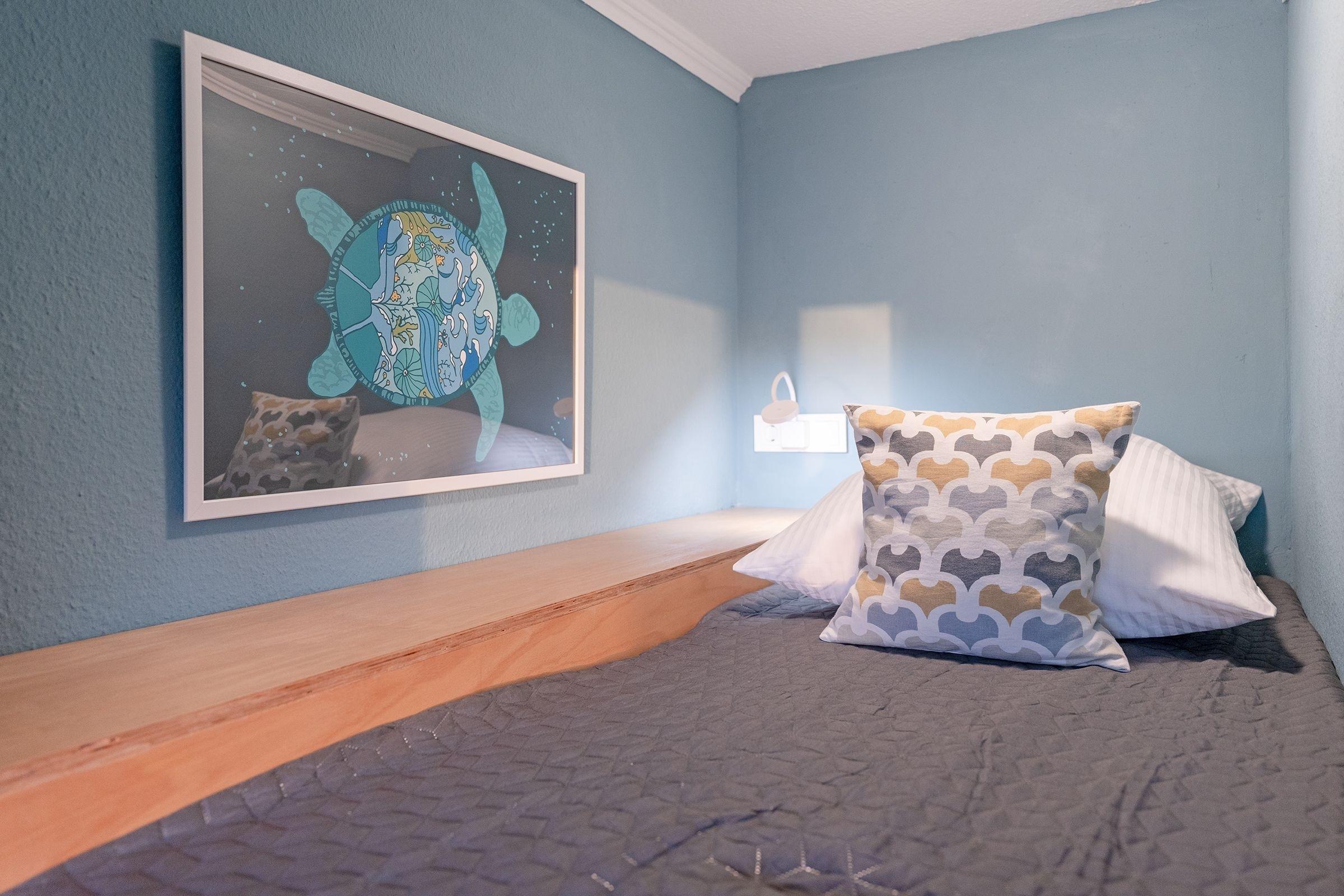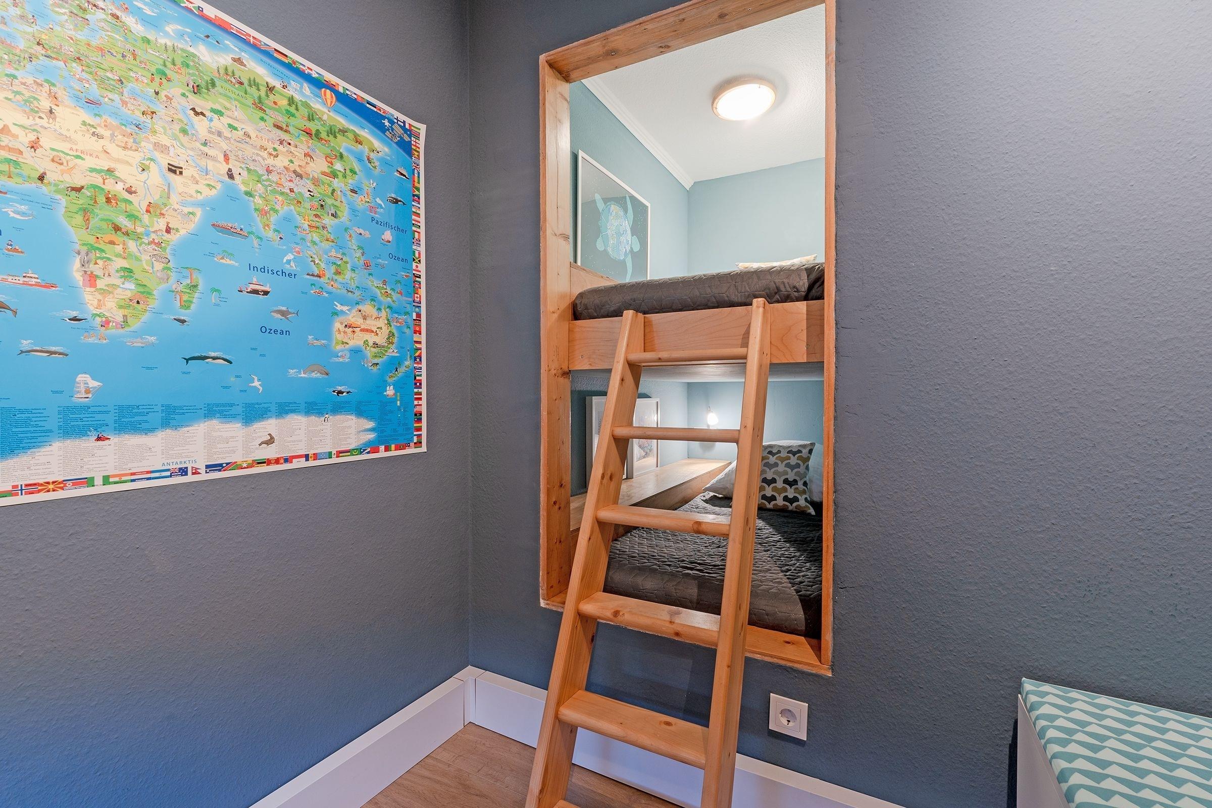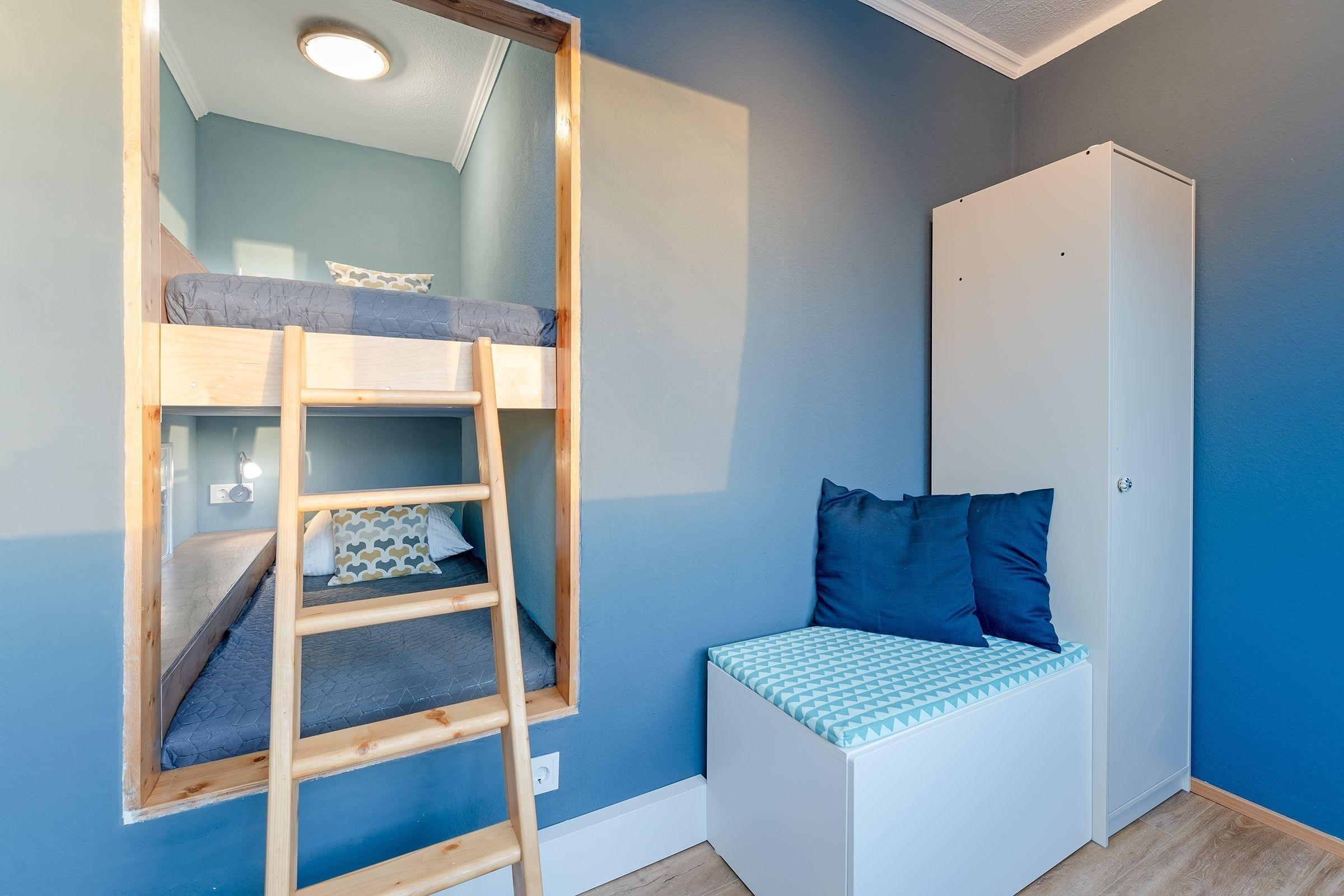 Schlafzimmer: Kojenbett (2x 80x190 cm, nur für Kinder geeignet), Verdunkelungsmöglichkeit: Gardinen, Platz für Babybett vorhanden