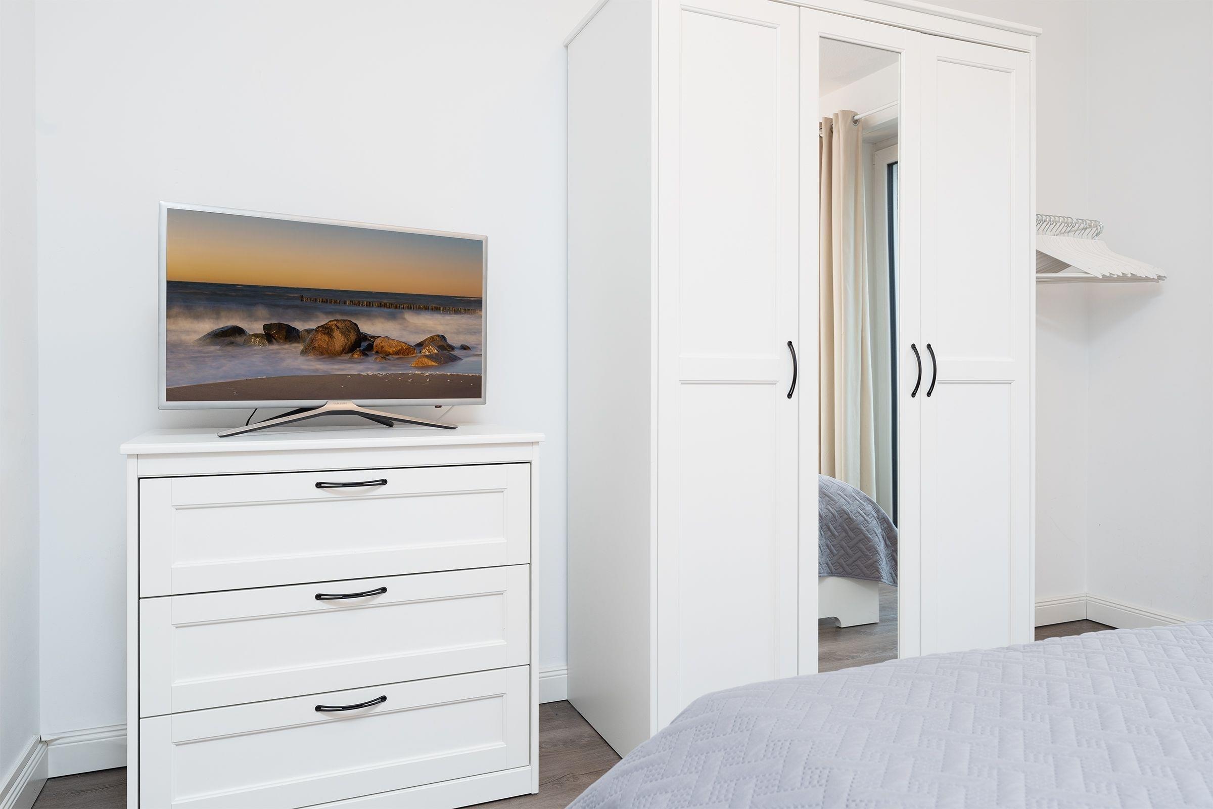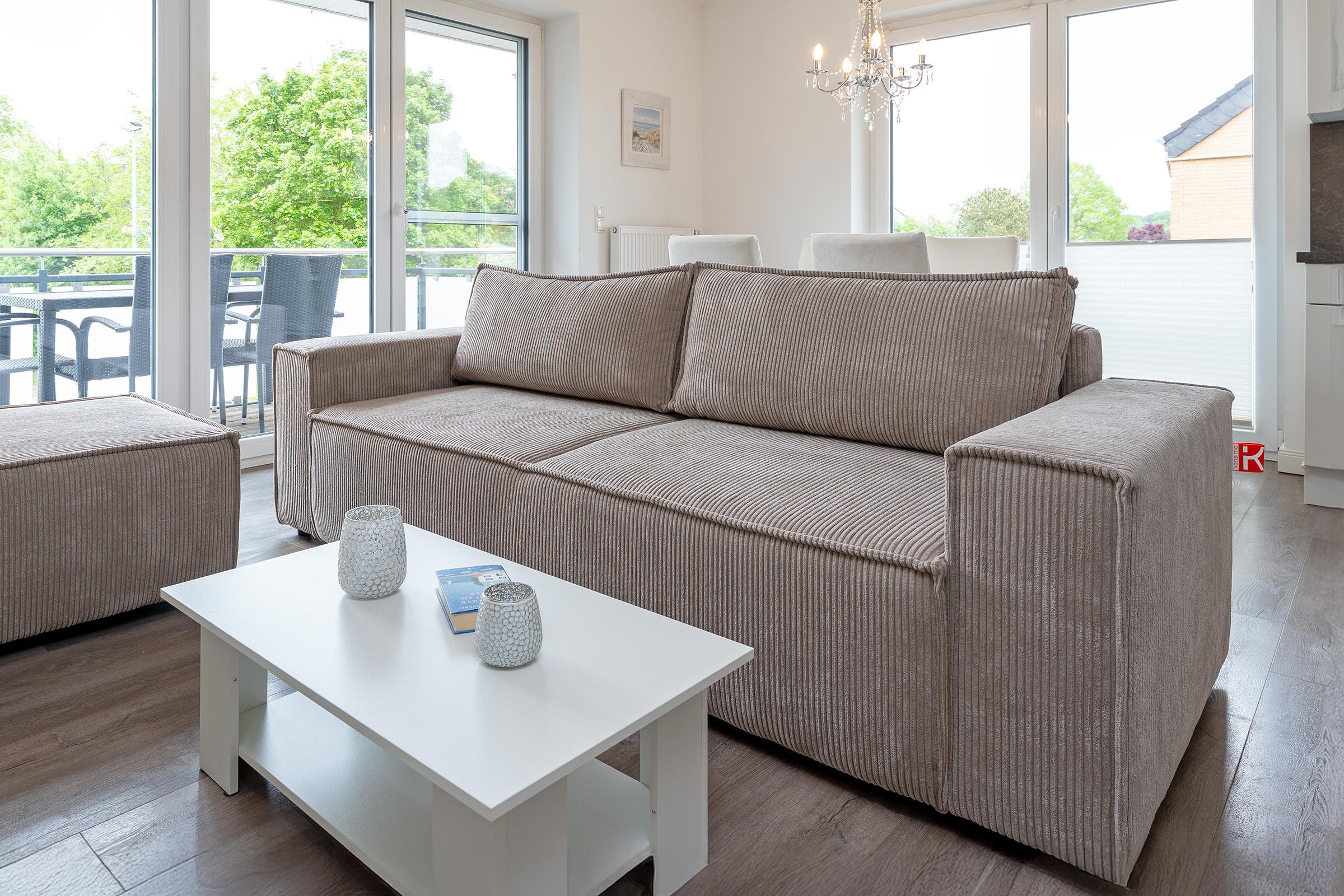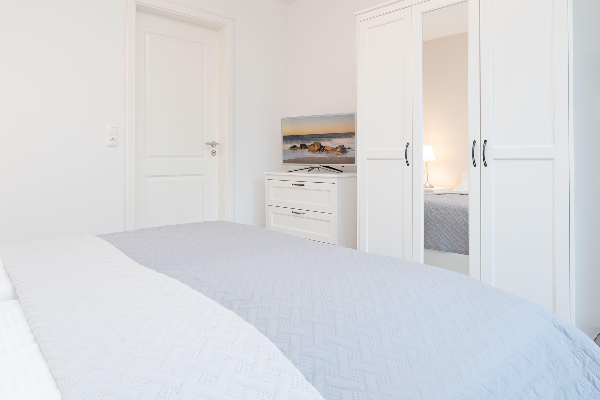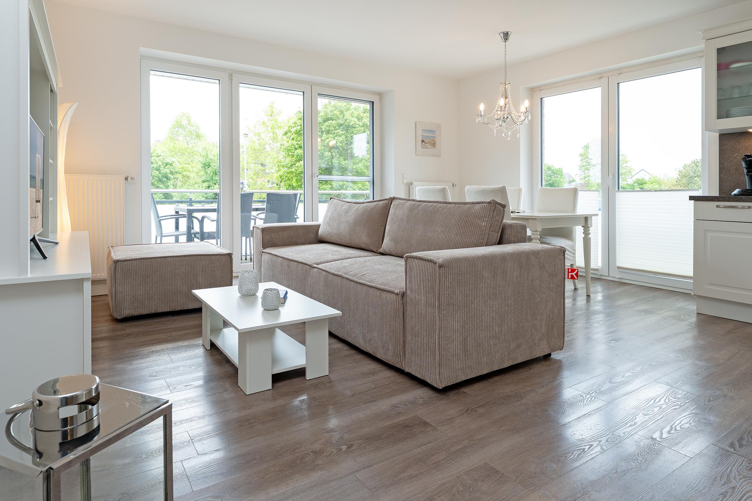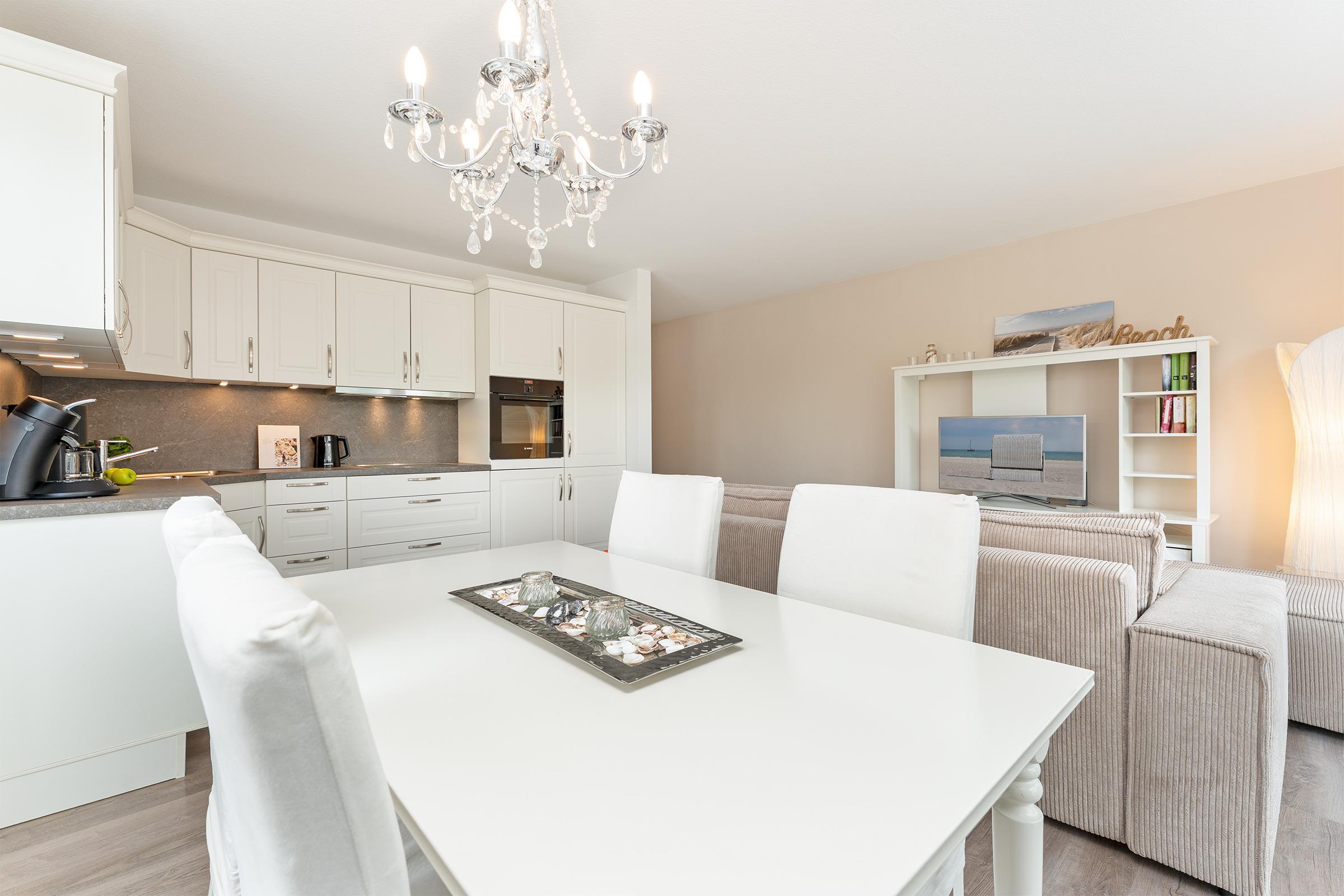 Der helle, freundliche Wohnbereich punktet durch seine durchdachte Aufteilung: Sie haben die Wahl, ob Sie auf dem Sofa vor dem TV-Gerät entspannen, in der Essecke gute Gespräche führen oder auf dem möblierten Süd-Ost-Balkon die Seeluft genießen. Die gut ausgestattete Küche mit Geschirrspüler und Senseo-Kaffeemaschine ist in den Wohnraum integriert und macht Ihre Selbstverpflegung angenehm. Für die Nacht können Sie das Sofa in ein Bett (155x195 cm) umfunktionieren und herrlich träumen - genauso im Doppelbett (180x200 cm) im separaten Schlafzimmer. Hier finden Sie auch einen Kleiderschrank sowie ein weiteres TV-Gerät. Das tageslichthelle Bad mit bodengleicher Dusche und Handtuchwärmer bietet den Komfort, den man sich im Urlaub wünscht.