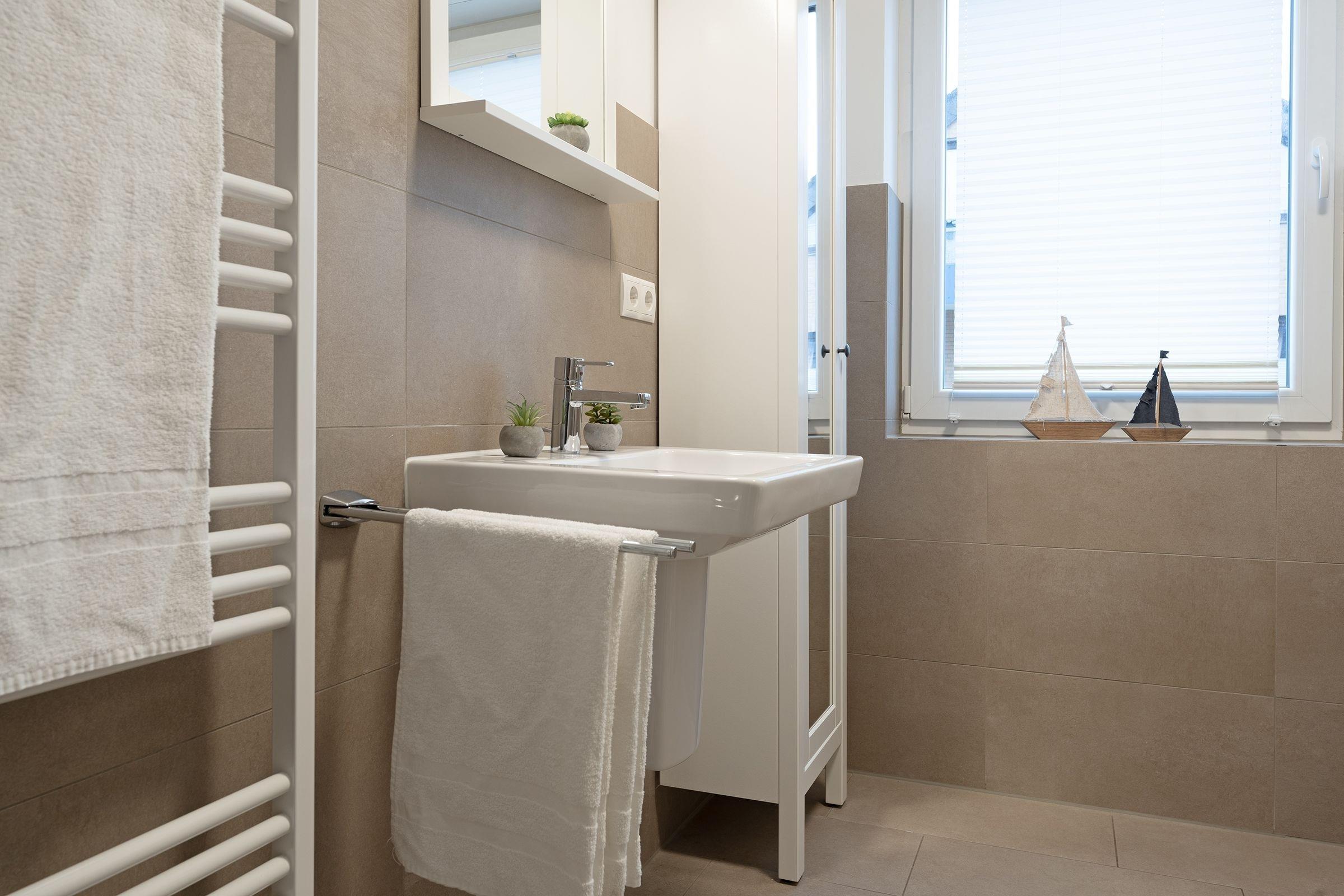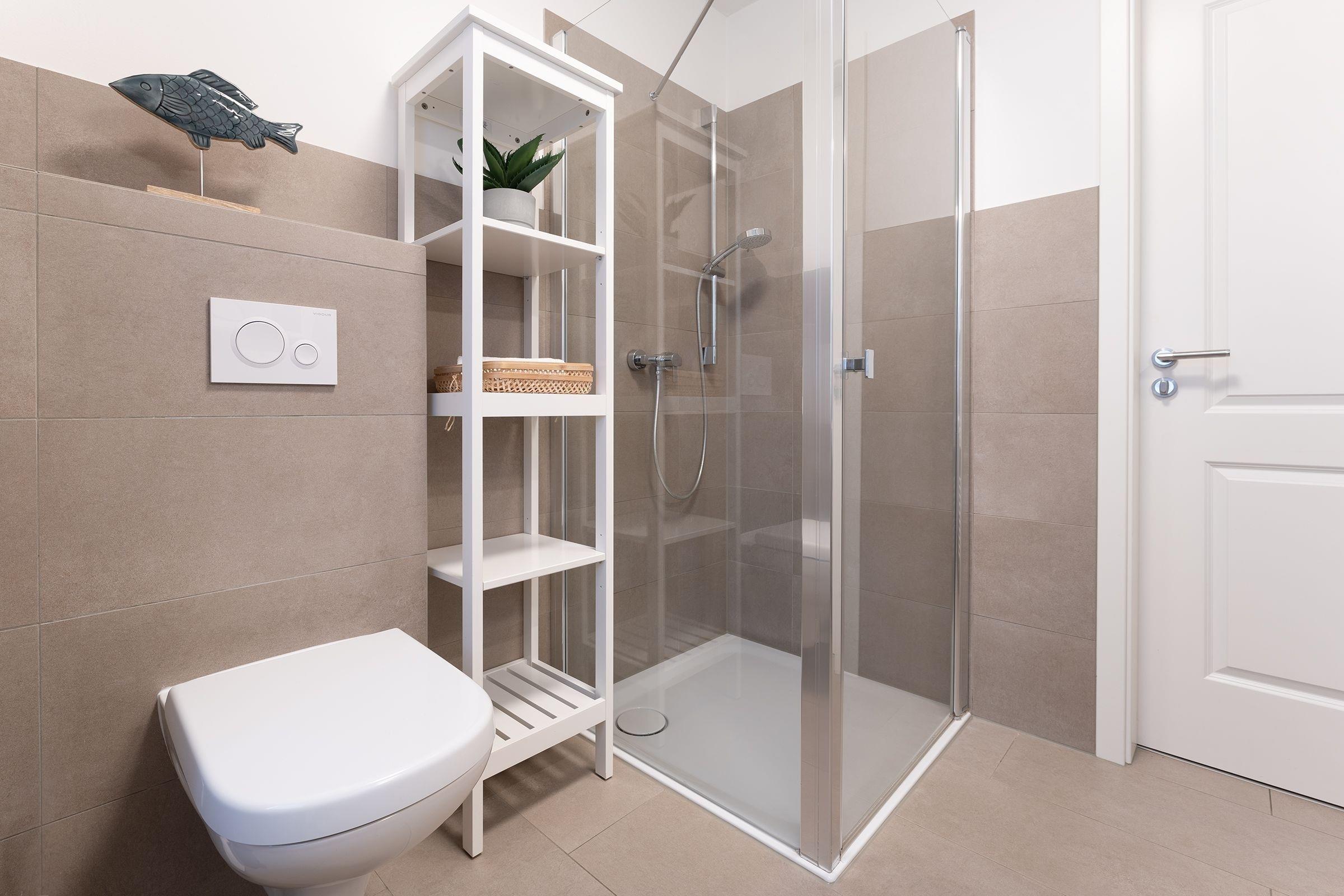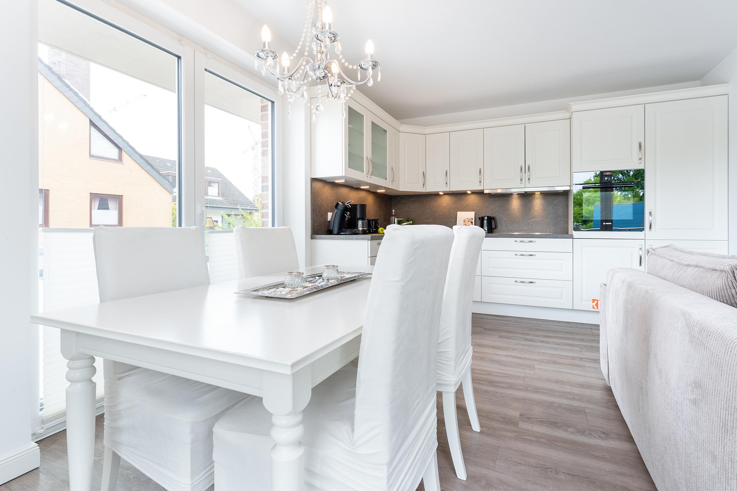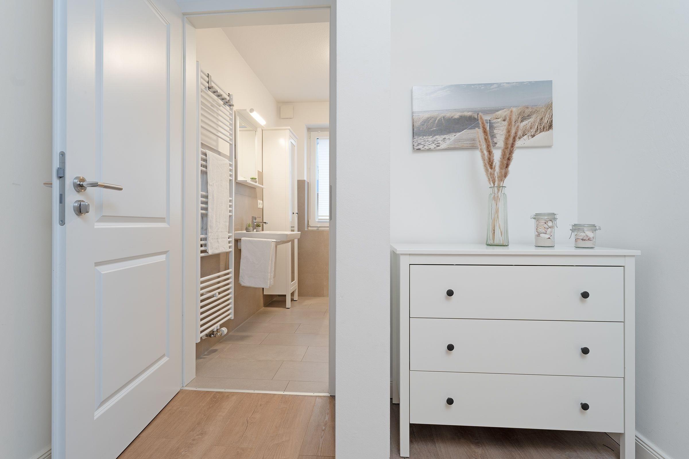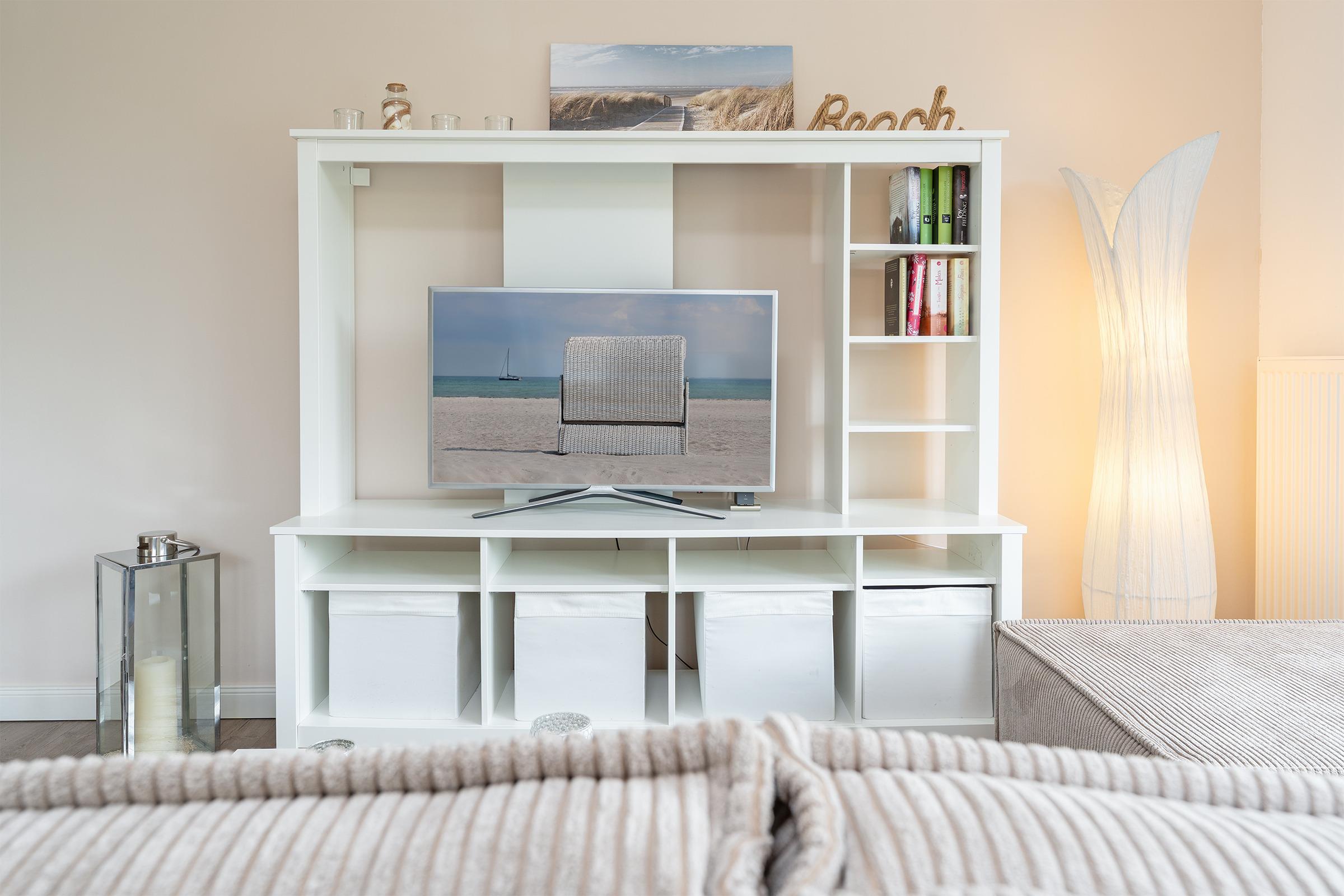 Der helle, freundliche Wohnbereich punktet durch seine durchdachte Aufteilung: Sie haben die Wahl, ob Sie auf dem Sofa vor dem TV-Gerät entspannen, in der Essecke gute Gespräche führen oder auf dem möblierten Süd-Ost-Balkon die Seeluft genießen. Die gut ausgestattete Küche mit Geschirrspüler und Senseo-Kaffeemaschine ist in den Wohnraum integriert und macht Ihre Selbstverpflegung angenehm. Für die Nacht können Sie das Sofa in ein Bett (155x195 cm) umfunktionieren und herrlich träumen - genauso im Doppelbett (180x200 cm) im separaten Schlafzimmer. Hier finden Sie auch einen Kleiderschrank sowie ein weiteres TV-Gerät. Das tageslichthelle Bad mit bodengleicher Dusche und Handtuchwärmer bietet den Komfort, den man sich im Urlaub wünscht.
