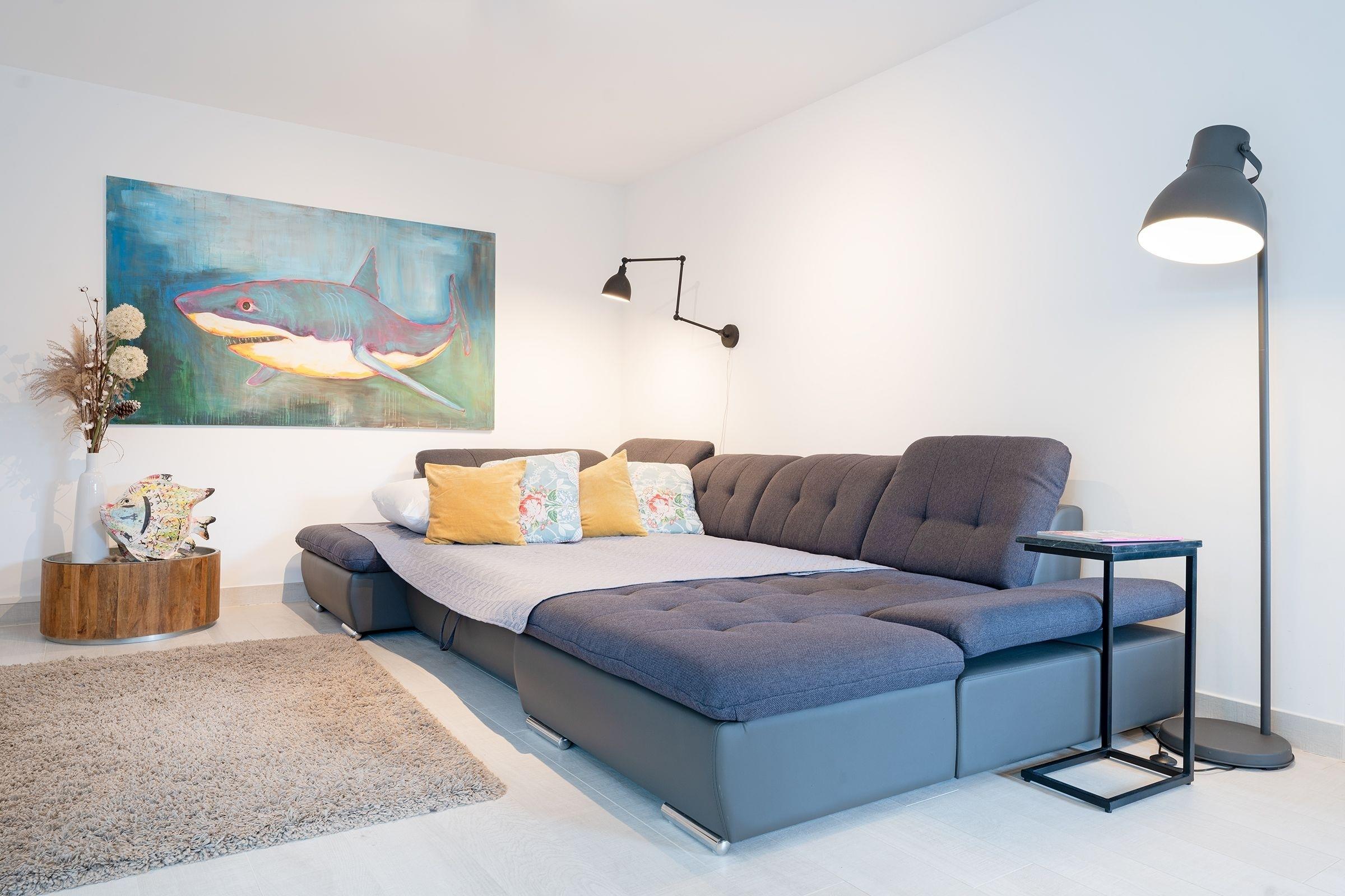 Wohnzimmer: 1 Schlafcouch (1,36 x 2,80 cm), TV, Verdunkelung: Rollo, Platz für Babybett