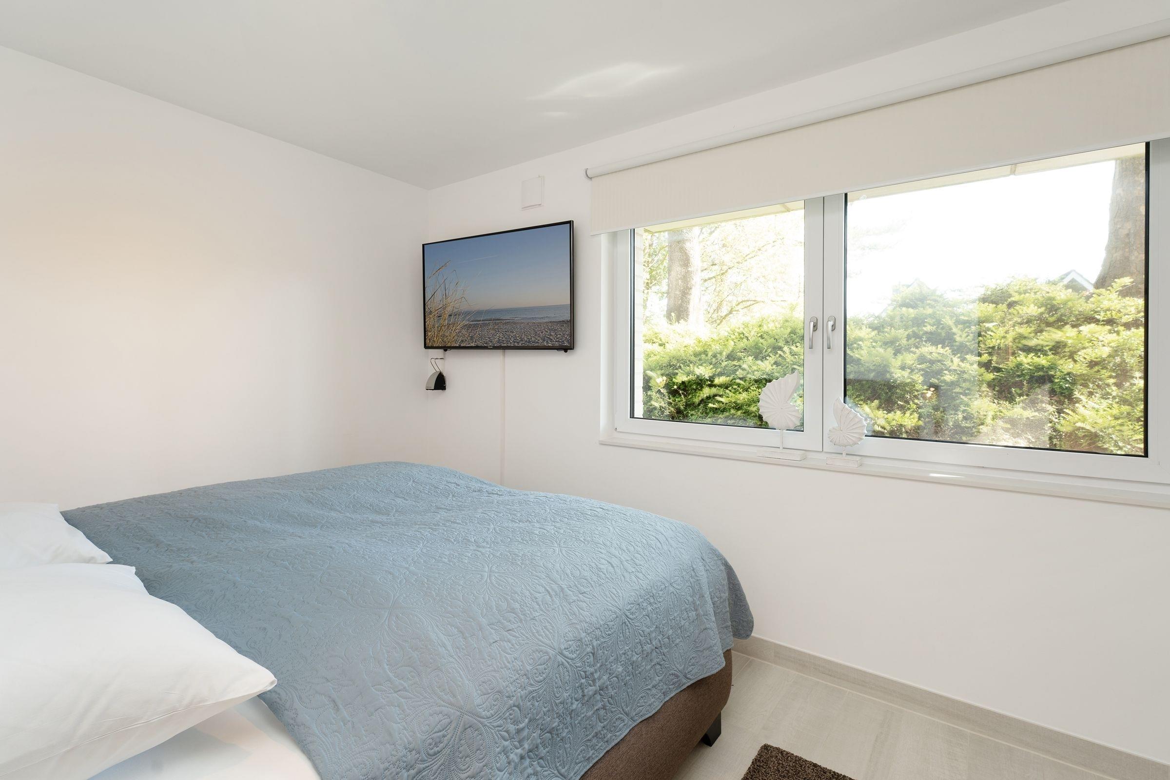 Schlafzimmer 1: 1 Boxspring-Doppelbett (200 x 220cm), Kleiderschrank, TV, Verdunkelung: Rollo, Platz für Babybett