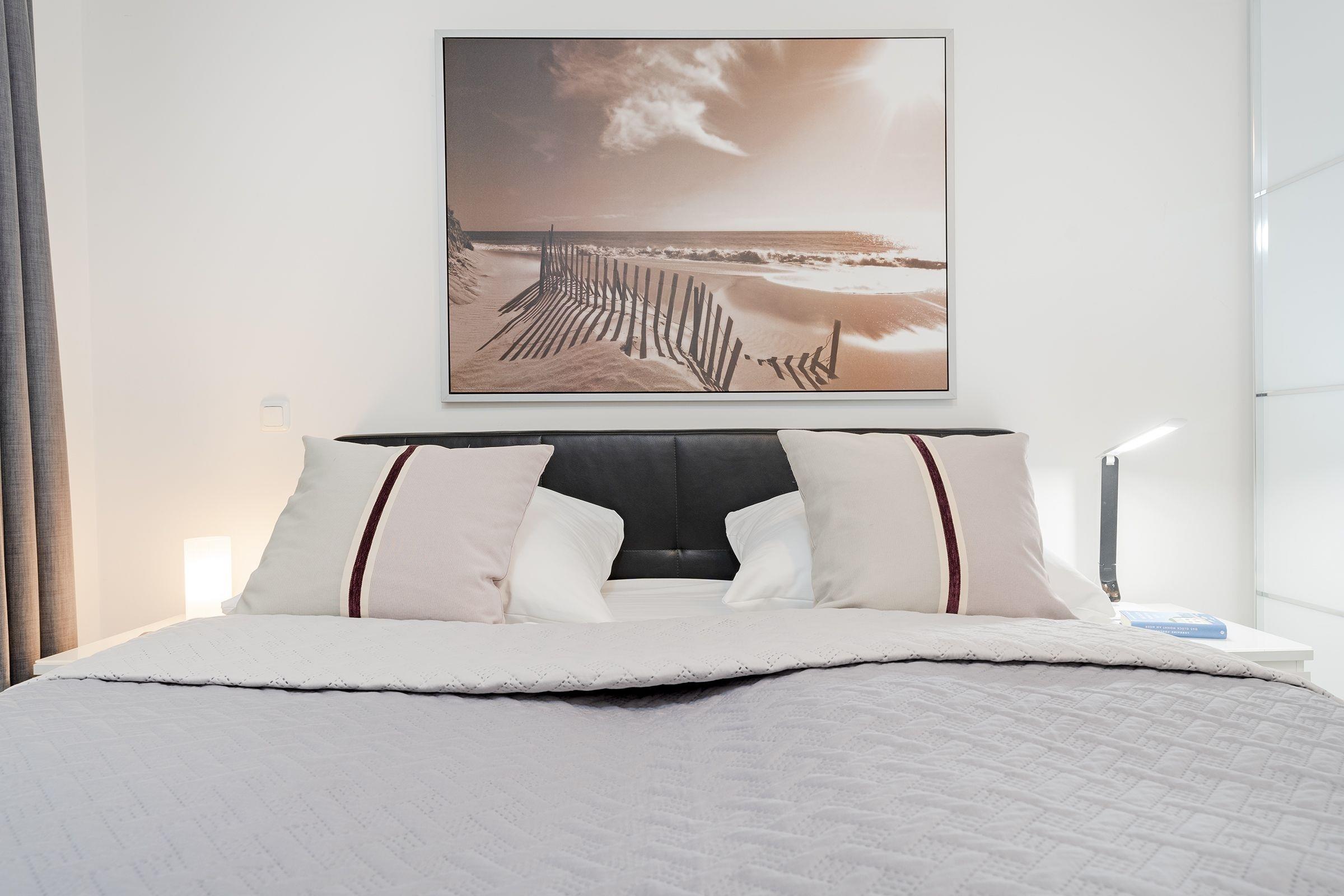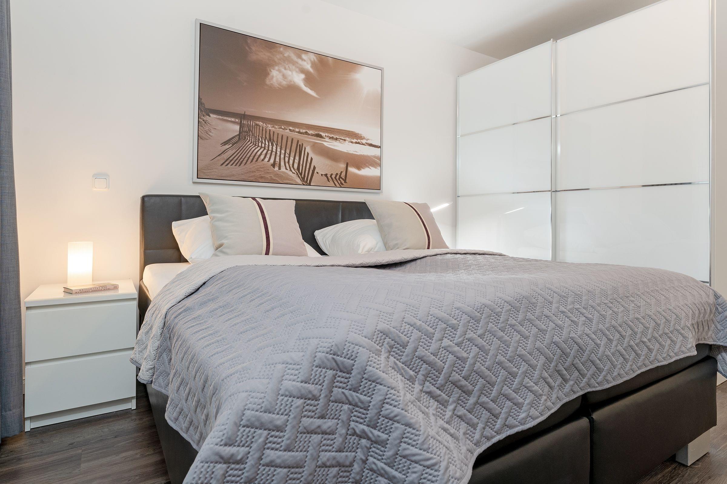 Schlafzimmer: 1 Doppelboxspringbett (180x200 cm), Kleiderschrank, TV, Verdunkelung: Gardinen, Platz für ein Babybett vorhanden