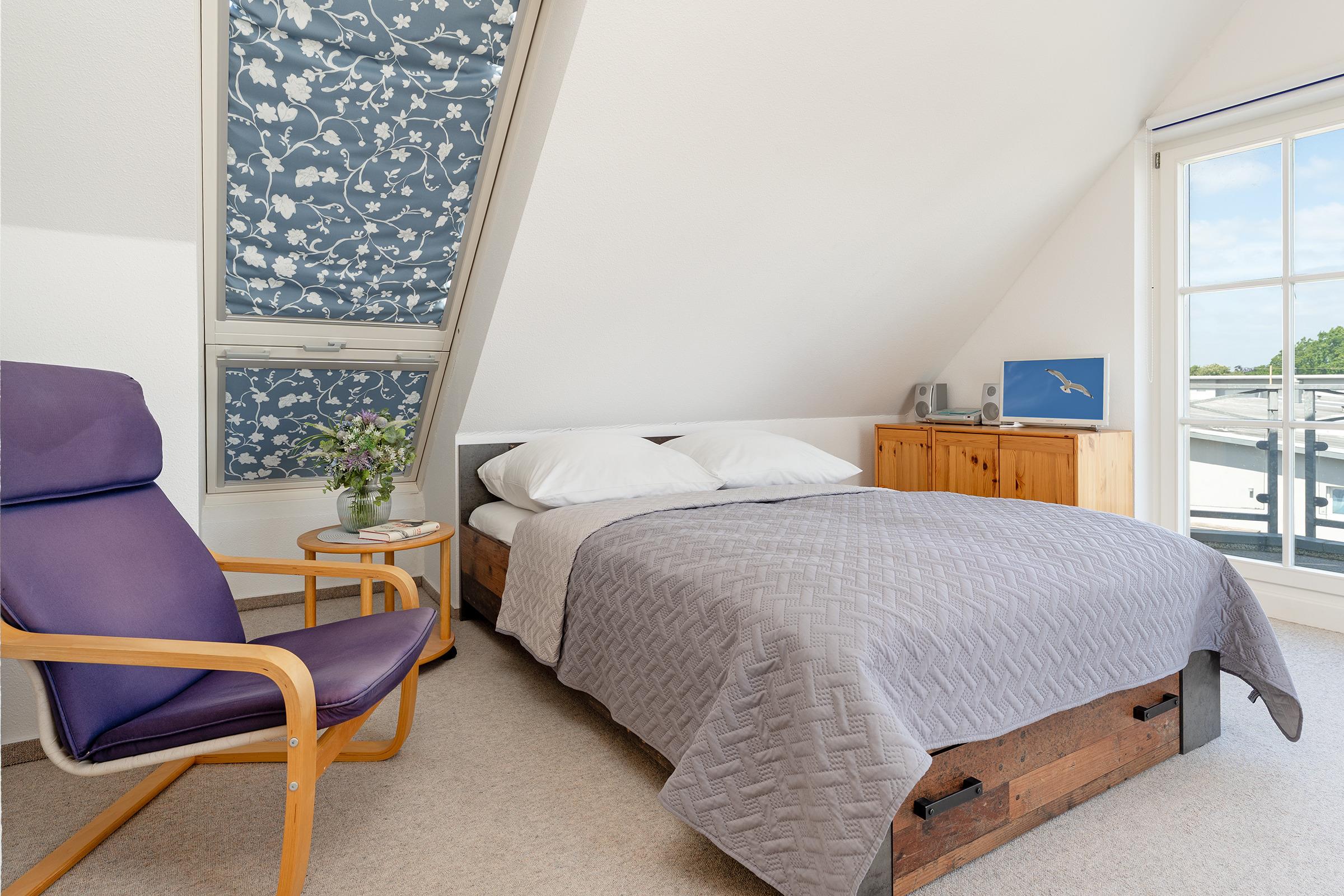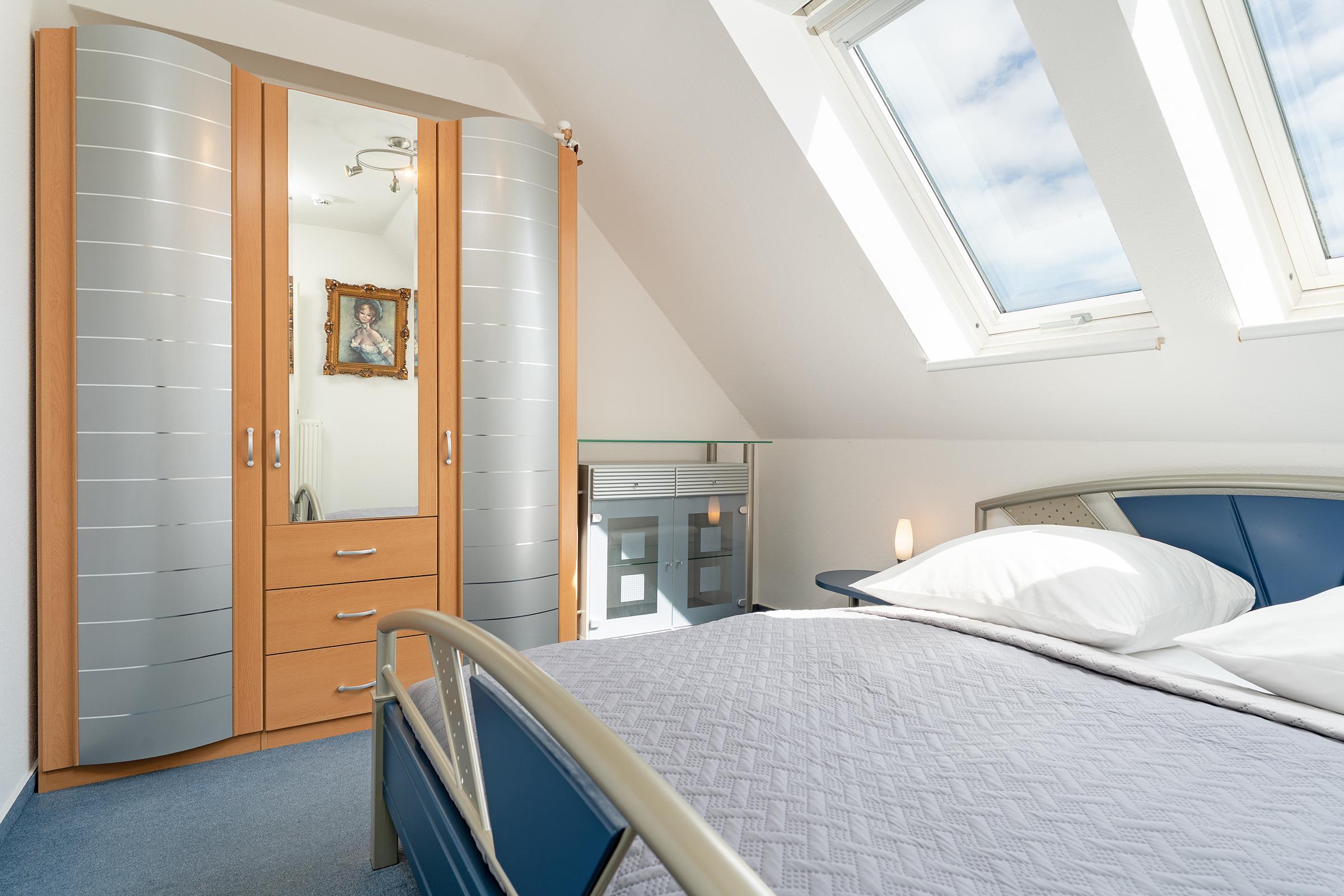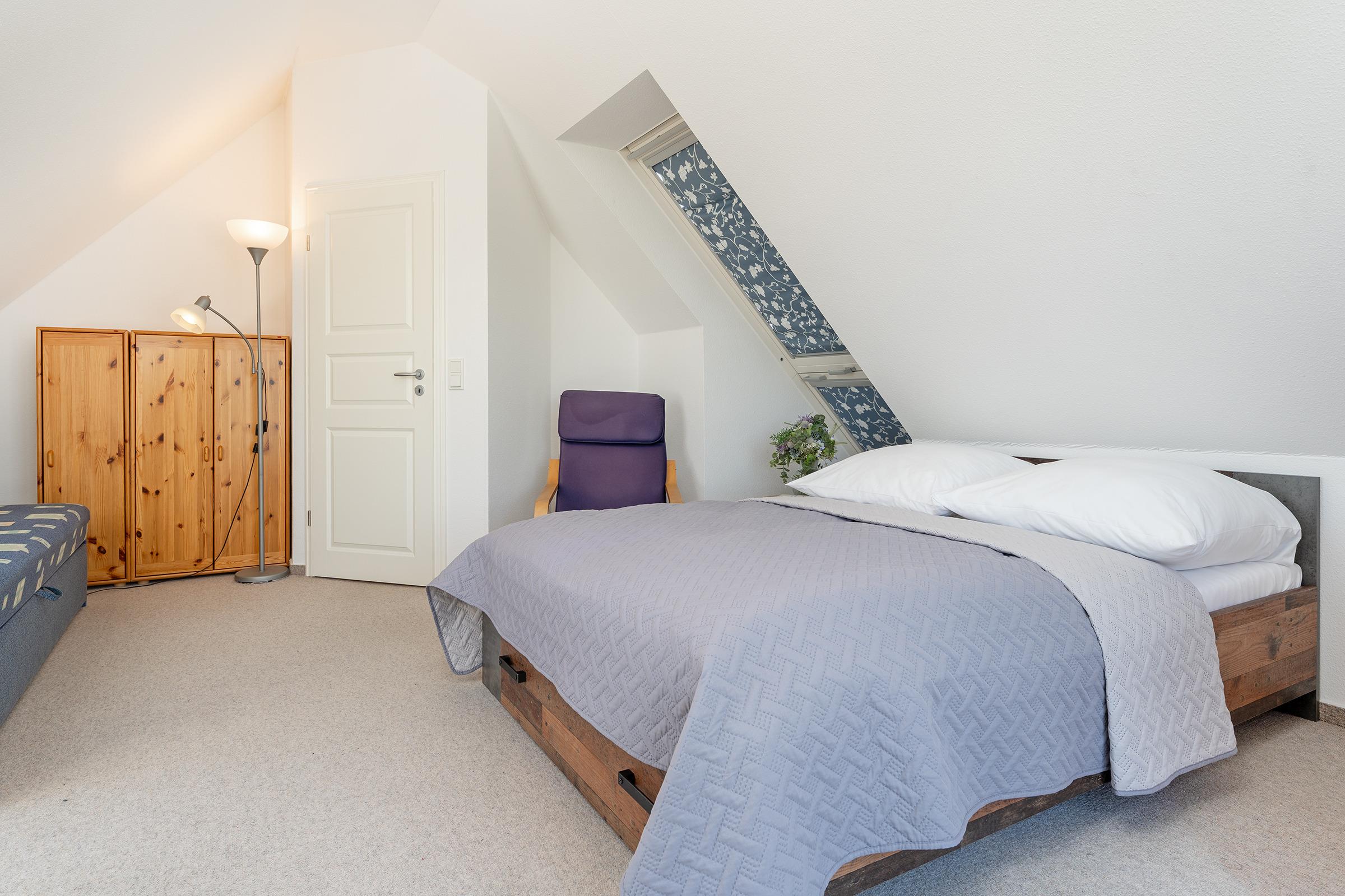 Schlafzimmer 2 (4. OG): 1 Doppelbett (180x200 cm), Kleiderschrank, Verdunkelung: Rollo, Platz für ein Babybett vorhanden
