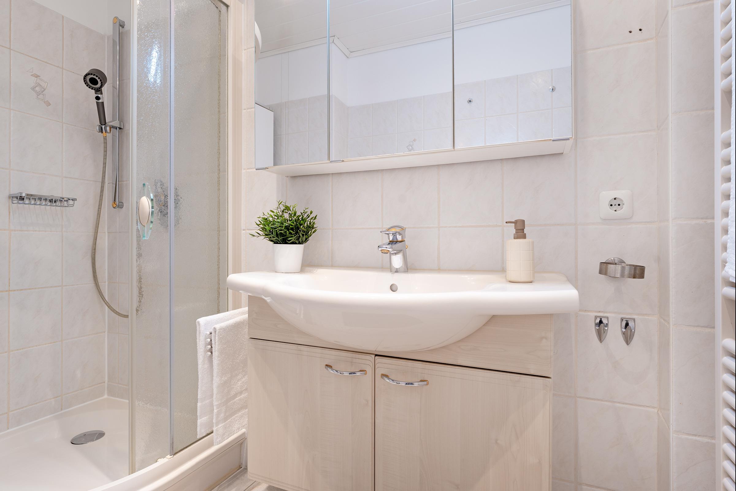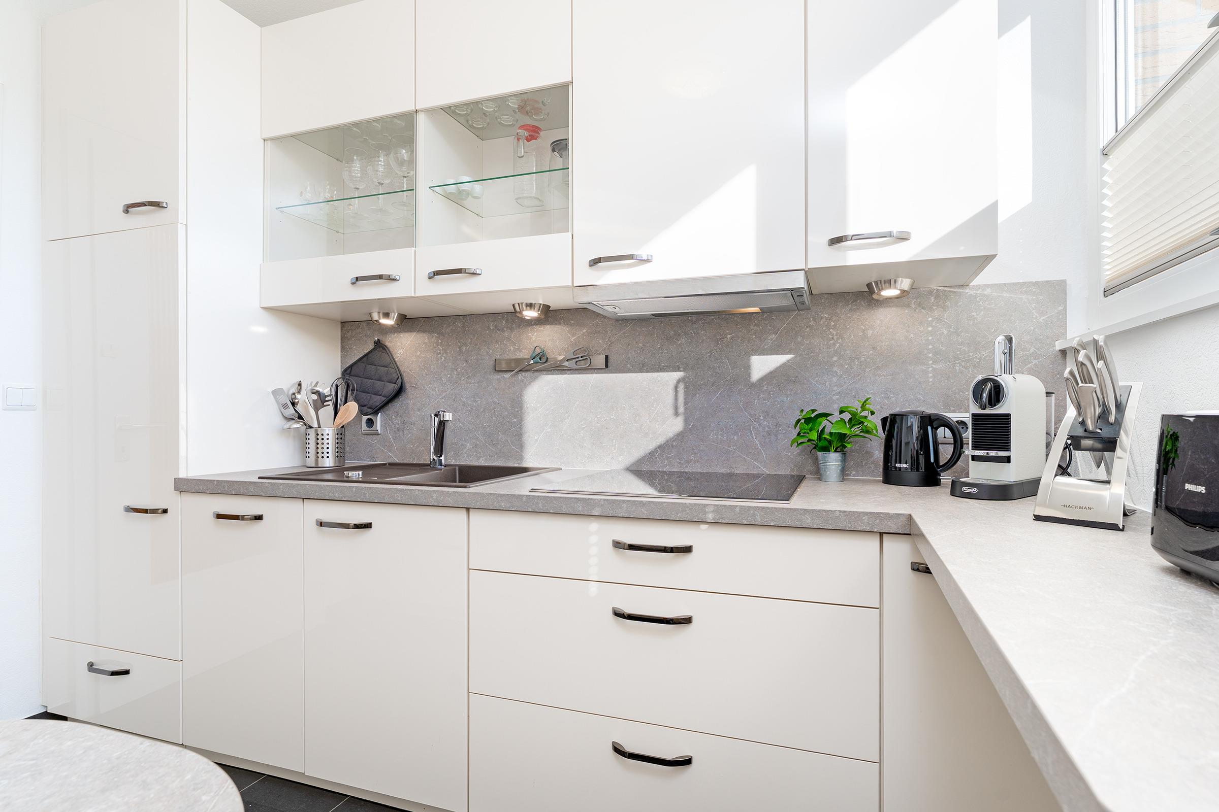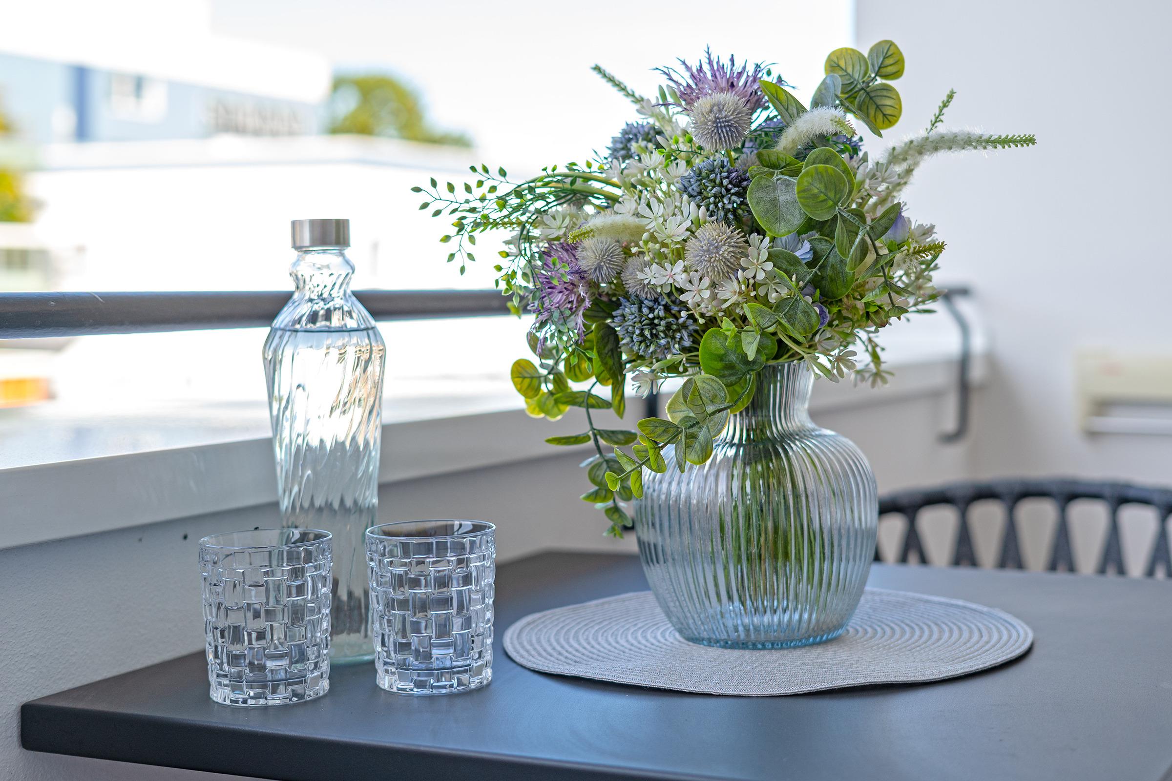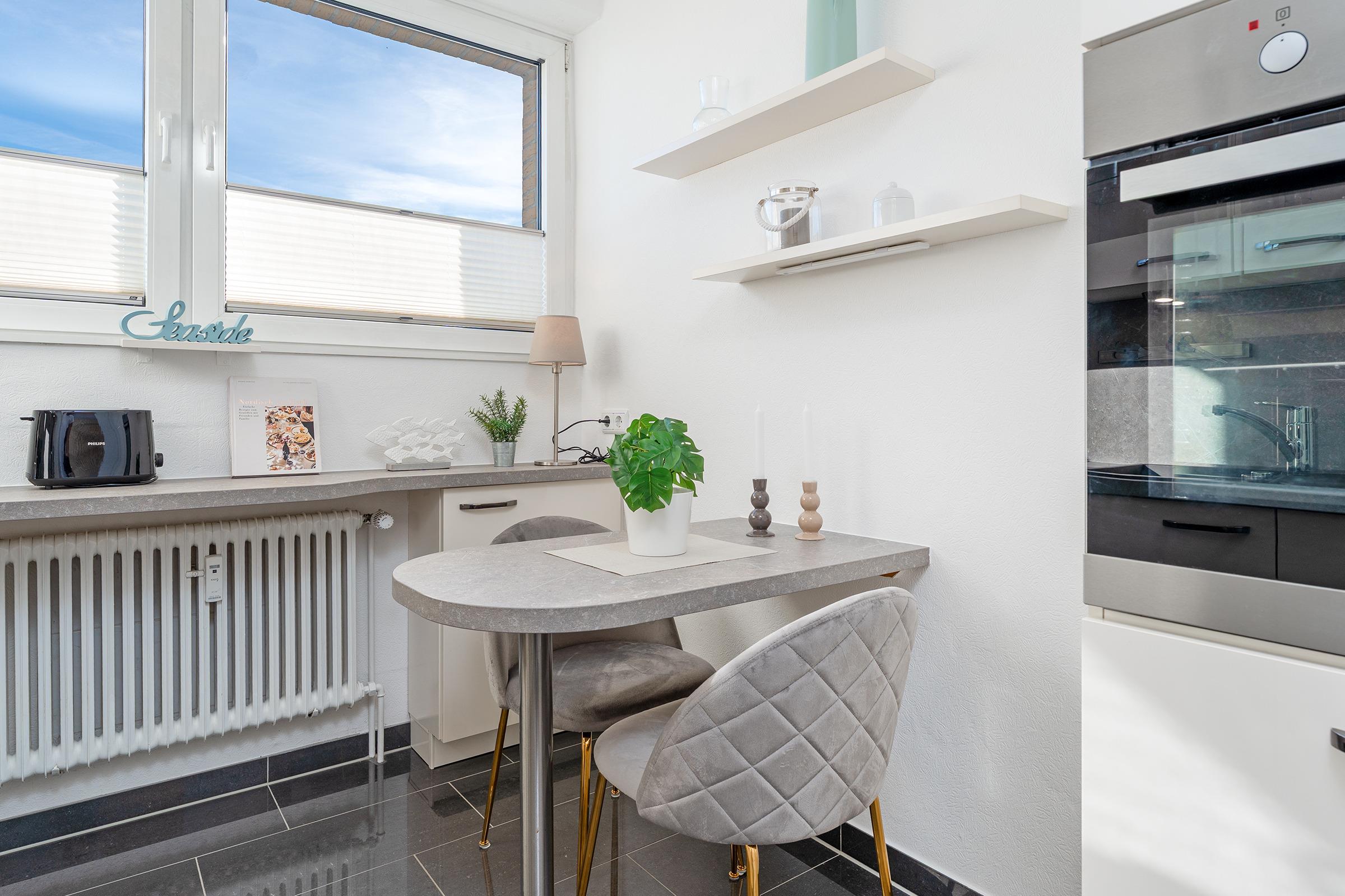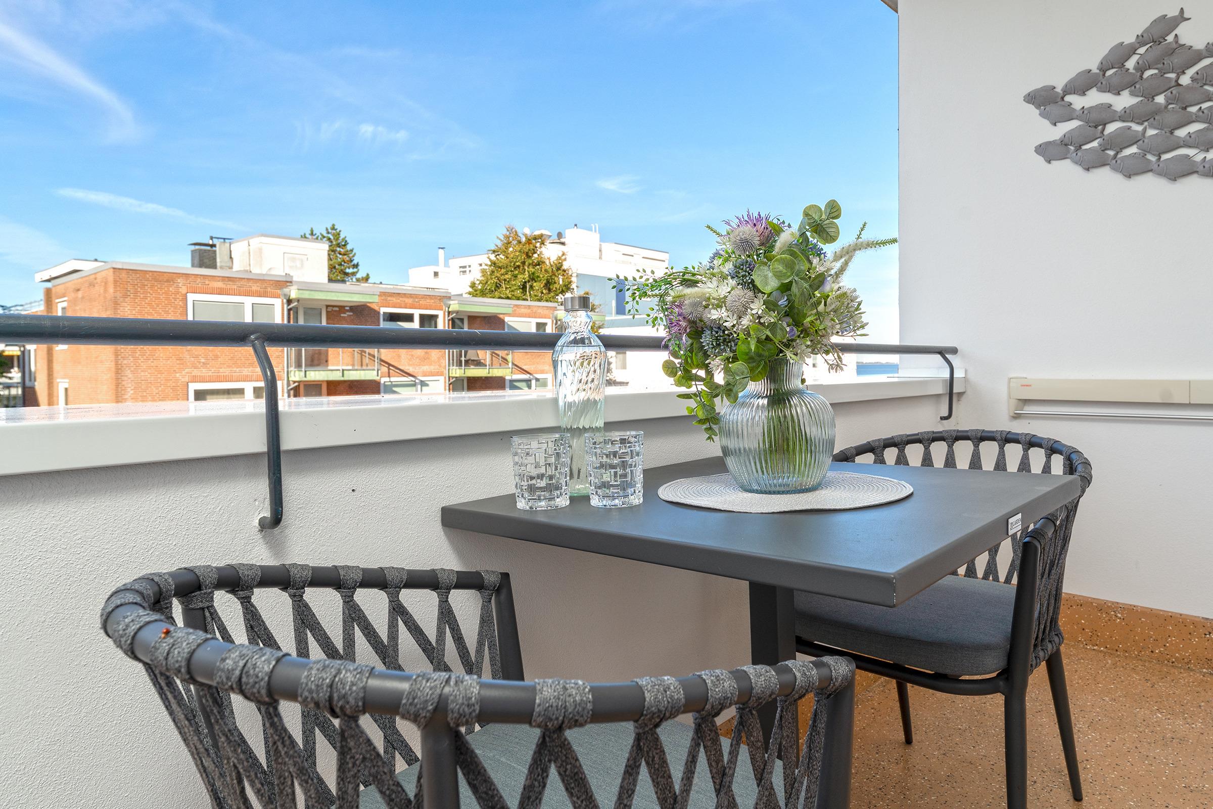 Das Herzstück dieser Wohnung bildet der helle Wohnbereich, der mit gemütlichem Mobiliar und einem Fernseher zum Verweilen einlädt. Von hier aus gelangen Sie direkt auf den Balkon, der mit Balkonmöbeln ausgestattet ist und zu entspannten Stunden im Freien einlädt. Die separate Küche verfügt über eine Küchenzeile mit Backofen, Geschirrspülmaschine, Kühlschrank mit Gefrierfach, Mikrowelle sowie Kaffeemaschine – perfekt für die Zubereitung gemeinsamer Mahlzeiten. Im Schlafzimmer sorgt ein komfortables Doppelbett für erholsame Nächte. Das Badezimmer ist mit Dusche, WC, Haartrockner sowie einem beheizbaren Handtuchhalter ausgestattet.