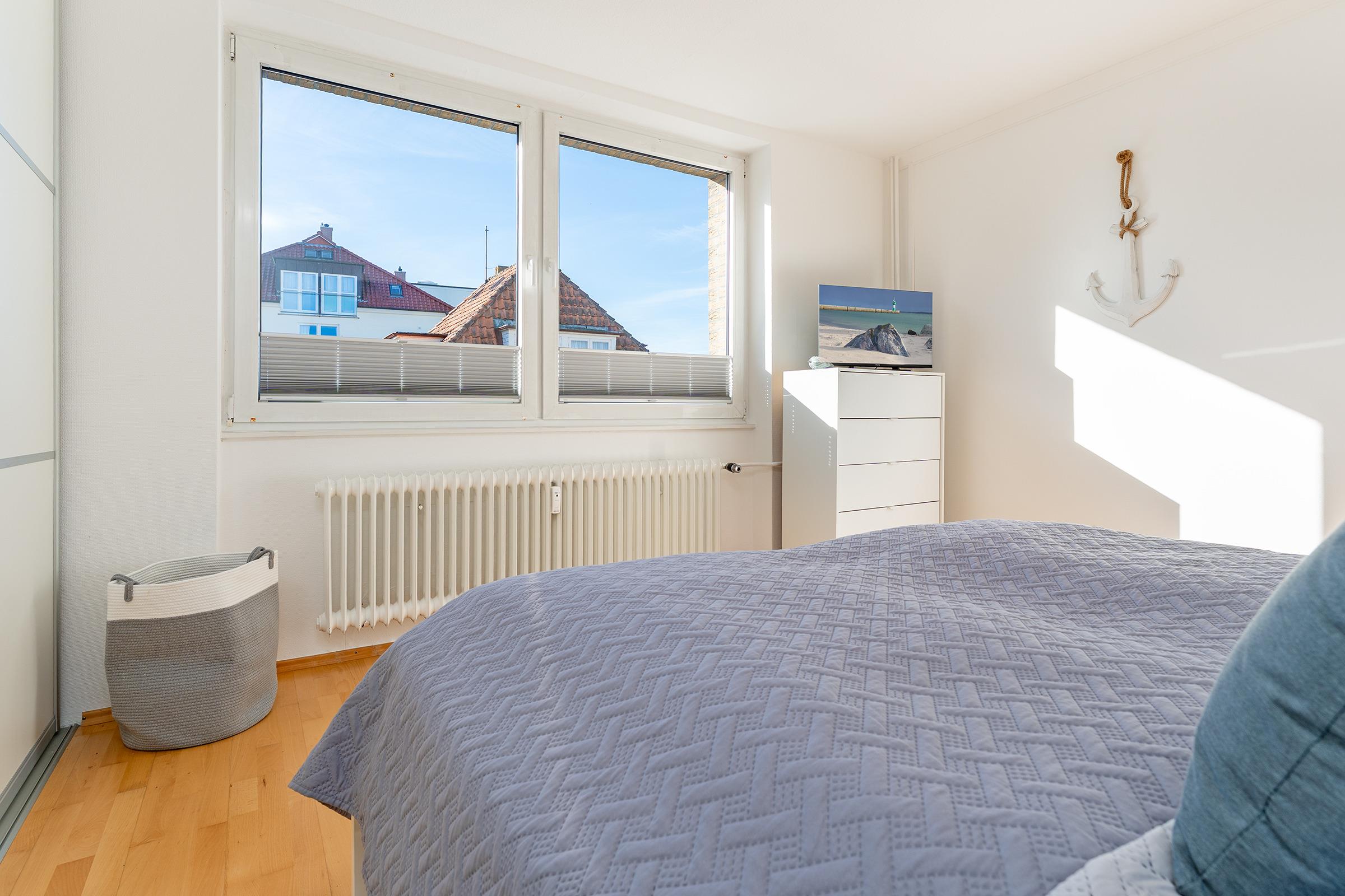 Schlafzimmer: 1 Doppelbett (2x 90x200 cm), Kleiderschrank, TV, Verdunkelung: Plissee, Platz für 1-2 Babybetten vorhanden