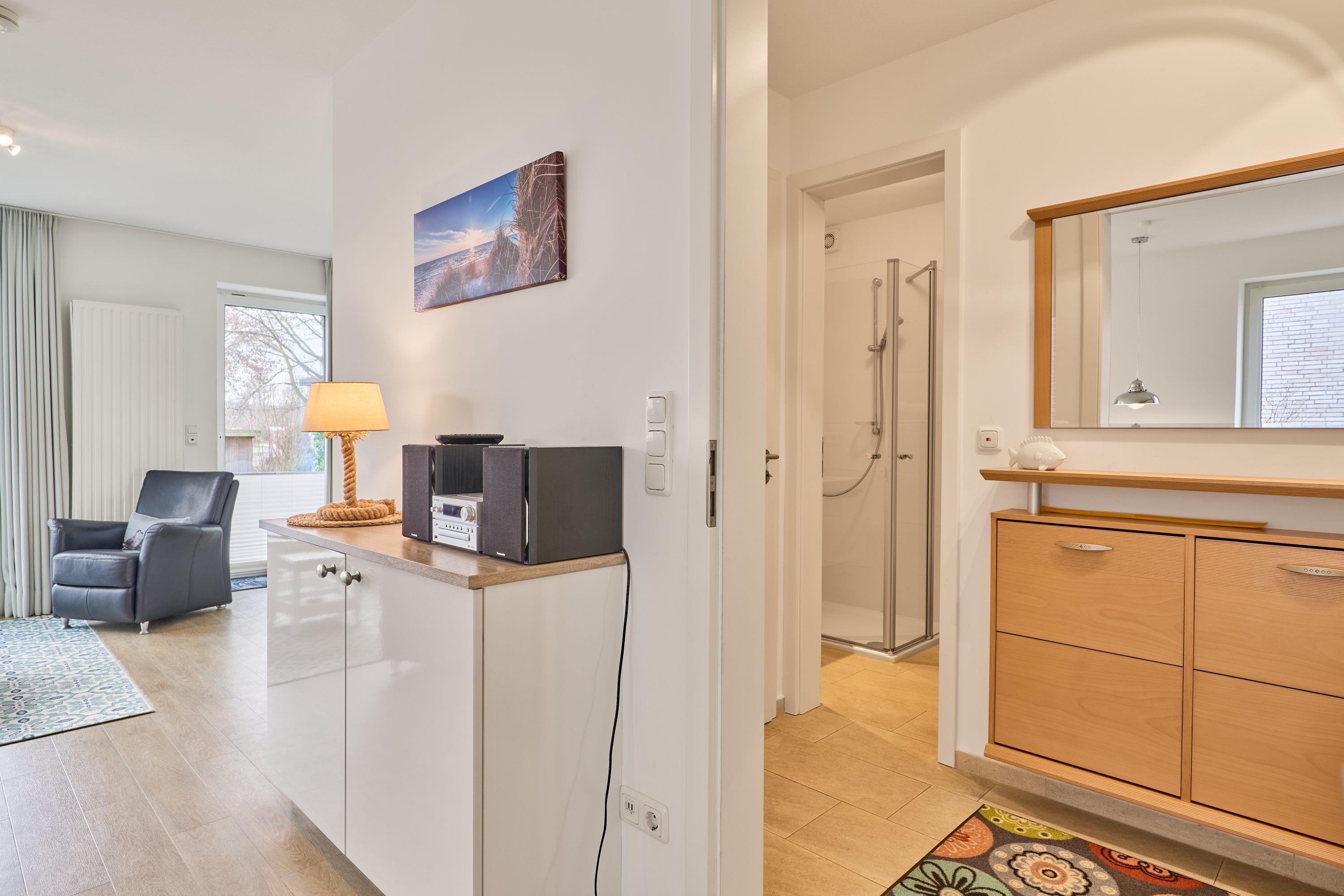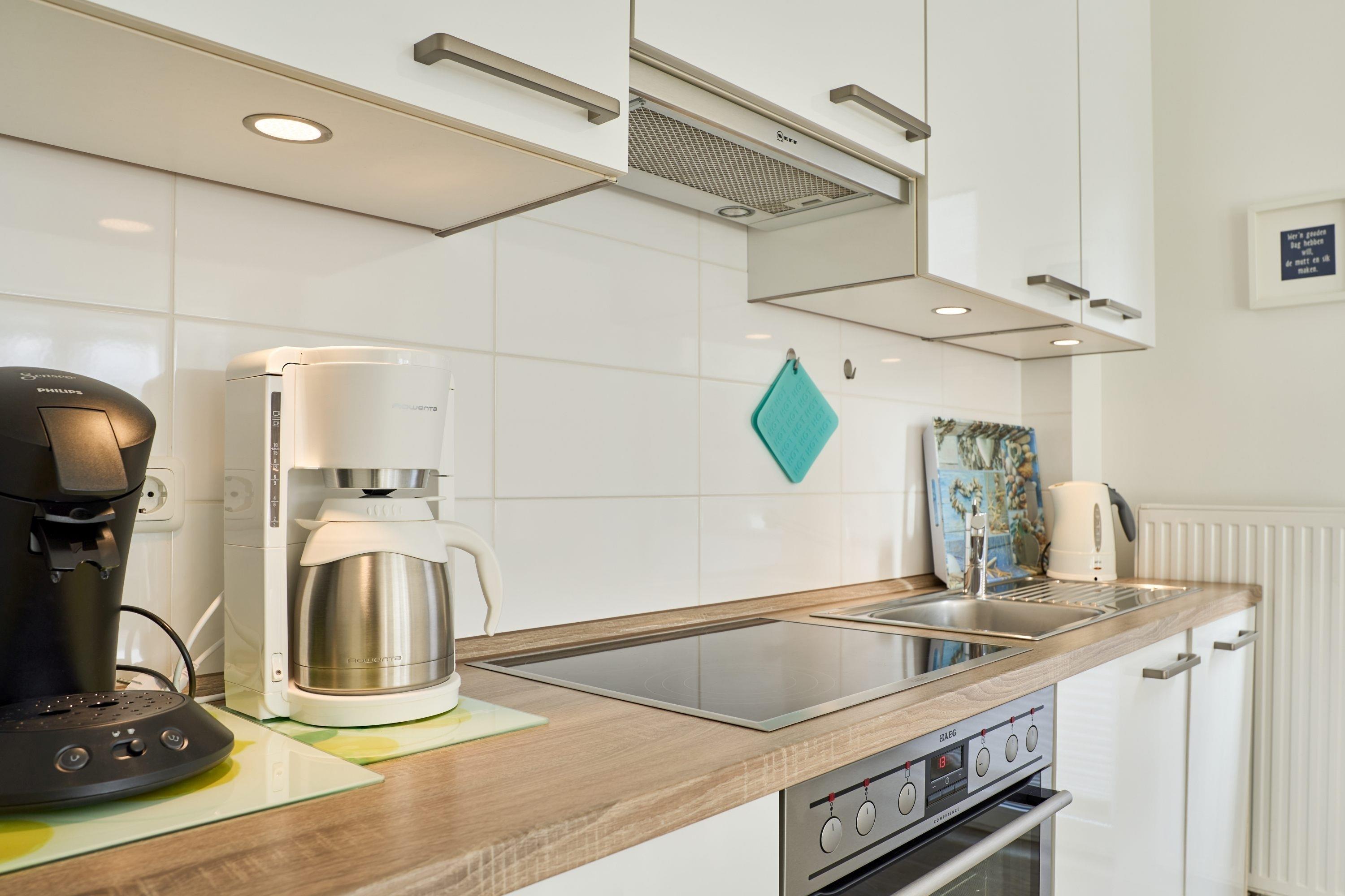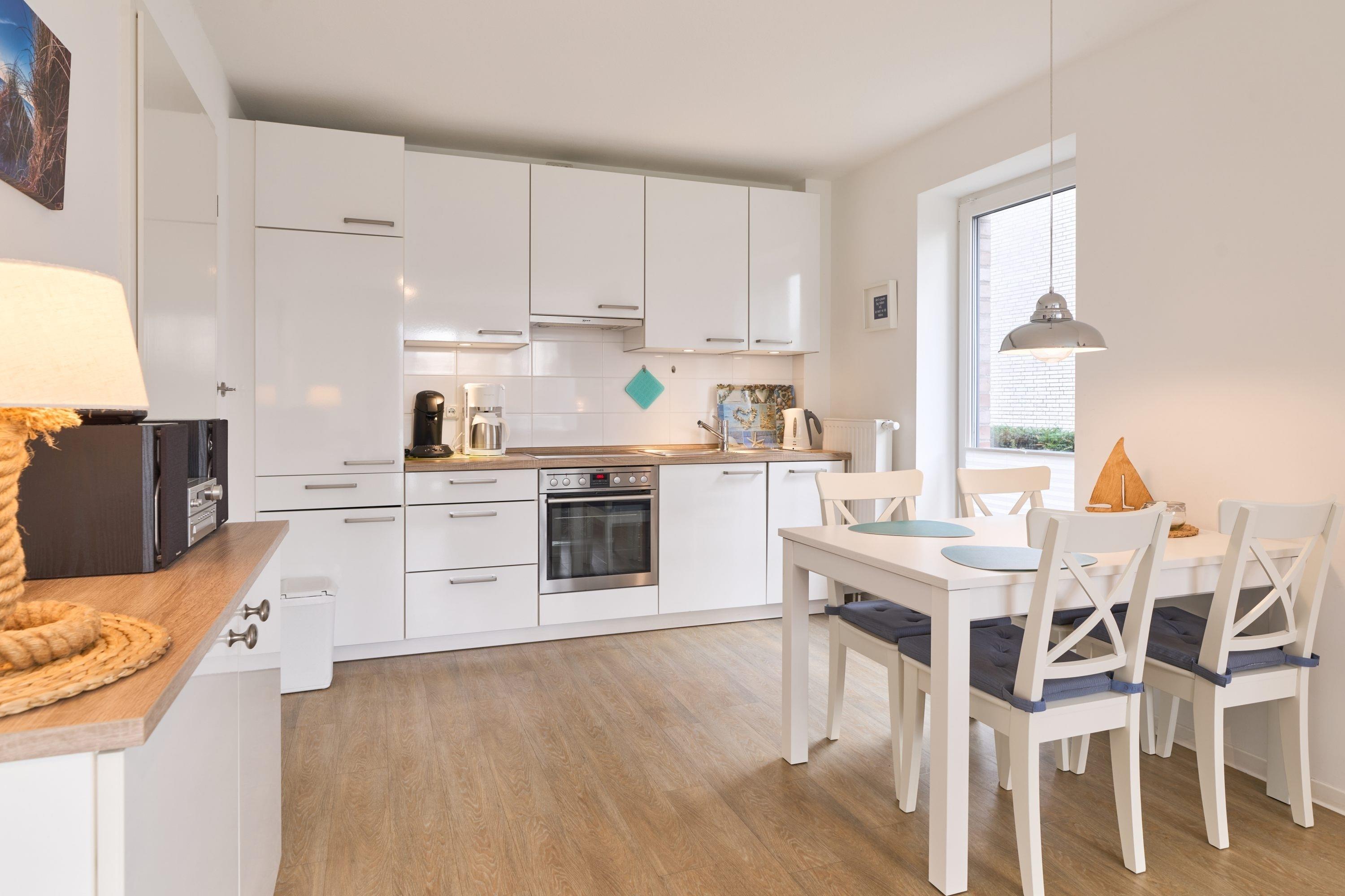 Die Ferienwohnung ist mit einer hochwertigen, offenen Küche ausgestattet, an die sich ein gemütlicher Ess- und Wohnbereich anschließt. In diesem erwarten Sie ein Fernseher, CD-Player, Bücher und Spiele. Der gemütliche Wohnbereich lädt zum Entspannen ein. Ein ausziehbares Ledersofa mit Lattenrost und Bultexmatratze, Liegefläche 1,60x2,00m bietet eine weitere Schlafgelegenheit. Der Wohn- und Essbereich bietet Ihnen genügend Platz für ein ausgiebiges Frühstück mit Blick in den Garten. Die Küche ist komplett ausgestattet. Ihnen stehen eine Filterkaffeemaschine, eine Senseo Padmaschine, ein Wasserkocher sowie ein Toaster zur Verfügung. Das Schlafzimmer verfügt über ein großes Doppelbett (1,60x2,00m) und einen geräumigen Kleiderschrank und hat ebenfalls direkten Zugang zur großzügigen Terrasse mit Strandkorb und Sonnenschirm. Das Badezimmer verfügt über eine bodentiefe Dusche, Fußbodenheizung sowie einen Handtuchheizkörper. In dem Abstellraum befindet sich eine Waschmaschine. Selbstverständlich steht Ihnen auch in dieser Wohnung kostenloses WLAN zur Verfügung.