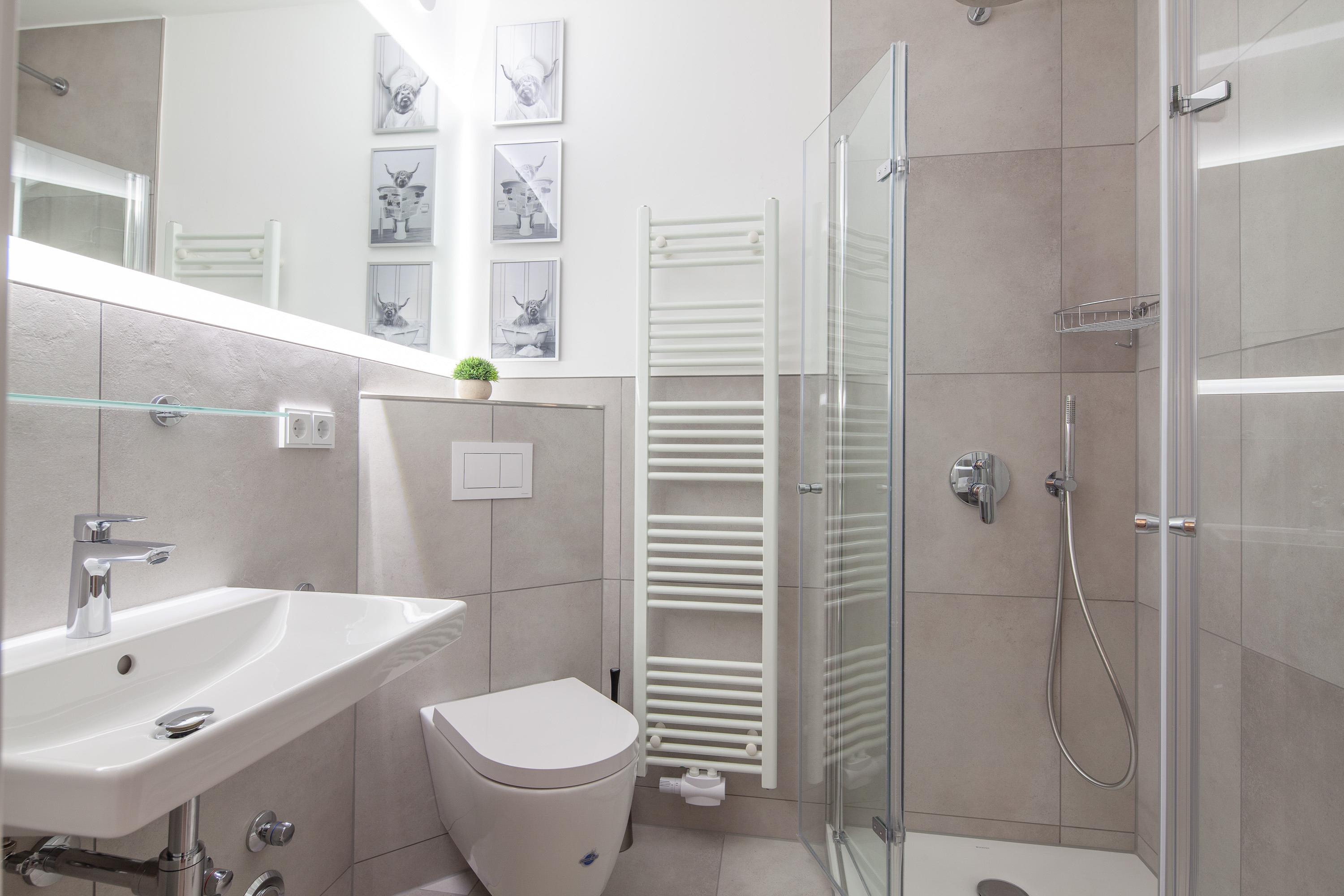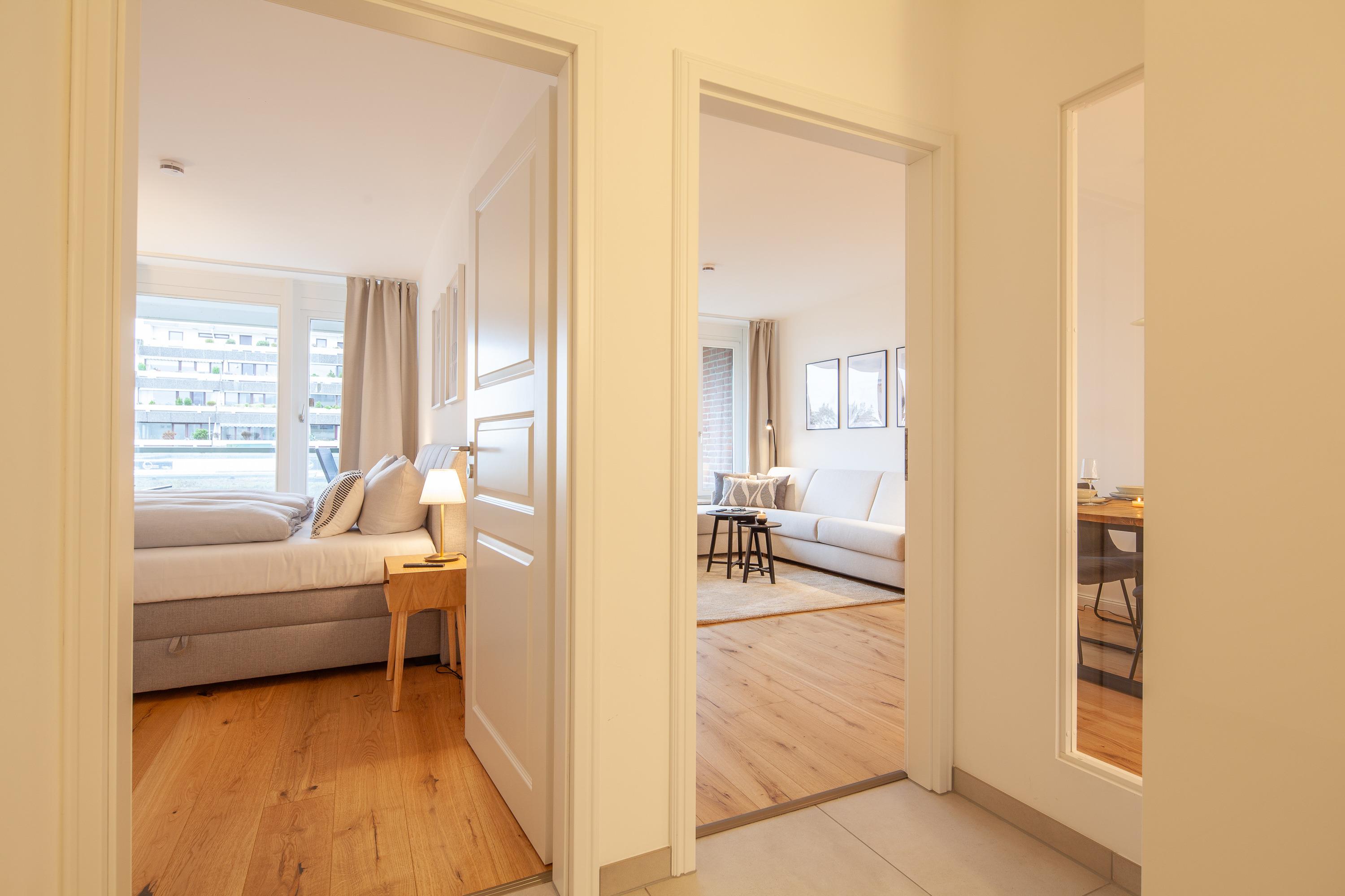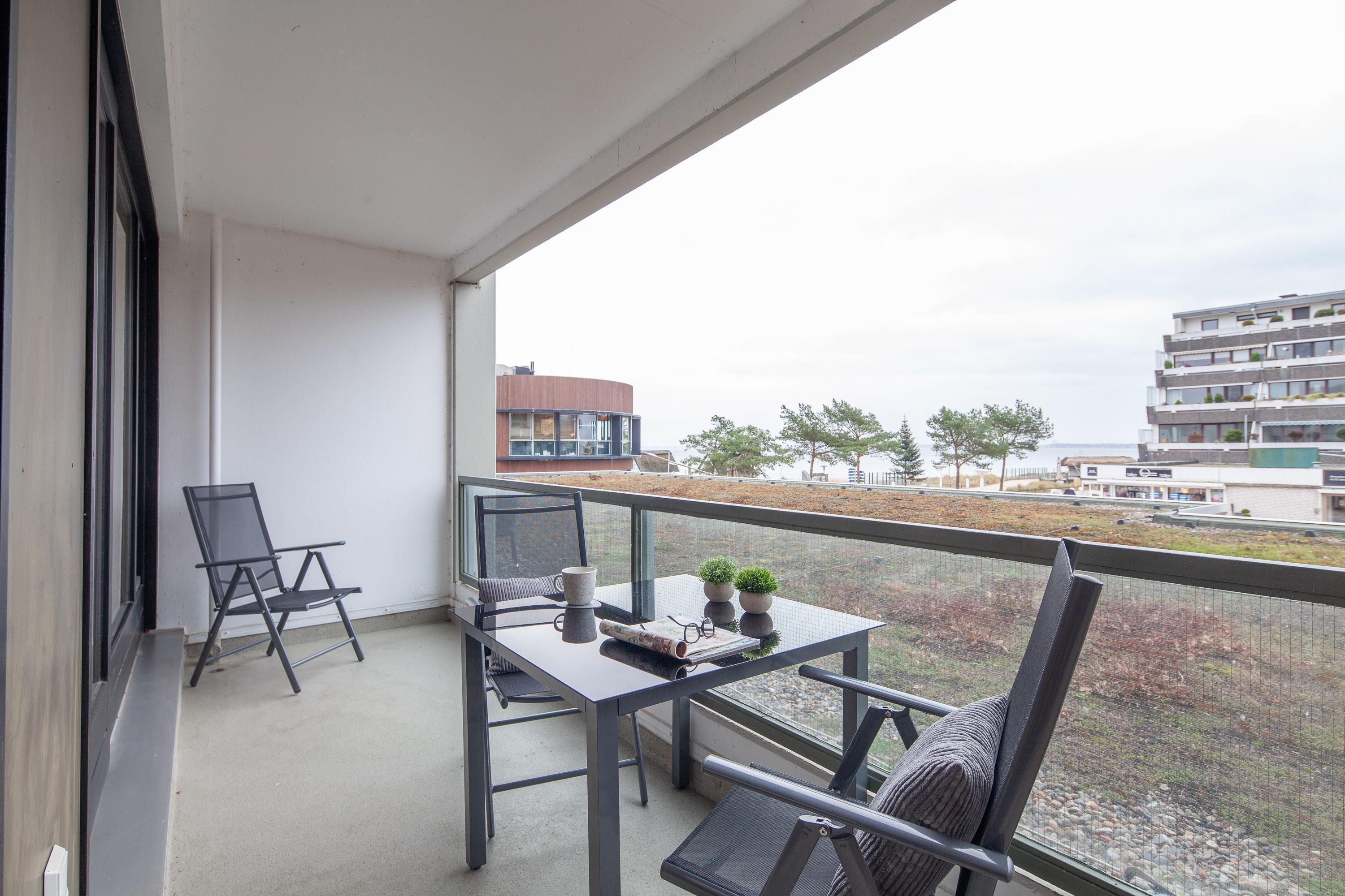 Der helle Wohn-Essbereich ist mit einer großen Sofaecke eingerichtet. Mit wenigen Handgriffen lässt diese sich in ein Schlafsofa umfunktionieren. Neben dem Flachbildfernseher (50 Zoll HD +) mit Smart-Funktion steht Ihnen selbstverständlich kostenloses W-LAN zur Verfügung. Die Küche ist komplett ausgestattet und verfügt über eine Filterkaffee-Maschine sowie eine Nespresso-Maschine. Der gemütliche Wohn-/Essbereich lädt zu idyllischem Beisammensein und gemeinsamer Zeit ein. Der Balkon ( Süden ) mit seitlichen Blick auf die schöne Ostsee ist windgeschützt und möbliert. Im Schlafzimmer erwartet Sie ein bequemes Boxspringbett (1,80x2,00m), ein Smart-Flachbildfernseher (43 Zoll) und ebenfalls ein seitlicher, traumhafter Meerblick. Das Duschbad verfügt über einen Handtuchheizkörper. Eine Waschmaschine und ein Wäschetrockner befinden sich im Gemeinschaftskeller.