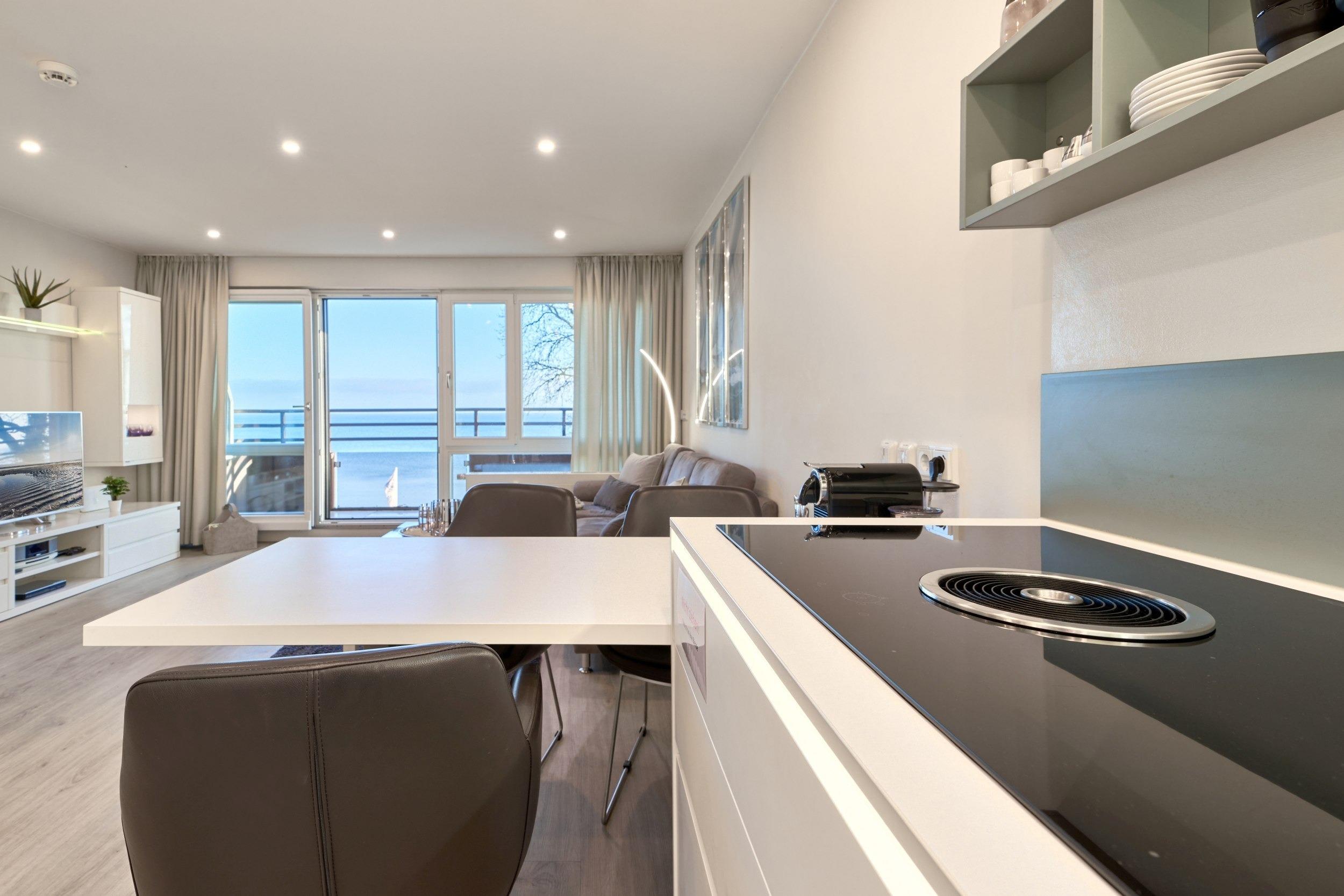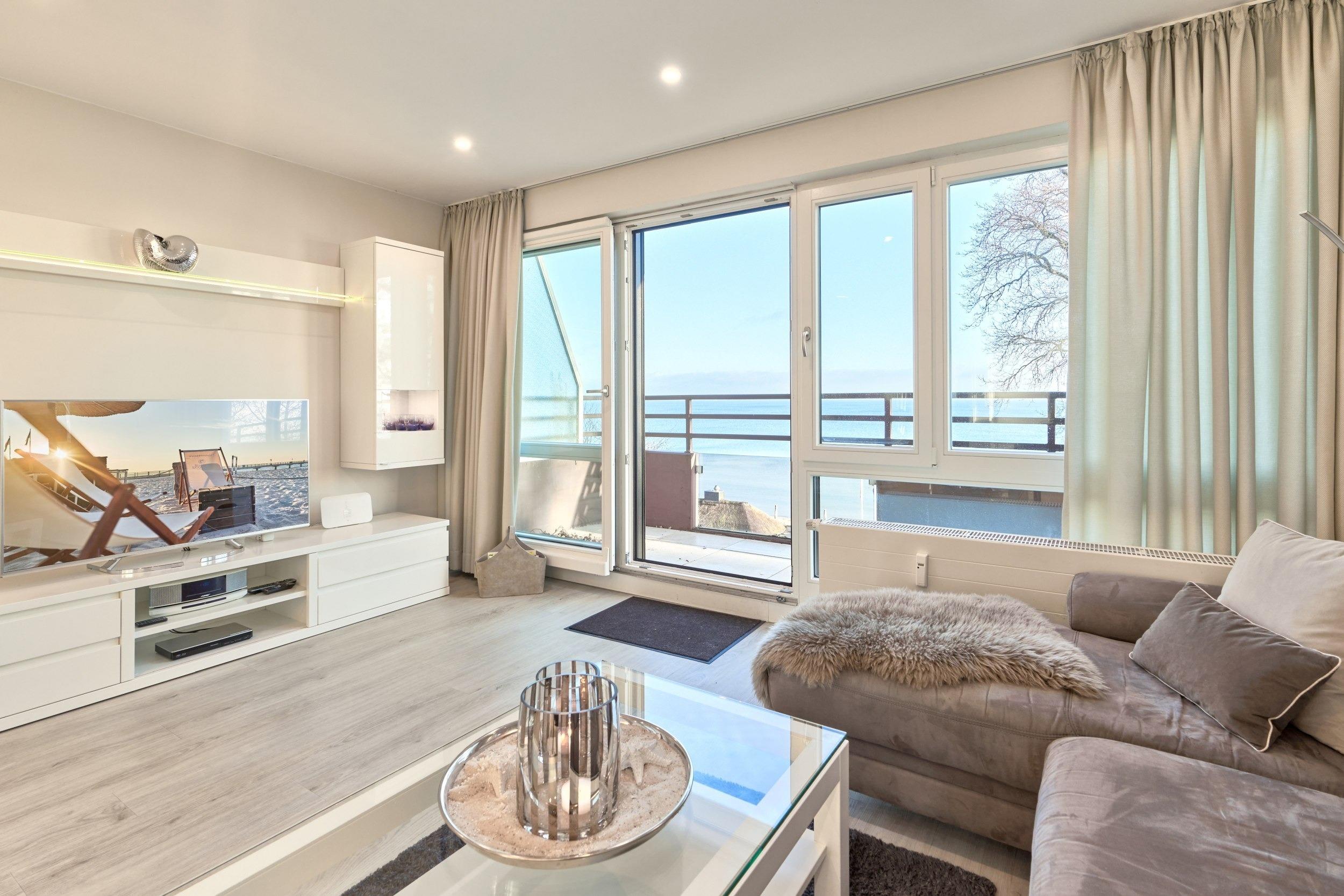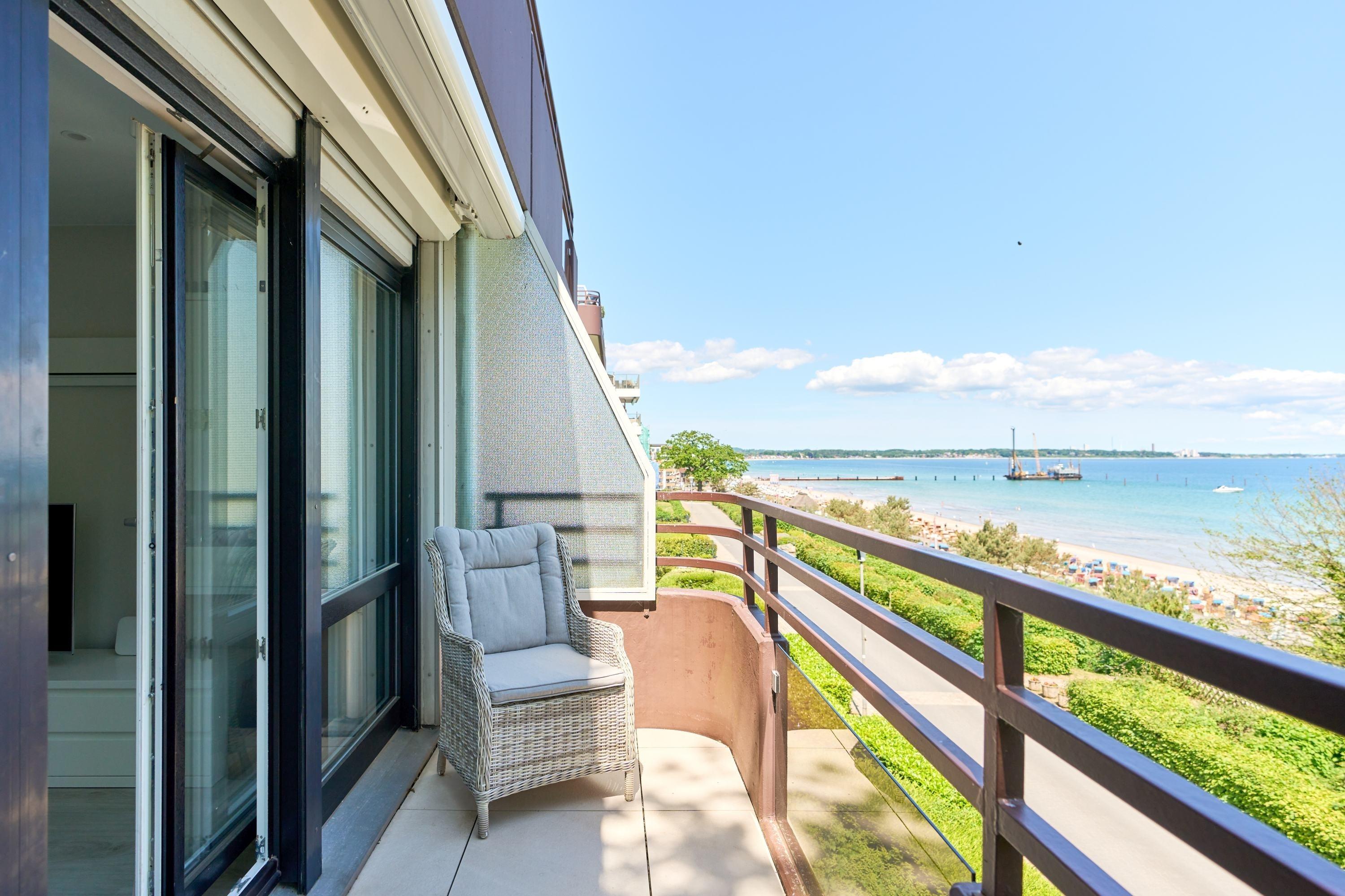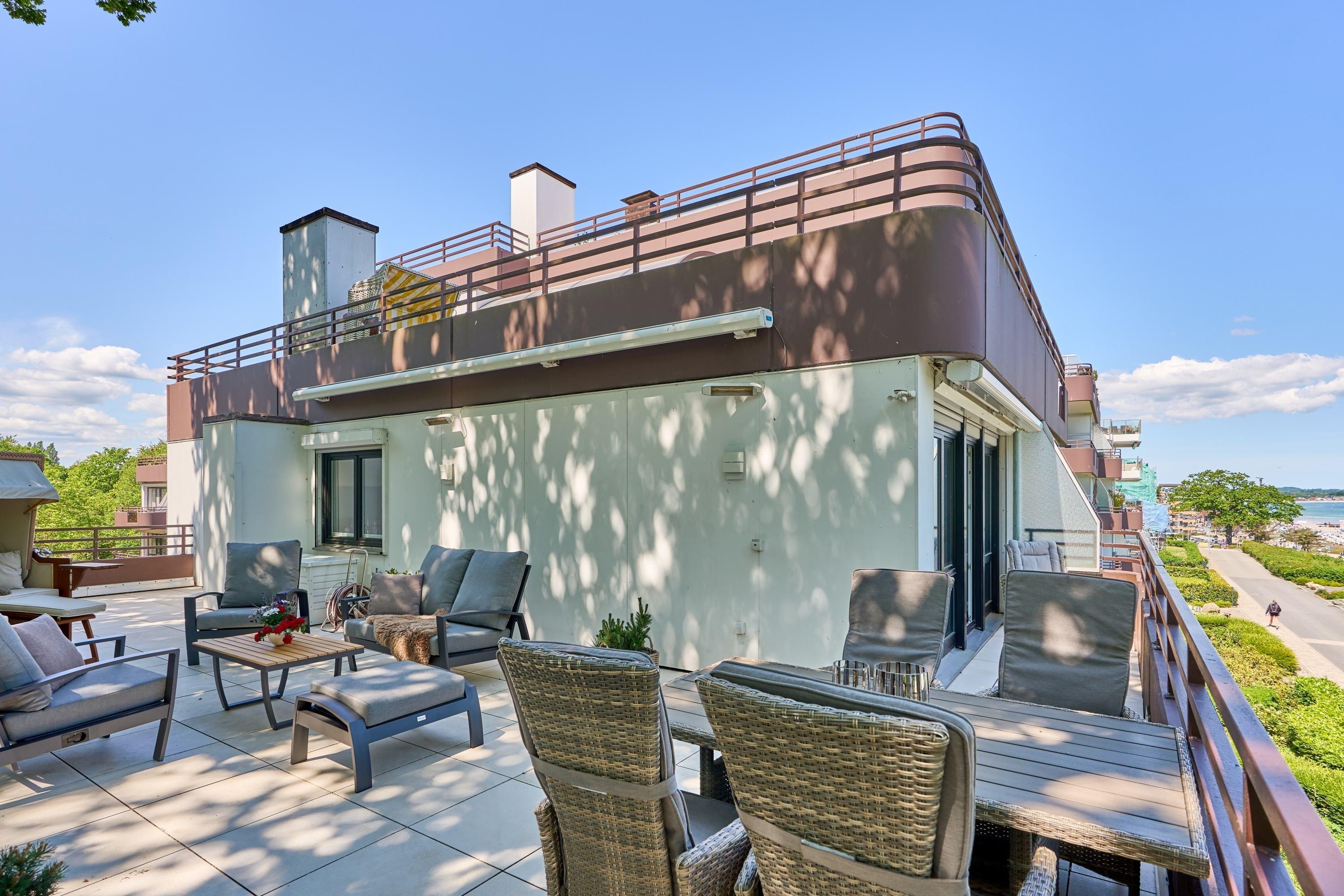 Von dem Eingangsbereich mit einer Garderobe geht es über in den großzügigen Wohnbereich (Schlafsessel 0,90 x 2,00m). Hier finden Sie auch die moderne, offene sowie voll ausgestattete Einbauküche. Durch zwei große Panoramafenster können Sie hier den Blick auf die Ostsee und die gesamte Lübecker Bucht genießen. Die 55 m² große, sonnige Dachterrasse ist mit einem XXL-Strandkorb, Markisen und Terrassenmöbeln bestückt und lädt zum Verweilen ein. Das Schlafzimmer verfügt über ein bequemes Bett in 1,80 x 2,00m mit verstellbaren Lattenrosten und einen Einbauschrank sowie einen SAT-Fernseher. Das helle, sehr ansprechende Badezimmer ist sehr hochwertig ausgestattet. Lassen Sie sich von der Wellness-Dusche und der elektrischen Fußbodenheizung sowie dem Bad-Radio verwöhnen. Selbstverständlich stehen Ihnen ein Föhn und ein beleuchteter Kosmetikspiegel zur Verfügung. In der Saison (15.05. – 15.09.) steht für Sie am Strand kostenfrei ein Strandkorb bereit.
