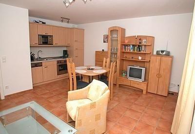 Das liebevoll eingerichtete ca. 50 qm große 2-Zimmer-Appartement befindet sich im 1. Obergeschoss zur Sonnenseite. Es hat einen schönen großen Balkon, einen hellen, sonnendurchfluteten Wohnraum mit Fliesenboden und einem Polstersofa, welches auch als Schlafsofa umwandelbar ist. Daneben zwei Sessel, ein Couchtisch, ein Flatscreen-TV, sowie eine moderne, integrierte Einbauküche mit Geschirrspüler und Mikrowelle, direkt daneben befindet sich ein gemütlicher Essbereich. Im Schlafraum steht ein Doppelbett (2 x 90iger Matratzen) mit einem Nachttisch und ein großer Kleiderschrank mit ausreichendem Stauraum. Im Eingangsbereich befindet sich die Garderobe. Das Duschbad ist hell gefliest und verfügt über eine Eckdusche, WC und einen Handtuchwärmer. Für die kleinen Gäste steht ein Reisebett und ein Hochstuhl zur Verfügung.