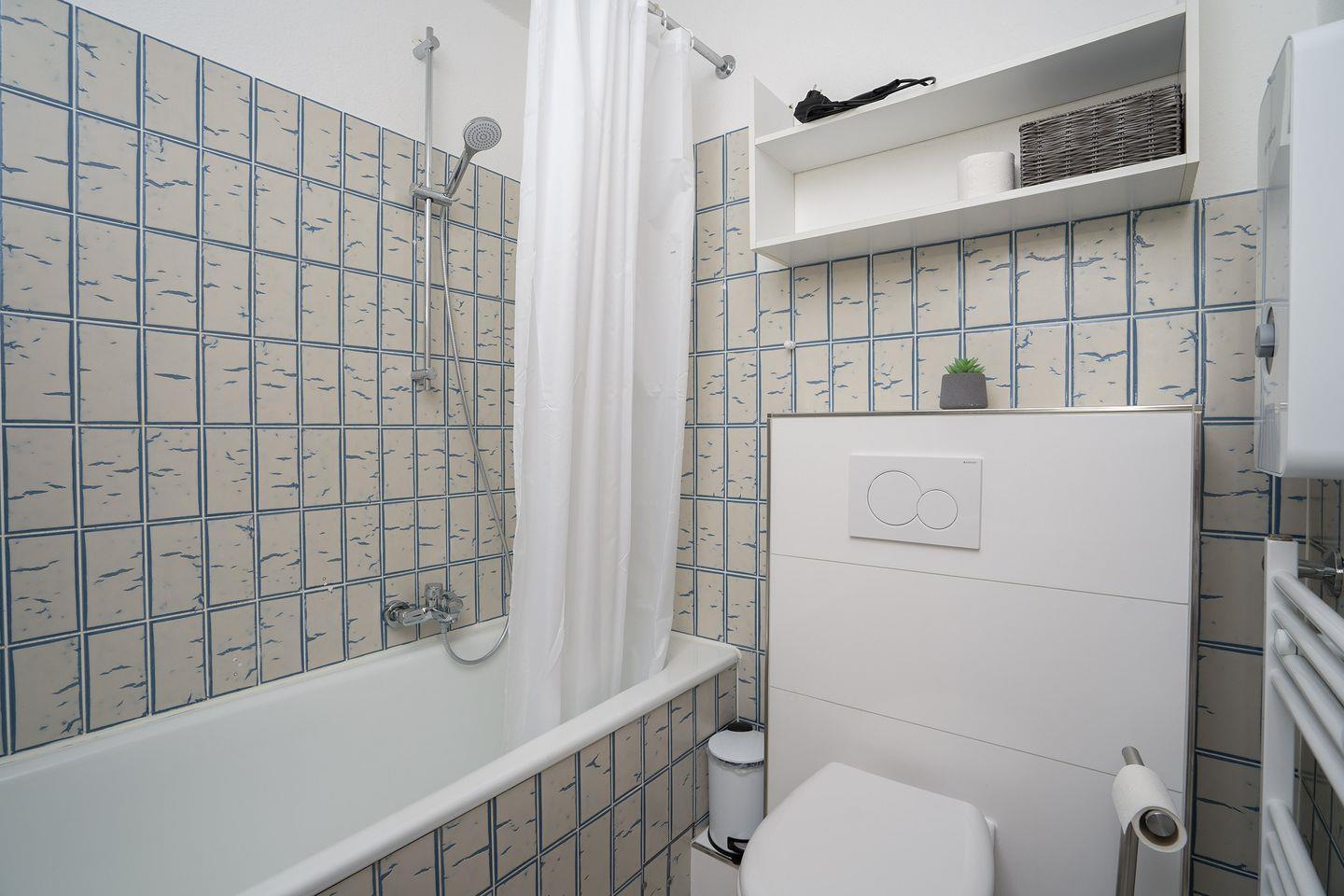 Das Badezimmer mit Badewanne, Waschtisch und WC machen die Wohnung komplett.