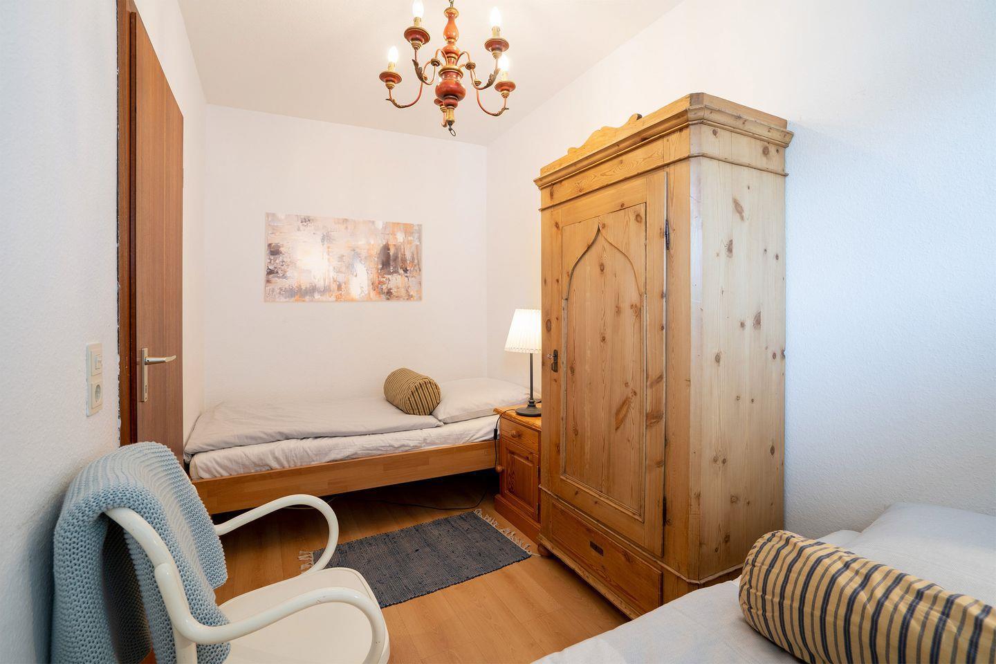 In einem Schlafzimmer steht ein Doppelbett mit Einzelmatratzen, das andere kleinere Schlafzimmer ist mit zwei Einzelbetten und einem großen Kleiderschrank ausgestattet.