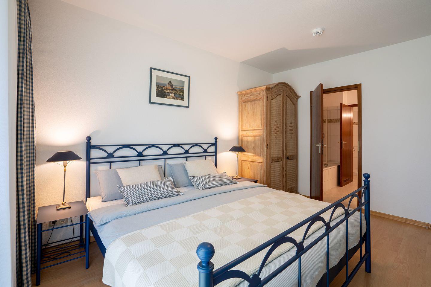Das geräumige Schlafzimmer ist mit einem Doppelbett (2 x 90 cm x 200 cm), Kleiderschrank und einem 32“ Flachbild-TV ausgestattet. WLAN ist kostenfrei nutzbar (bei Störung kein Ersatzanspruch).