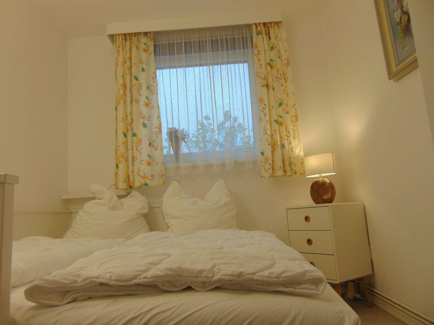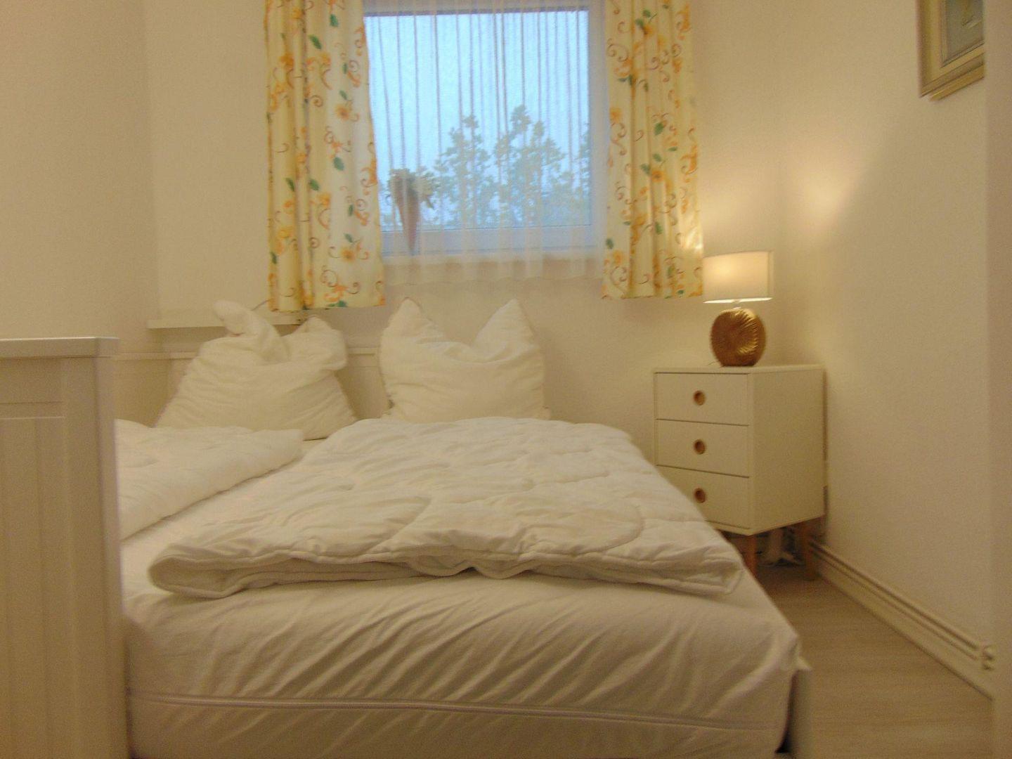 Hier wird der Urlaub zu einem schönen Erlebnis. Das gemütliche und liebevoll eingerichtete, ca. 40 m 2 große 2- Raum-Apartment im 2. OG verfügt über einen hellen und gemütlichen Wohnraum mit integriertem Essplatz. Es ist eine Polstergarnitur vorhanden, welche zur Schlafcouch umwandelbar ist. Um gemütliche Abende zu verbringen, steht Ihnen ein Flachbild-TV, DVD-Player und eine HiFi-Anlage mit CD-Player zur Verfügung. Die separate Einbauküche ist komplett ausgestattet, u.a. mit einer Filtermaschine, Mikrowelle mit Grill und Heißluft. Der Schlafraum verfügt über ein Doppelbett, (160 cm Bett, 2 x 80 cm Matratzen), das sich zu einem Einzelbett umbauen lässt. Neuwertiges Duschbad / WC mit Fliesenboden. Der Fußboden im Wohn- und im Schlafzimmer wurde mit einem Design - Fußboden ausgestattet, ebenso wie der Flur. Die Wohnung verfügt über einen großen Teilseeblick-Balkon. In diesem Apartment ist das Rauchen, sowie Haustiere nicht erlaubt. Wir bitten um entsprechende Beachtung. Ein kostenfreier WLAN Anschluss steht Ihnen zur Verfügung (bei Störung kein Ersatzanspruch). Die Nutzung des Pkw-Außenstellplatzes ist im Preis inbegriffen (mittlerer Stellplatz vor dem Haus).