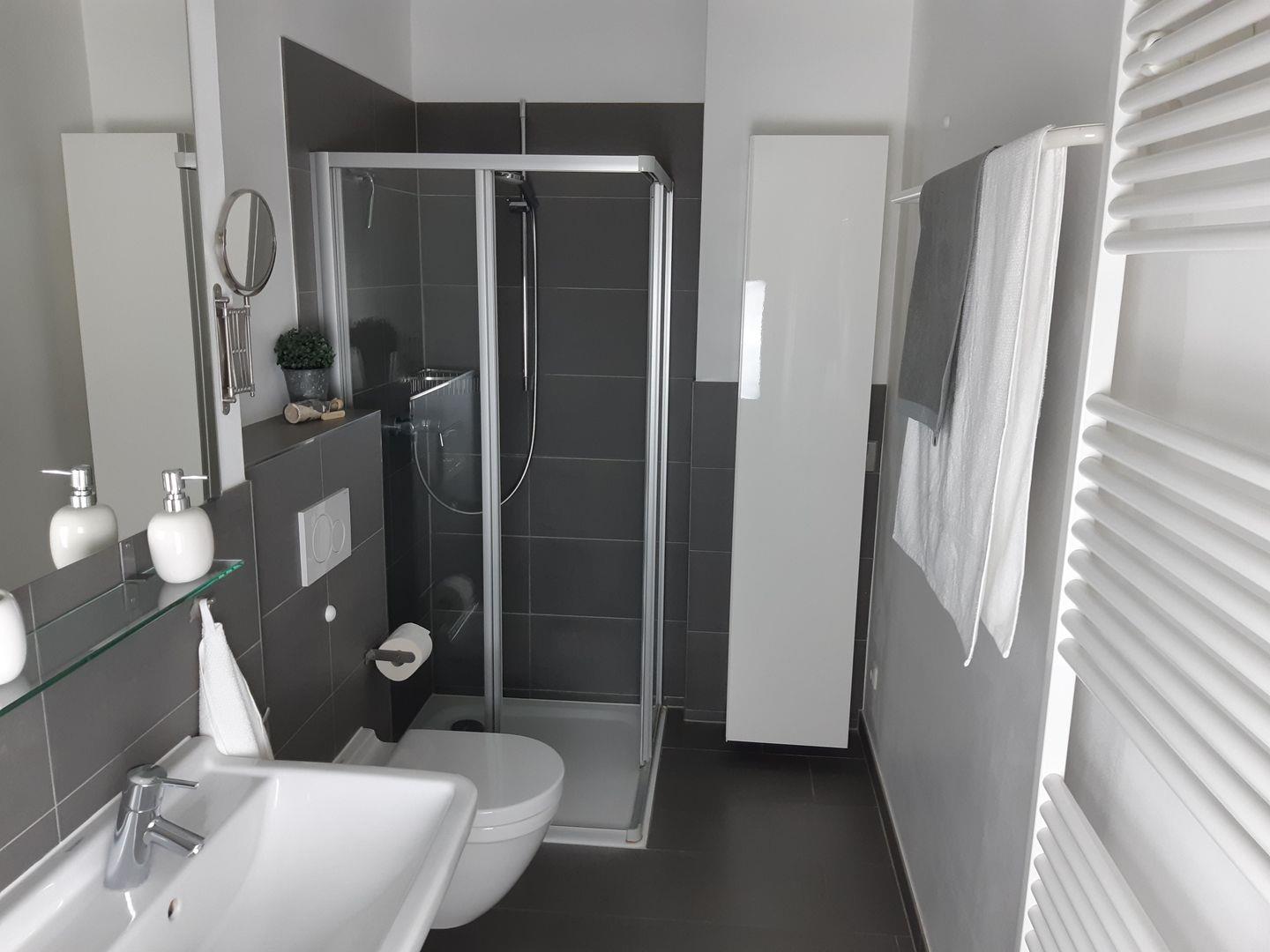 Sehr flache Dusche mit zwei beweglichen Glaselementen, Handtuchheizkörper, Schrank und einem Radio.