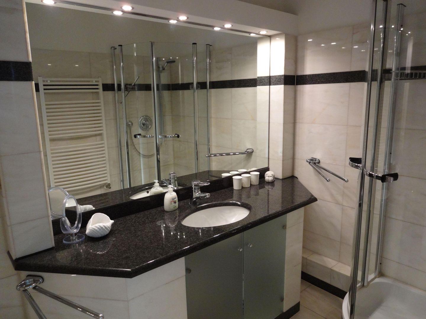 Das moderne, hell geflieste Duschbad besticht durch einen Marmorwaschtisch, einer Runddusche, Hänge-WC und einem Handtuchheizkörper.