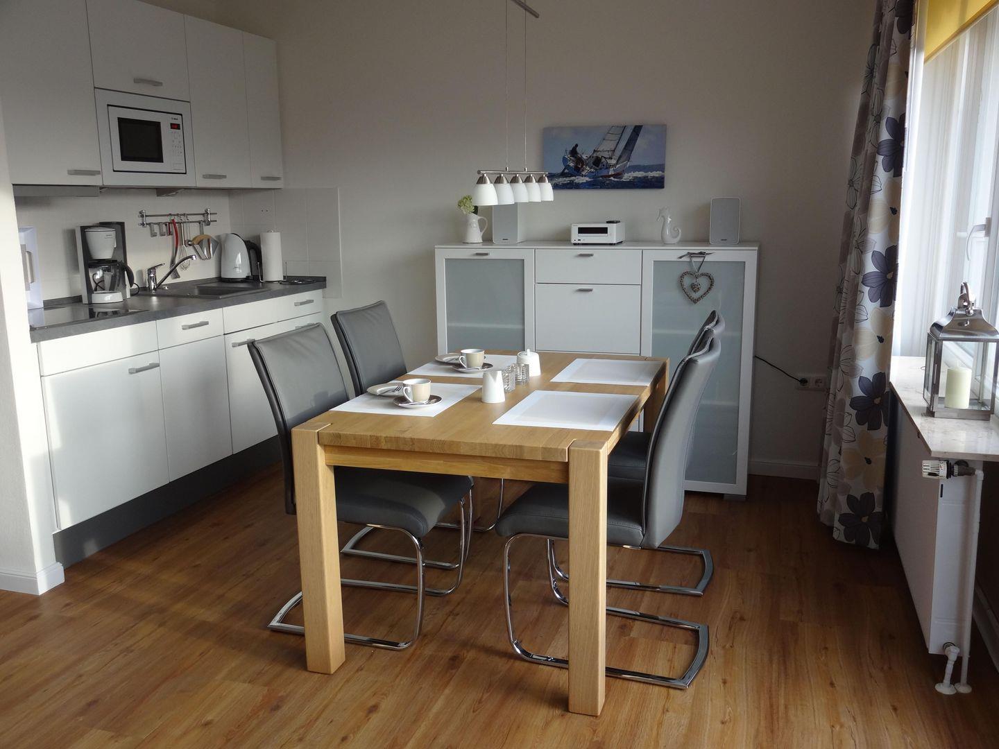Die offene Küchenzeile, mit Ceran-Kochfeld, einer Geschirrspülmaschine, einer Mikrowelle und einem Kühlschrank mit Gefrierfach, ist in das Wohnzimmer integriert und ist mit allen nötigen Utensilien ausgestattet. Davor befindet sich der große Esstisch mit vier Schwingstühlen.