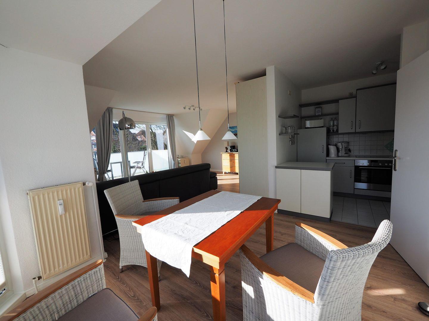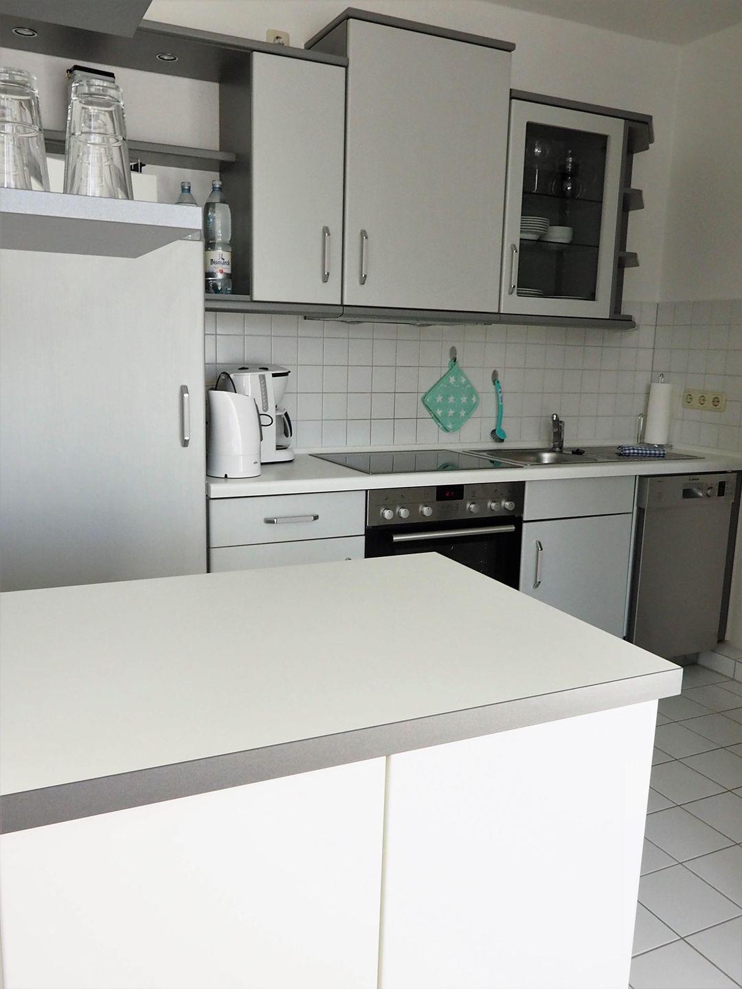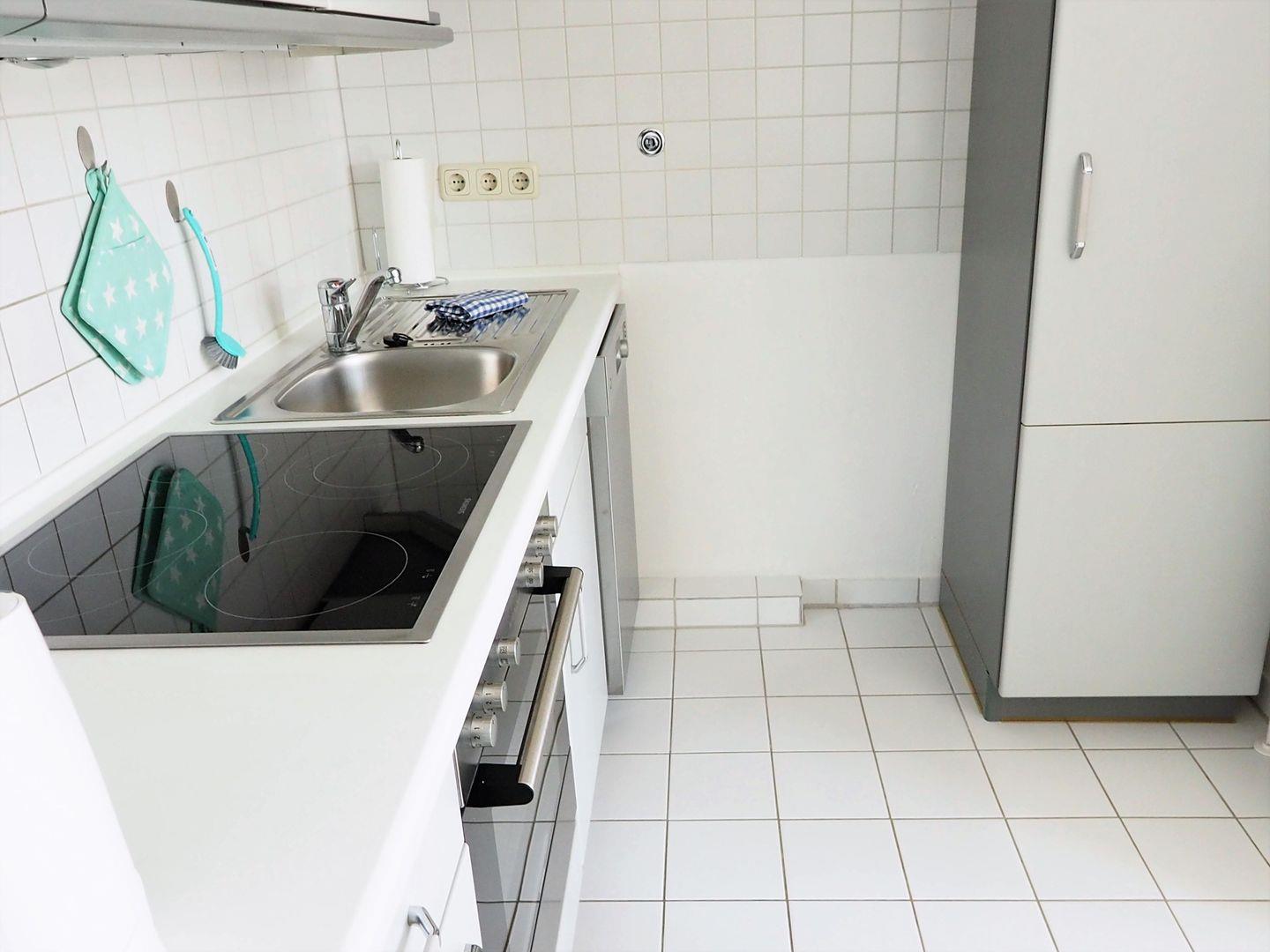 Einbauküche mit Komplettausstattung inkl. Ceranfeld, Backofen, Dunstabzugshaube, Kühlschrank mit Gefrierfach, Geschirrspüler, Kaffeemaschine, Wasserkocher und Staubsauger. Essbereich im licht- und sonnendurchfluteten Erker (Fenster mit Plisseerollos), 4 gemütlichen Korbsesseln mit passenden Polsterauflagen und Esstisch. Separates Schlafzimmer mit Doppelbett (1,60 m breit, 2 Matratzen a 80 cm, x 2,00m) und Leselampe, Fenster mit Verdunkelungsrollo und Fliegengitter. Modernes gefliestes Duschbad mit Glasabtrennung, WC, Handtuchheizkörper, Waschbecken, Fenster mit Fliegengitter. In diesem Appartement ist das Rauchen und Mitbringen von Haustieren nicht erlaubt. Wir bitten um entsprechende Beachtung!