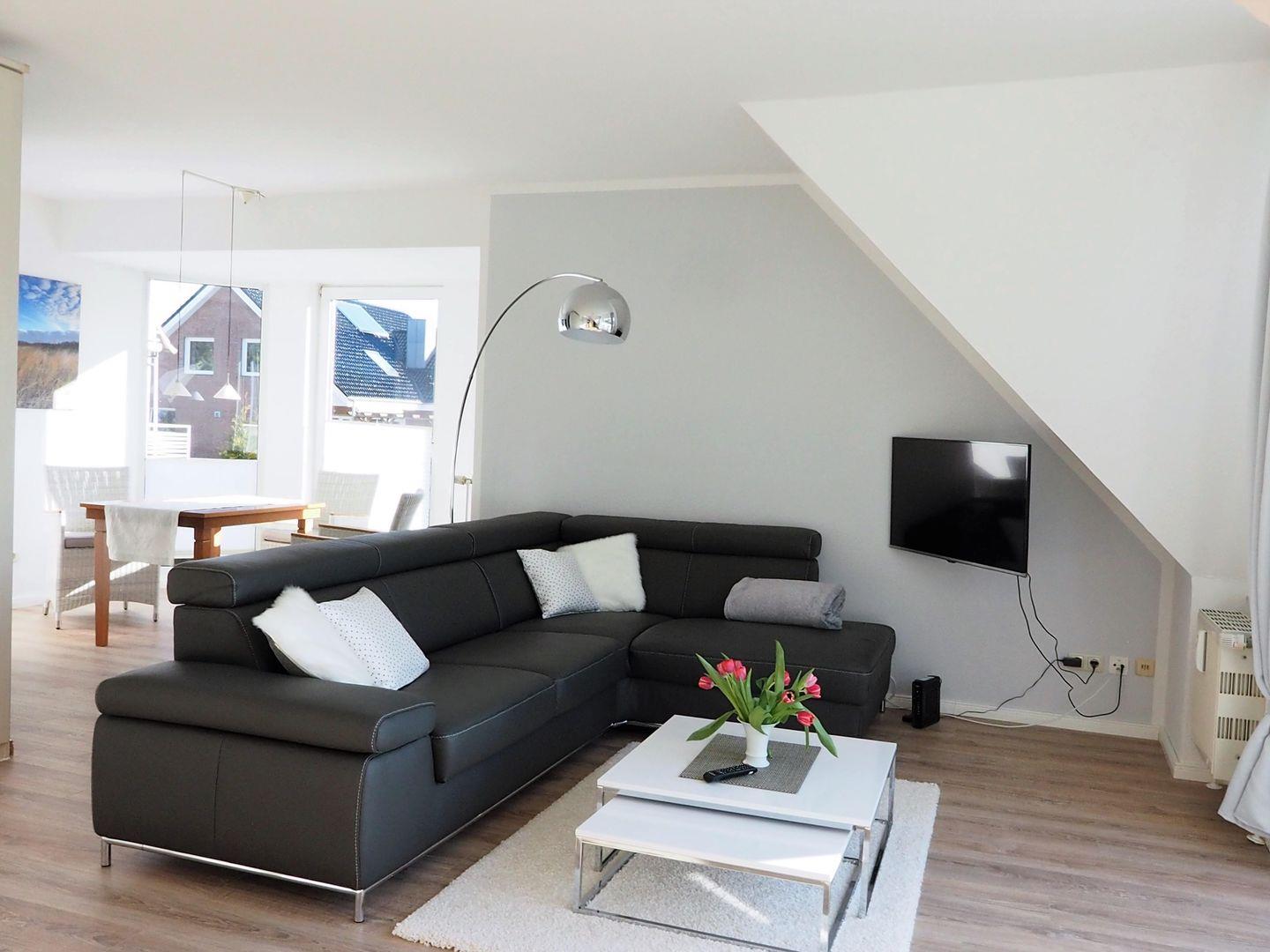 Der sonnige, großzügige Wohnraum ist mit einem hellem Vinylboden ausgestattet und verfügt über ein bequemes Lederecksofa, 1 Couchtisch und einer Essecke mit 4 gemütlichen Korbsesseln und passenden Polsterauflagen, einem Samsung Flachbildschirm-TV, Stereoanlage mit CD, MP3-CD-Player, Bluetooth fähig von Philips. Das Fenster hat blickdichte Vorhänge, Ausgang zum Balkon, Möblierung: 2 Balkonstühle von Kettler mit verstellbarer Lehne und passenden Auflagen, ein Glastisch und ein Sonnenschirm.