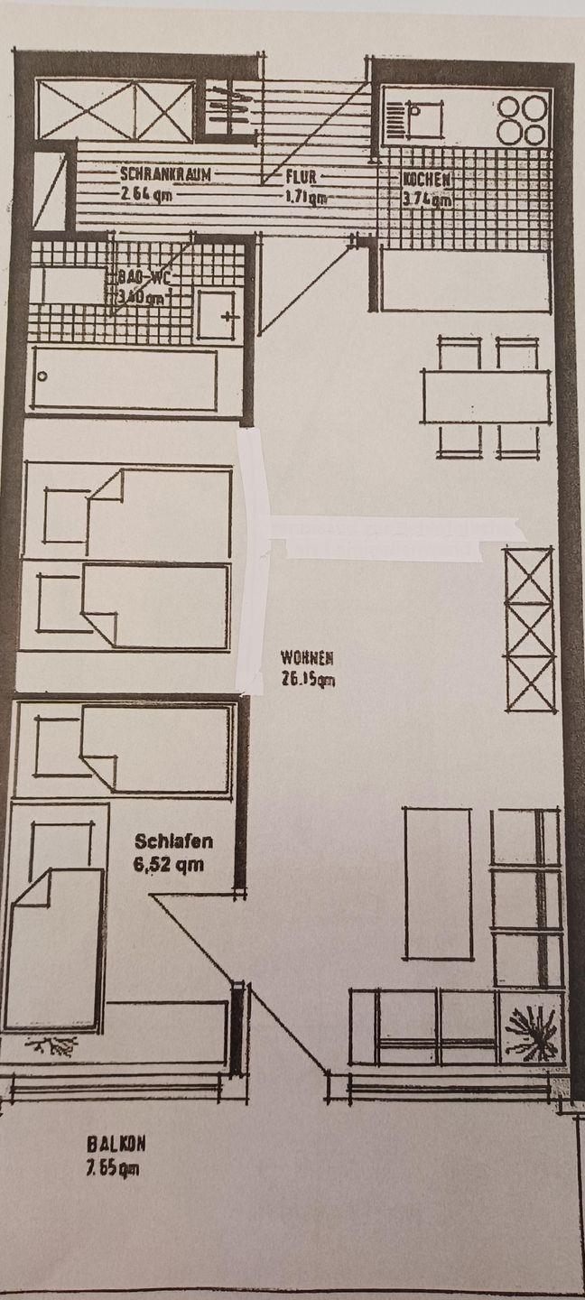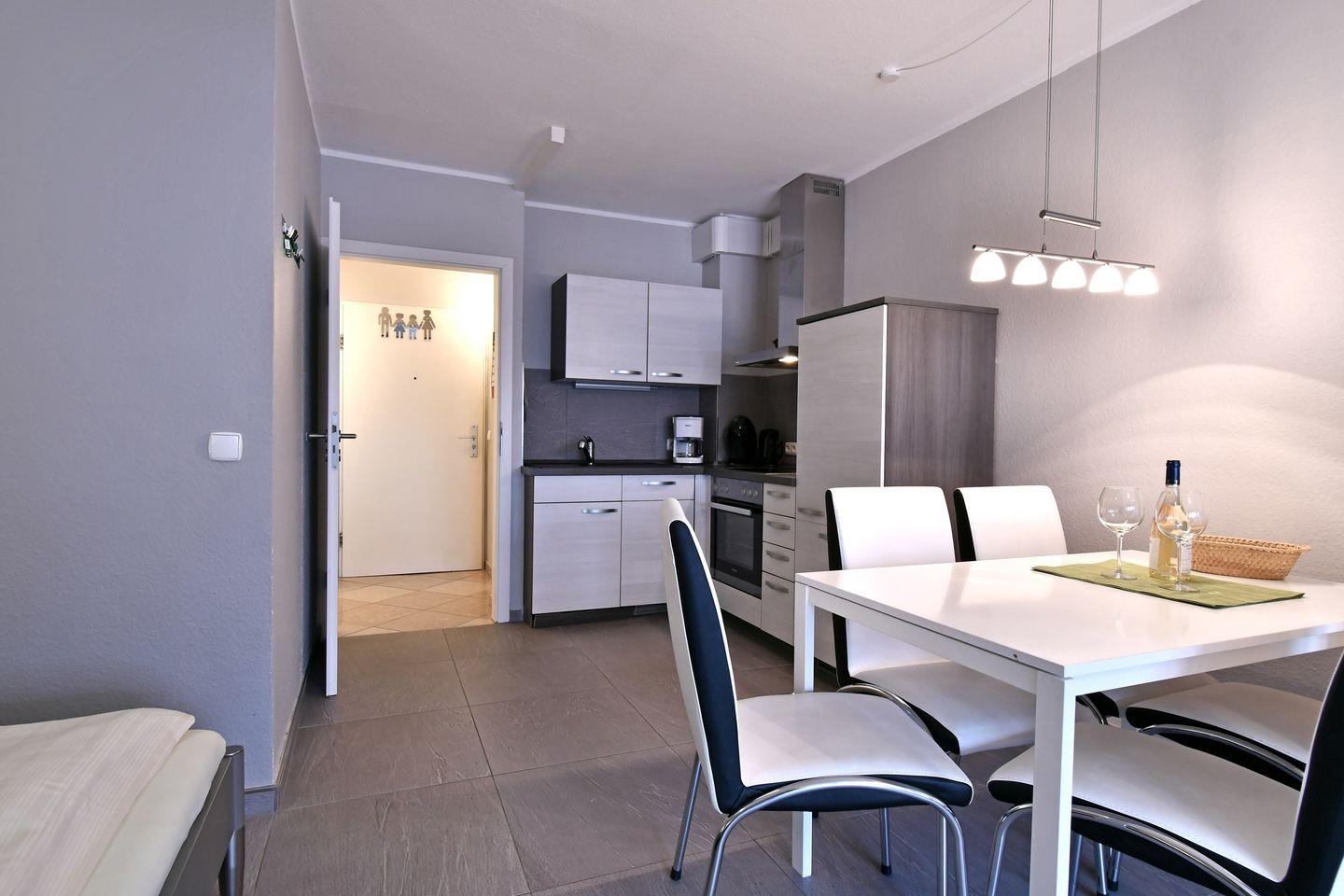 Das ca. 50 qm große 2-Zimmer-Appartement liegt im 4. OG und ist bequem mit dem Lift erreichbar. Es verfügt über einen großen Balkon. Der Wohnraum ist mit Polstersofa, Couchtisch und Flachbild-TV ausgestattet. In der angrenzenden Schlafnische befindet sich das Doppelbett. Es handelt sich um ein Boxspringbett mit dem Maß 1,60 x 2 m(durchgängige Matratze). Im separaten Schlafraum finden sich ein Etagenbett und ein Einzelbett sowie Flachbild-TV und Blue-Ray Player. Die offene, moderne Einbauküche ist mit Ceranfeld, Senseo Kaffeemaschine sowie eine Filtermaschine und Spülmaschine nebst angeschlossenem Essplatz sehr gut ausgestattet. Ein modernes Duschbad mit Runddusche, Waschtisch, WC und Föhn runden das Appartement ab. WLAN ist inkl.