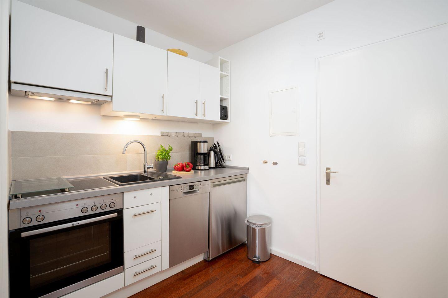 - eine Einbauküche mit Geschirrspüler, Herd, Backofen und Kühlschrank.