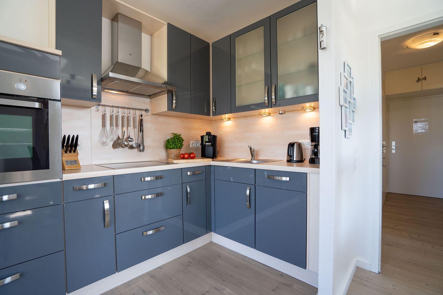Das anspruchsvolle und stilsicher eingerichtete ca. 50 qm große 2-Raum-Appartement befindet sich im 5. und somit obersten Wohngeschoss, das mit einem Lift bequem erreichbar ist. Die gesamte Wohnung ist mit hochwertigem Laminatboden ausgelegt. Im großen, hellen Wohnraum findet sich eine gemütliche Essecke sowie eine wunderbar gemütliche Eckgarnitur mit einem bequemen Fernsehsessel, Couchtisch und einem 55-Zoll Smart TV von Samsung mit Internetfunktionen und Apps sowie eine Stereoanlage mit Bluetooth. Die moderne in grau gehaltene offene Einbauküche bereitet Ihnen durch ihre Komplettausstattung großen Kochgenuss! Das kleine Schlafzimmer ist mit einem exquisiten Boxspringbett (Modell Global Valencia) in der Größe 1,60 x 2m, einem Kleiderschrank und einem an der Wand angebrachten Samsung Smart TV ausgestattet. Im hell und freundlich gefliesten Innenbad verfügen Sie über eine Duschkabine, Waschbecken, Spiegel, Handtuchheizkörper und spülrandloses Wand-WC.