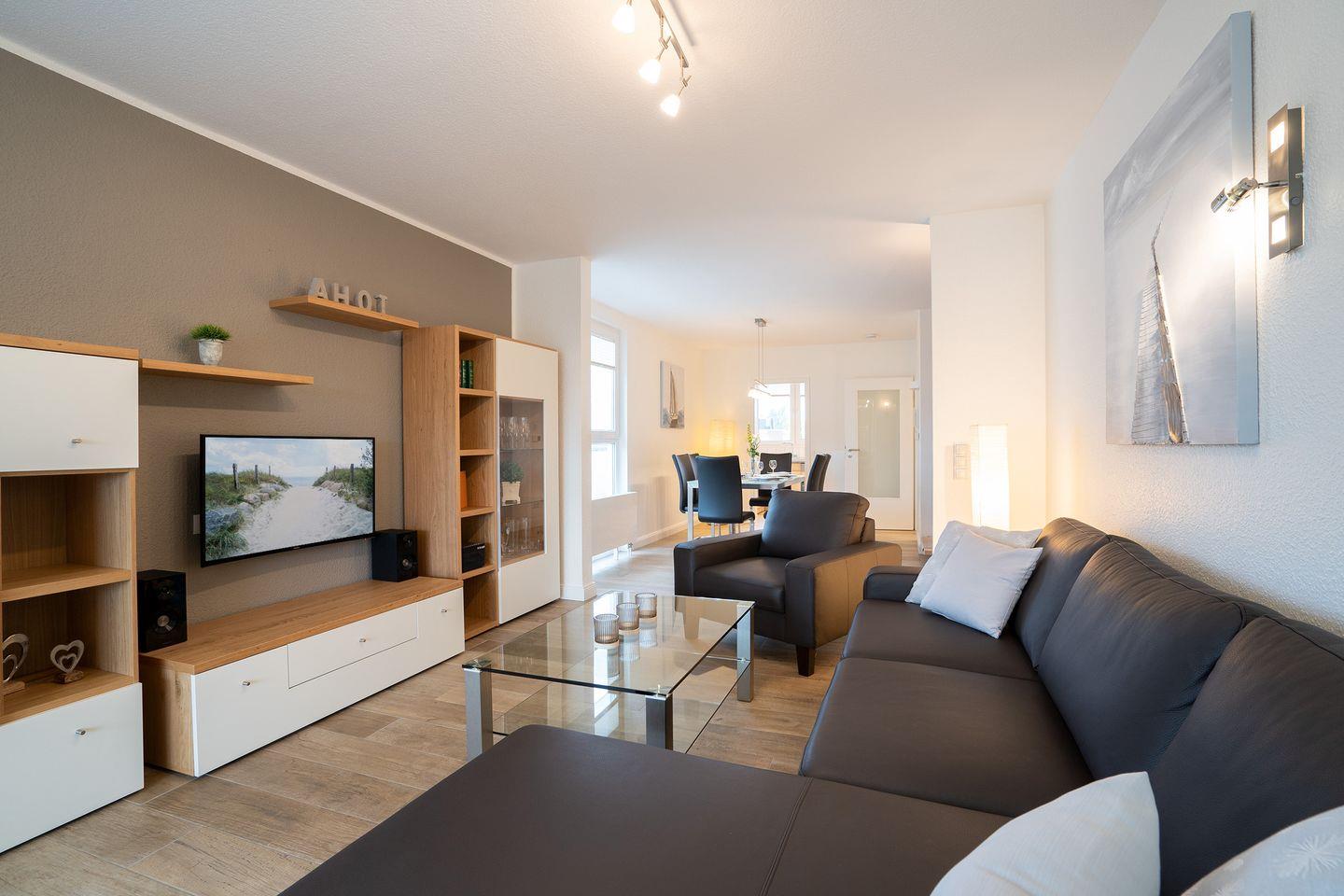 Die 3-Raum-Ferienwohnung Nr.10 befindet sich in der 3. und 4. Etage und verbreitet auf 90 qm Urlaubskomfort für die ganze Familie. Die 4. Etage ist auch das oberste Stockwerk und bietet daher Penthouse-Feeling. Wohnzimmer, Essbereich, Wintergarten, sowie ein Duschbad sind in der 3. Etage. Die Küche ist voll ausgestattet. Die beiden Schlafräume (1x Doppelbett mit TV, 1x zwei Einzelbetten) und ein Wannenbad sind in der 4. Etage. WLAN inklusive. Zum Strand und zur Promenade sind es nur 5 Gehmin.