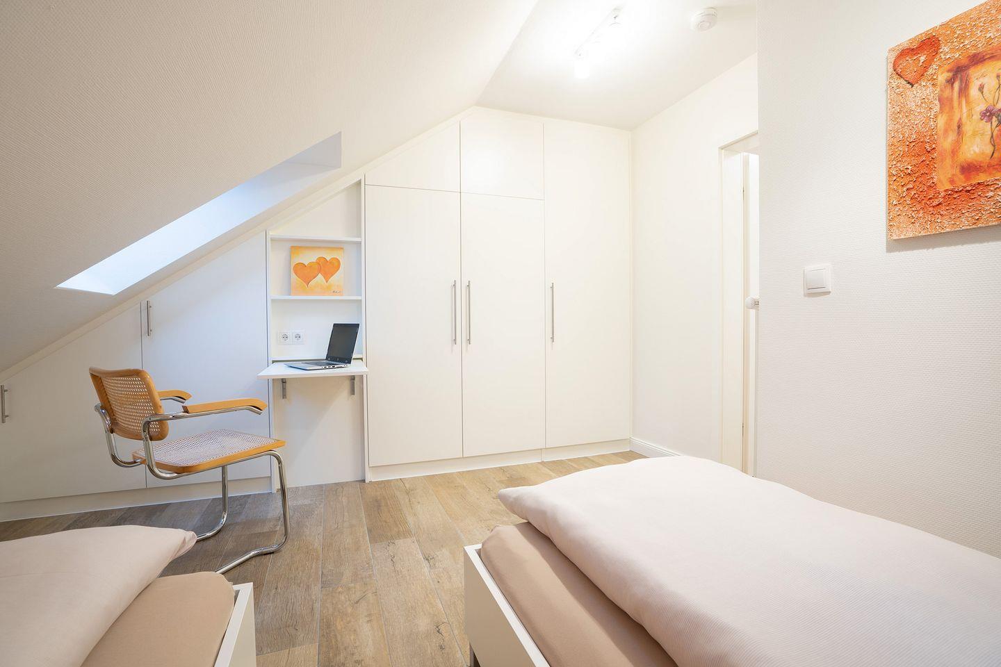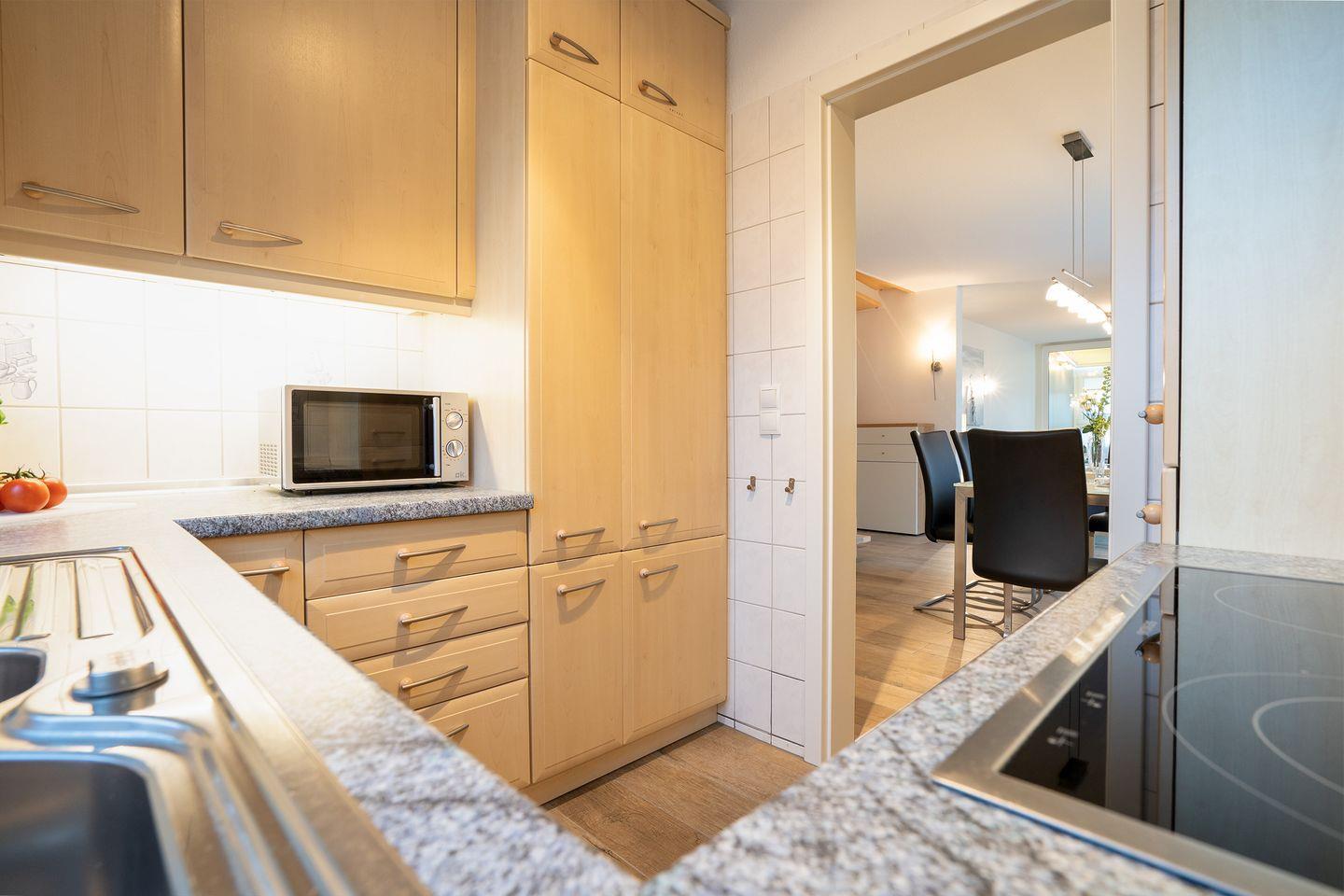 Hier finden Sie auf 90 qm über 2 Etagen Urlaubskomfort für die ganze Familie. Der schöne Strand von Scharbeutz mit seiner belebten Promenade ist weniger als 5 Gehminuten von der Wohnung entfernt. Die sehr schöne 3-Raum-Ferienwohnung Nr. 10 befindet sich in der 3. und 4. Etage. Die 4. Etage ist auch das oberste Stockwerk des Gebäudes und bietet daher Penthouse-Feeling. Wohnzimmer, Essbereich und Wintergarten sind in der 3. Etage. Genießen Sie mit Familie und Freunden entspannte Mahlzeiten am langen Esstisch oder lassen Sie im gemütlichen Wintergarten den Tag bei einem Glas Wein ausklingen. Die separate Küche ist mit Spülmaschine, Backofen, Herd und Mikrowelle voll ausgestattet. Ebenfalls auf dieser Etage befindet sich ein modernes Duschbad. Die beiden Schlafräume und ein komfortables Wannenbad sind in der 4. Etage. Ein Schlafraum ist mit einem Doppelbett (190 x 200 cm) und TV-Gerät ausgestattet, der andere mit 2 Einzelbetten (100 x 200 cm). Eine Waschmaschine befindet sich gegen Gebühr im Haus. Ein PKW-Stellplatz in der hauseigenen Tiefgarage ist inklusive.