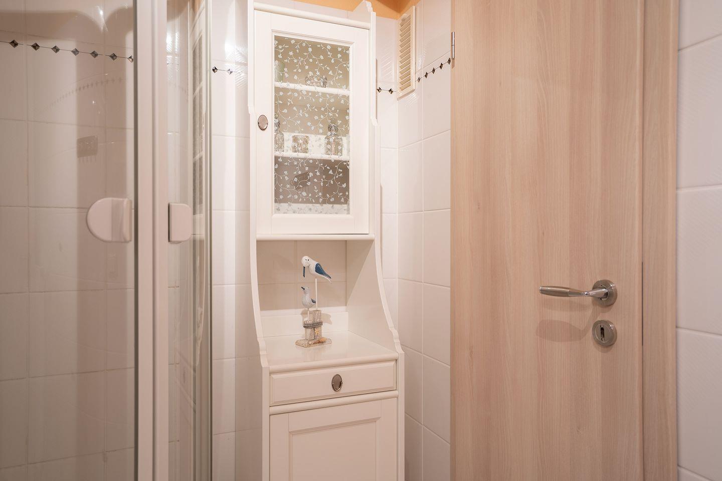 Vom Flurbereich gelangt man in das erste Schlafzimmer mit Ausgang auf eine Terrasse. In diesem Schlafzimmer befinden sich zwei Einzelbetten ( 90 x 200 cm ). Das kleine Duschbad und ein Abstellraum gehen ebenfalls vom Flurbereich aus. Weiter befindet sich auf dieser Ebene das Wohn-Esszimmer mit Zugang auf die Loggia. Im Wohn-Essbereich gibt es eine hochwertige Küche mit Geschirrspüler, Herd, Kühlschrank mit kleinem Gefrierfach, Toaster, Wasserkocher, Filter-Kaffeemaschine, Kaffeekapselmaschine "TASSIMO" etc. Ferner befinden sich dort eine Esszimmergruppe, eine gemütliche Couch und ein TV-Gerät.