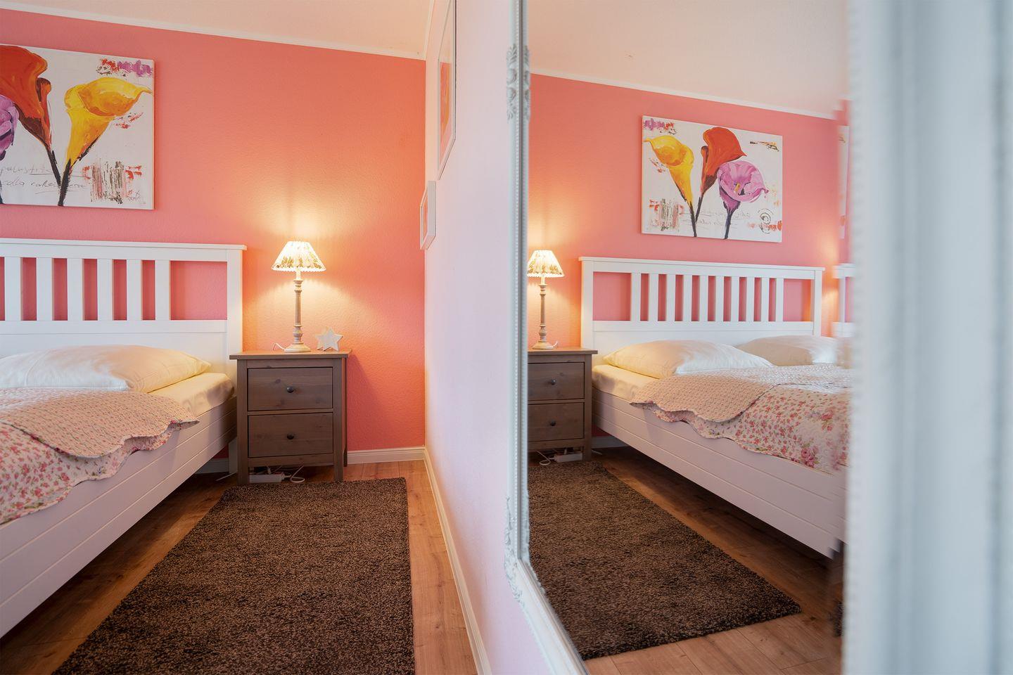 Über eine Treppe erreicht man das zweite Schlafzimmer ebenfalls mit einer Terrasse. In dem Schlafzimmer gibt es ein Doppelbett (180x200 cm/Einzelmatratzen) ) und ein weiteres TV-Gerät. Ein zweites Duschbad mit einem kleinen Abstellraum sind auf dieser Ebene vorhanden. Im Keller gibt es eine Waschmaschine und einen Trockner ( Münzbetrieb ).