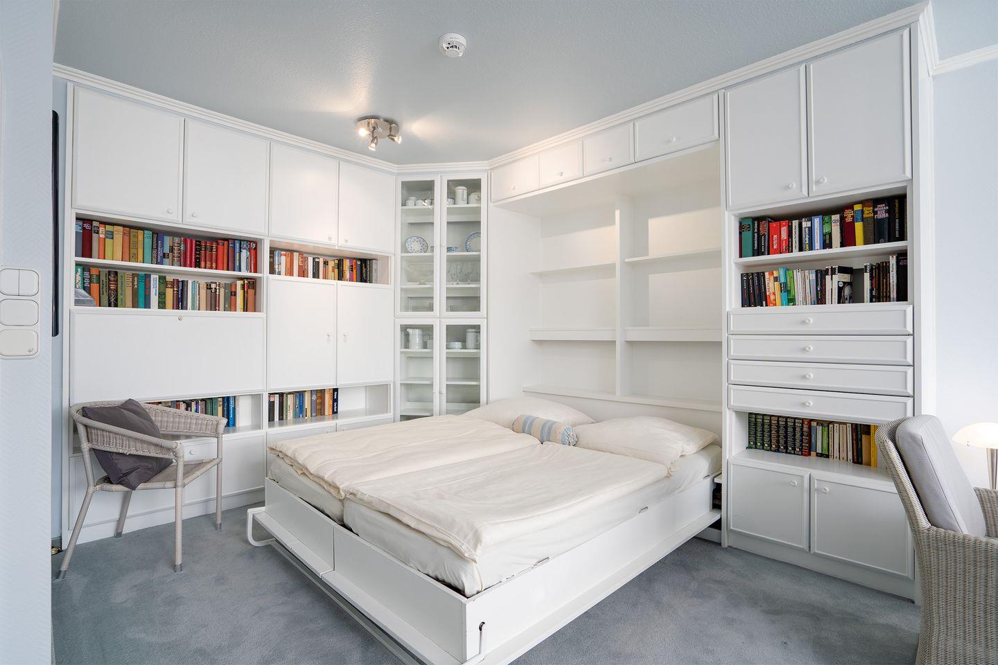 Das Schrankbett (2 m x 0,80 m x 2,00 m/Einzelmatratzen) im Wohnbereich ist für zwei Personen geeignet und kann bei Bedarf hochgeklappt werden. Darüber hinaus verfügt das Appartement über ein separates Zimmer, das mit einer Schlafcouch (1,20 m x 2m) ausgestattet ist.