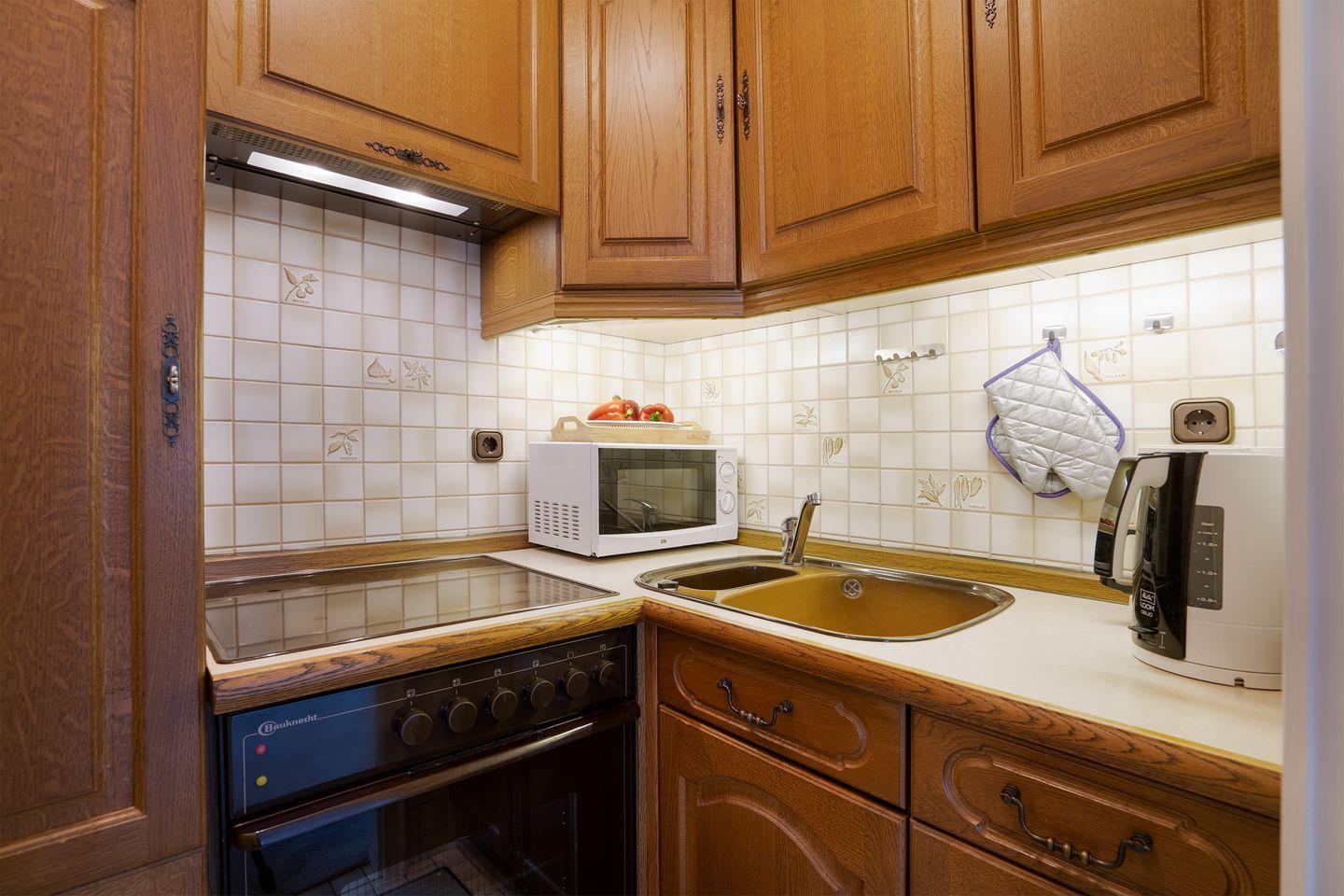 Die kleine Küche verfügt neben einer Kaffeemaschine, einem Wasserkocher, auch über eine Mikrowelle und einem Backofen.