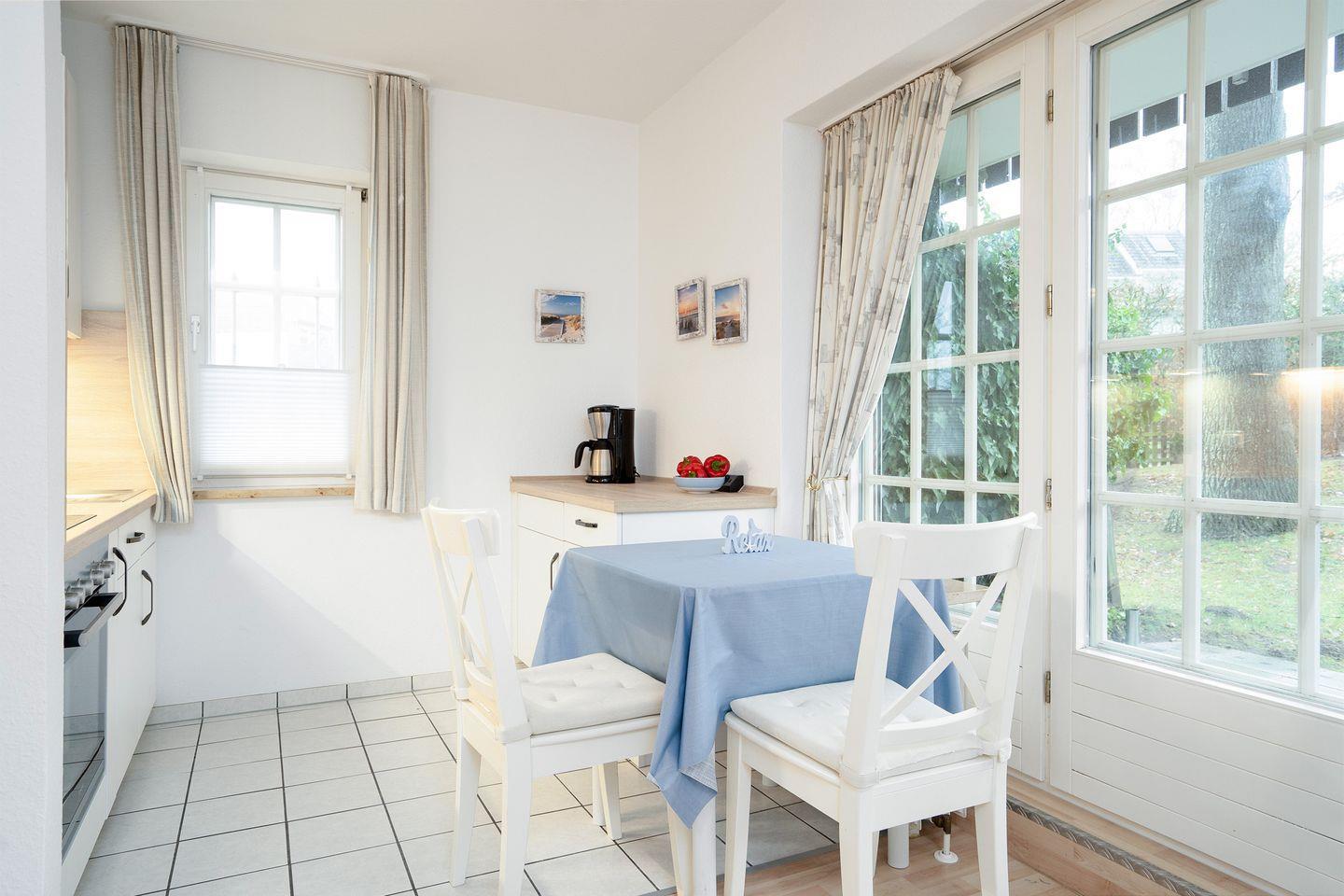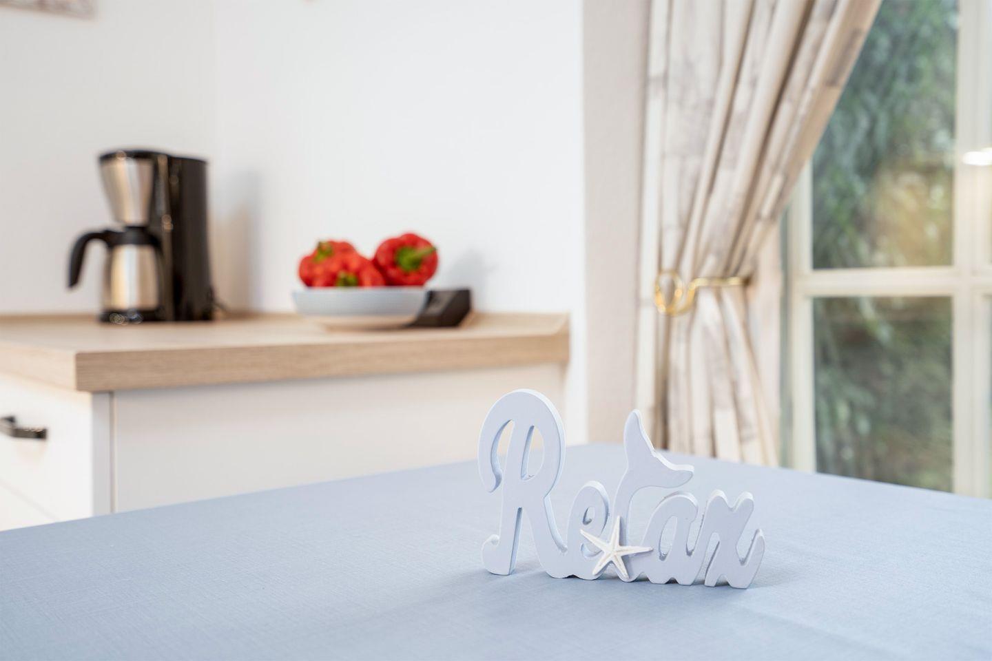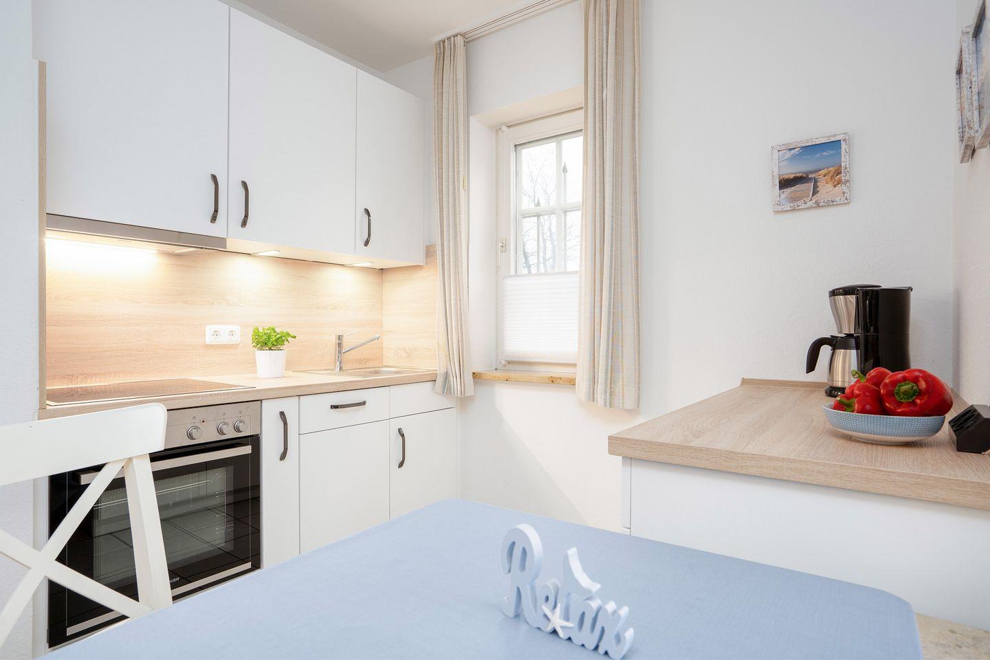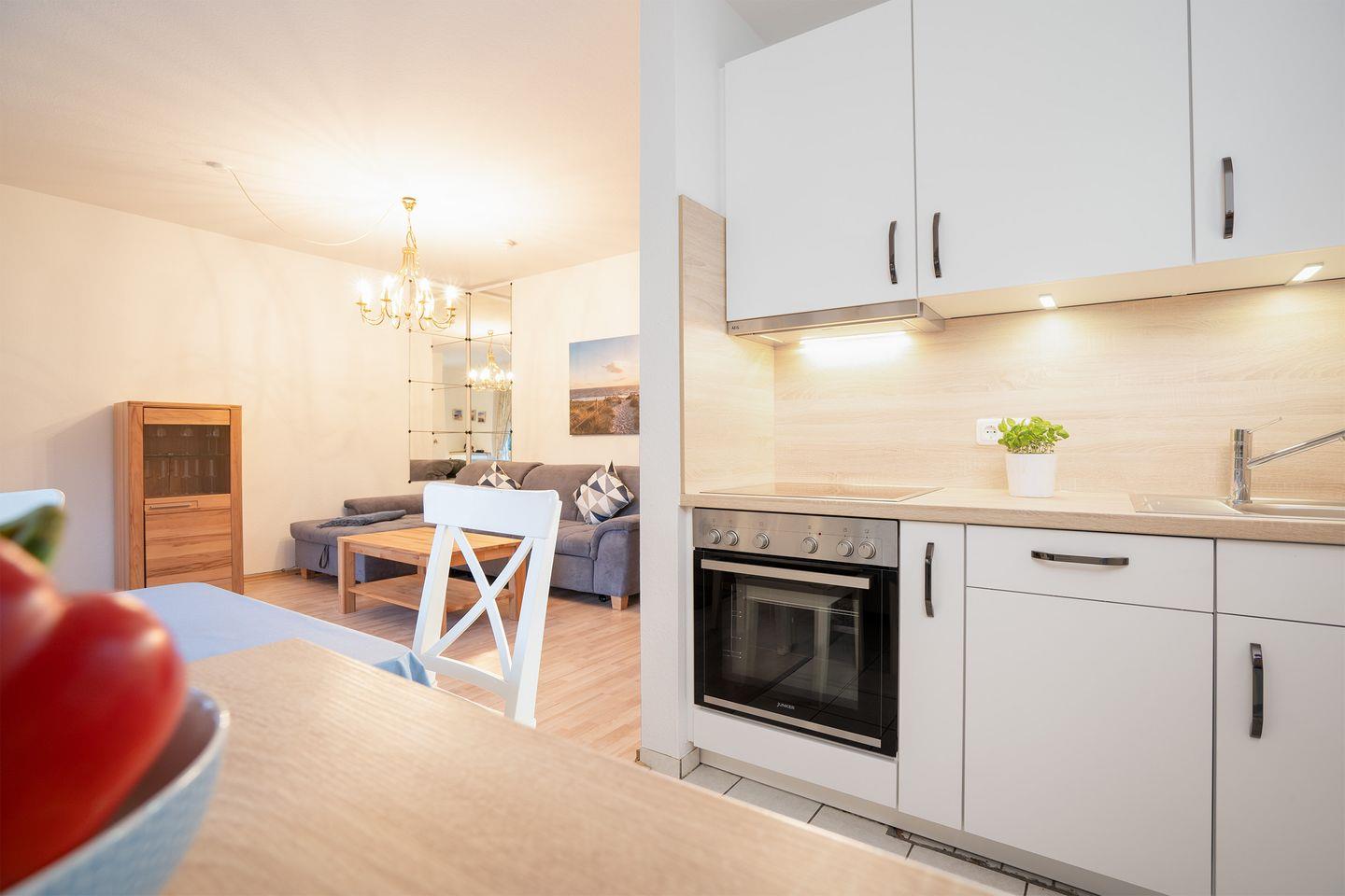 Es handelt sich um ein liebevoll eingerichtetes ca. 53 qm Appartement für max. 2 Erwachsene mit 1 Kind. Ein einladender großer Wohnraum mit Schlafsofa, nebst Couchtisch und TV macht das Wohnzimmer sehr gemütlich. Von hieraus kommen Sie auf die durch Hecken eingewachsene Sonnenterrasse, die den ganzen Tag zum Verweilen einlädt. Eine Außenjalousie ist vorhanden. Über das Wohnzimmer gelangen Sie zum Essbereich und der offenen Küche. Sie bietet eine Komplettausstattung an Geschirr, Backofen, Wasserkocher, Kaffeemaschine und auch einer Spülmaschine sowie sämtliche Kochutensilien, die Sie benötigen.