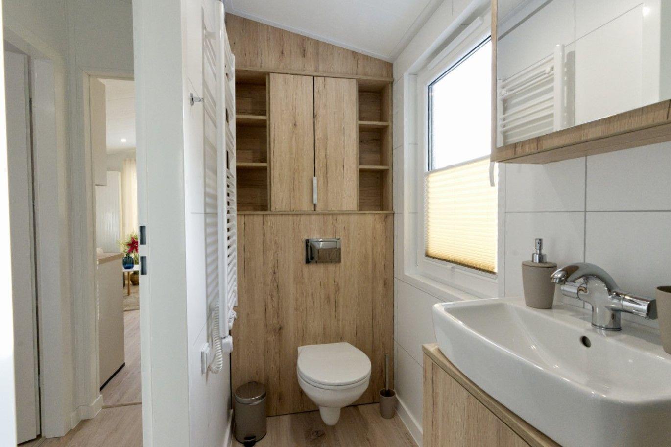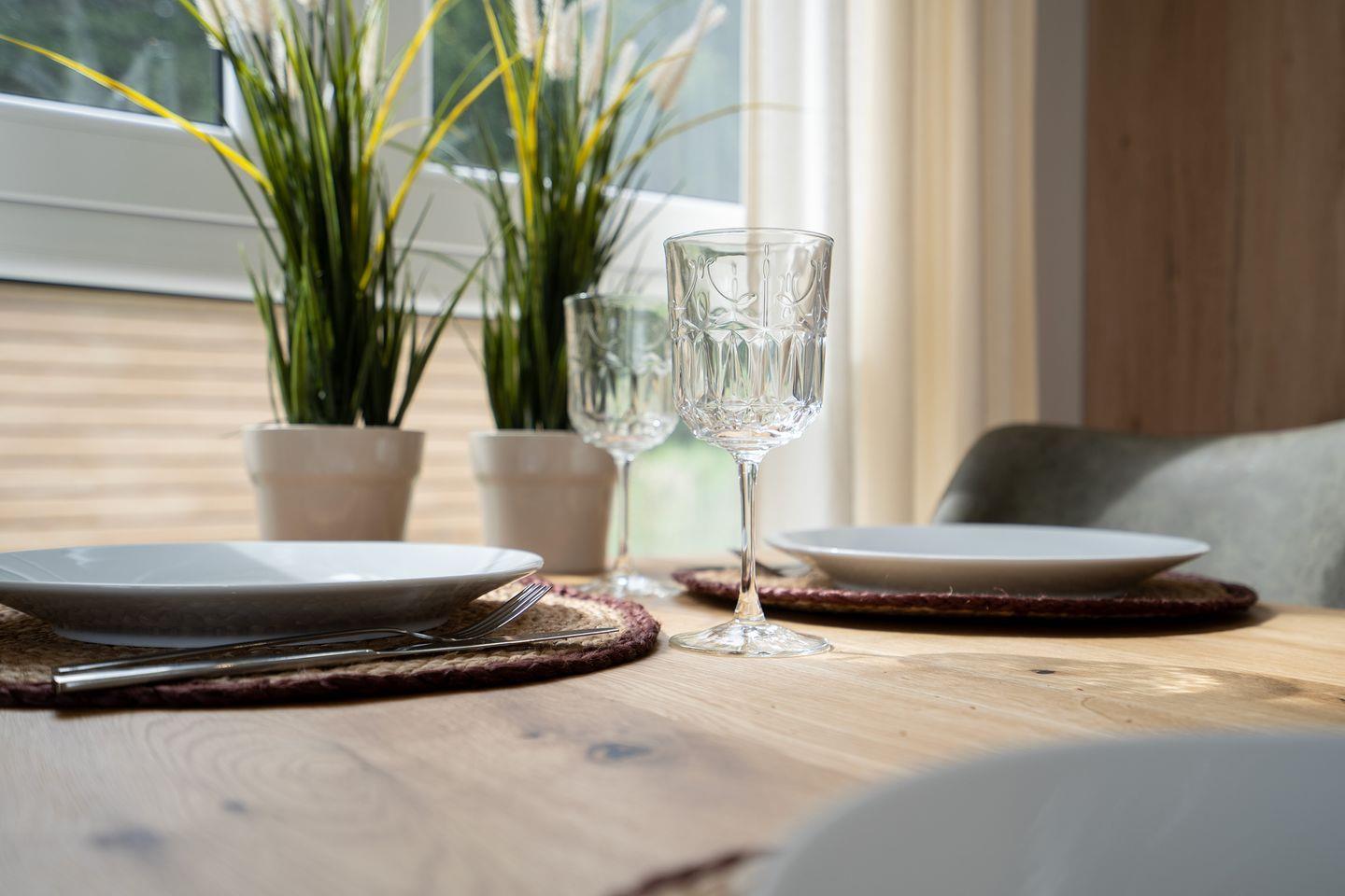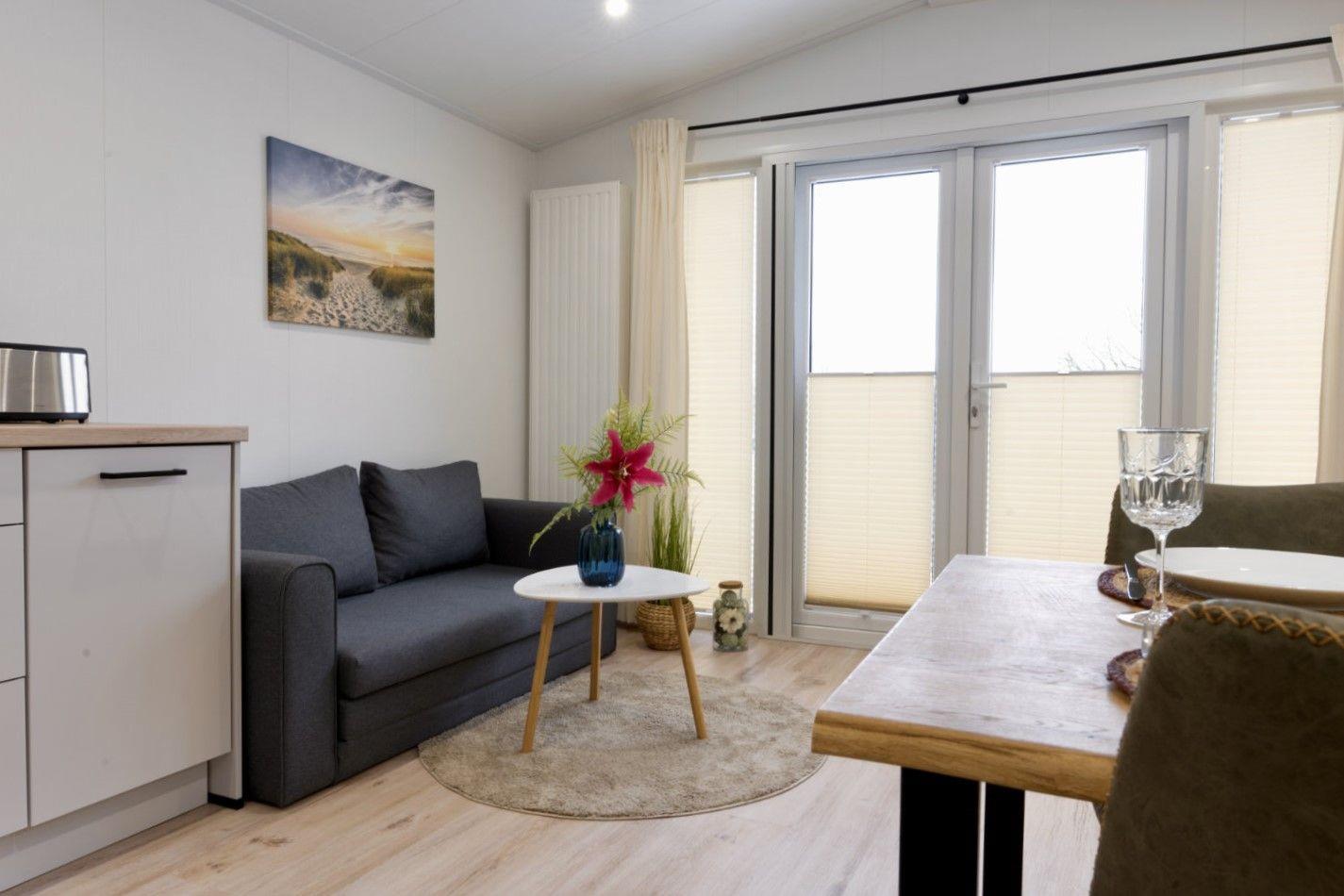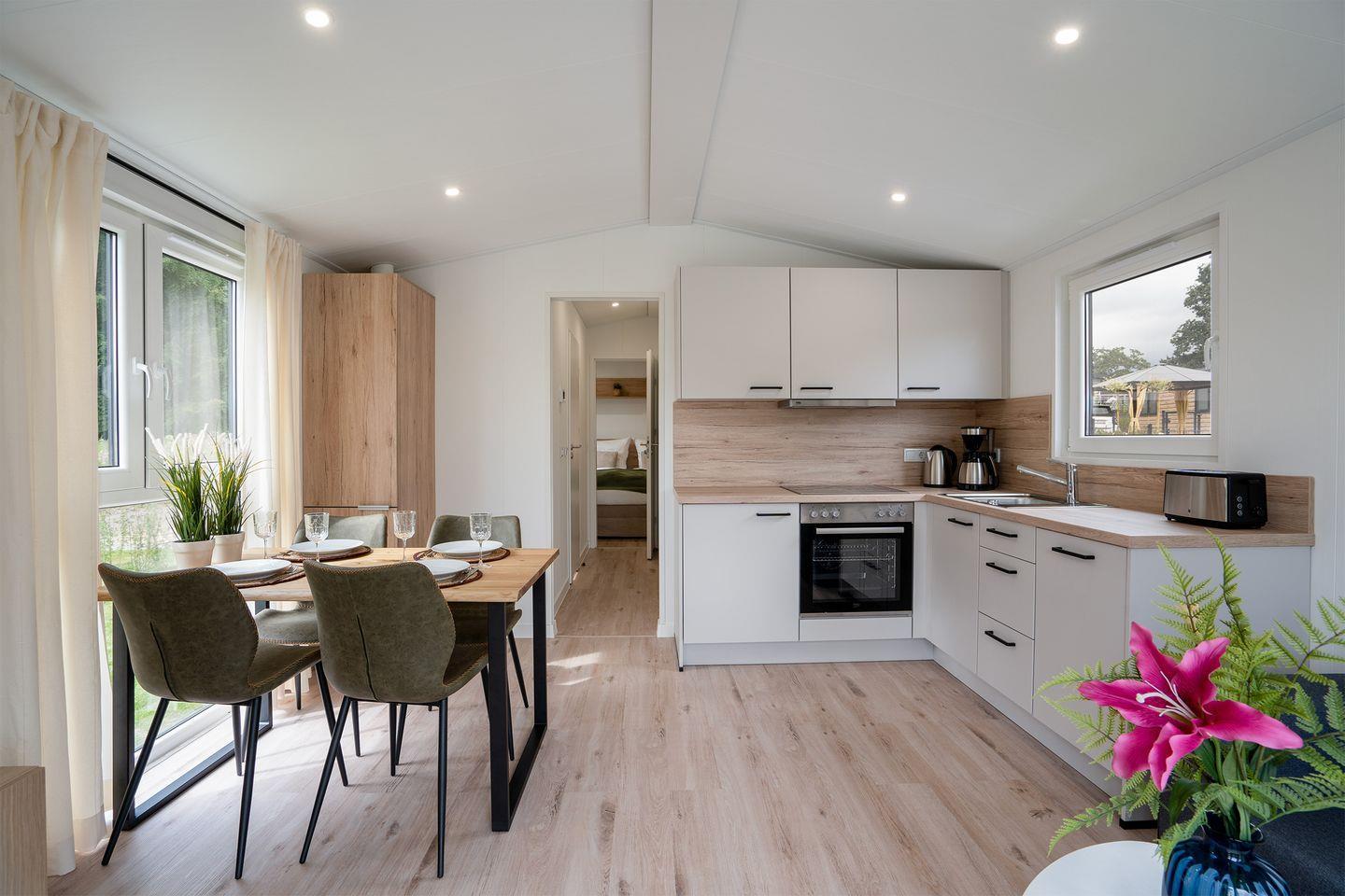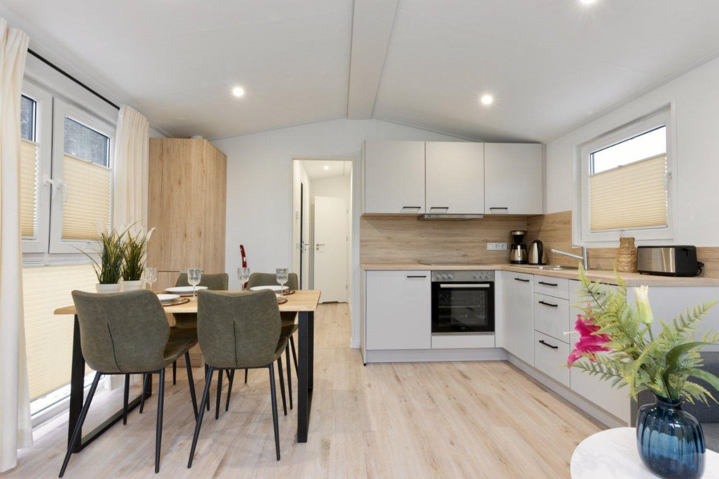 Die moderne Wohnküche ist bestens ausgestattet und lädt zum kulinarischen experimentieren ein. Eine Kaffeemaschine, ein Wasserkocher sowie einen Toaster stehen für Sie bereit. Ein Esstisch aus naturbelassener Eiche sowie gemütliche Stühle schaffen ein Ambiente, dass gemeinsame Mahlzeiten zu einem Fest der Sinne macht. Das Sofa verwandelt sich bei Bedarf in ein zusätzliches Bett, während der 43“ Smart-TV an regnerischen Tagen für Unterhaltung sorgt. Großzügige Fenster bieten Blicke auf den umliegenden Wald oder das Ostseecamp Lübecker Bucht.