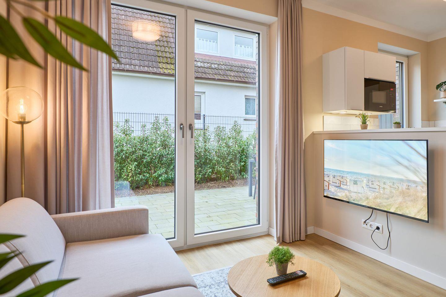 Im Wohnzimmer erwartet Euch ein großer Smart-TV (50 Zoll) für gemütliche Abende. Bei Bedarf lässt sich die komfortable Schlafcouch (140x200 cm) mit einer hochwertigen Matratze ausklappen und bietet zusätzlichen Schlafplatz.