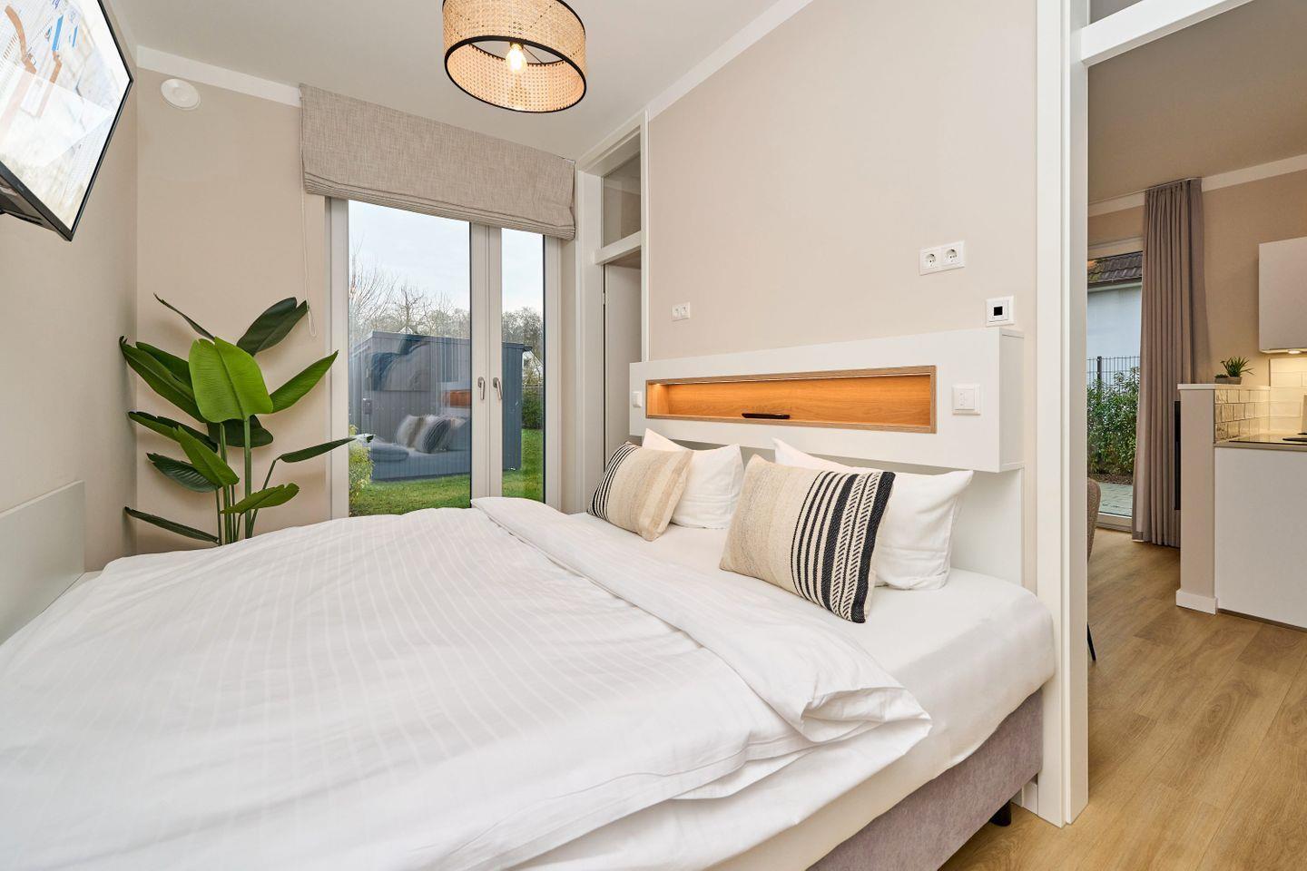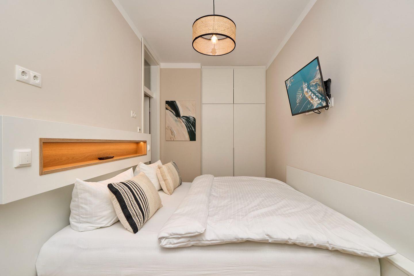 Das gemütliche Schlafzimmer ist mit einem großzügigen Boxspringbett (180x200 cm), einem Smart-TV (32 Zoll) und einem geräumigen Kleiderschrank ausgestattet, in dem Ihr während Eures Aufenthalts bequem alles verstauen könnt.
