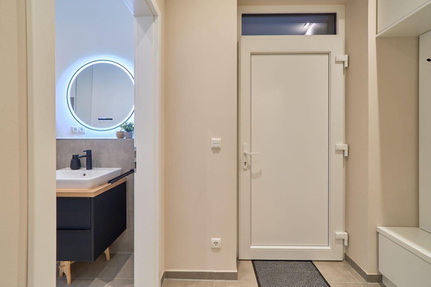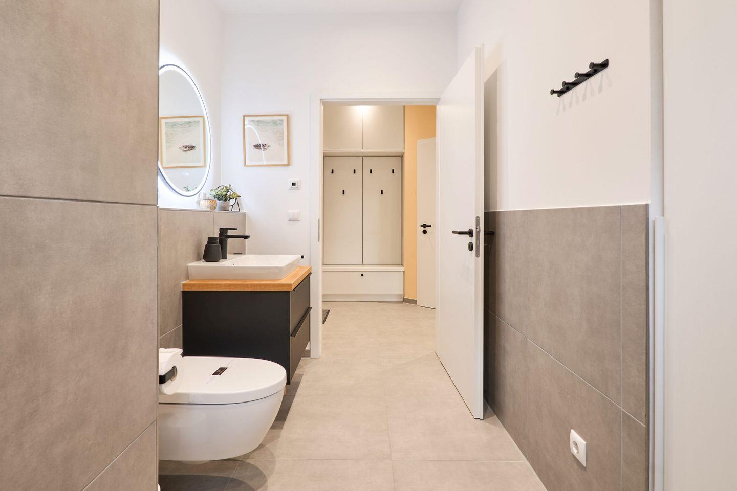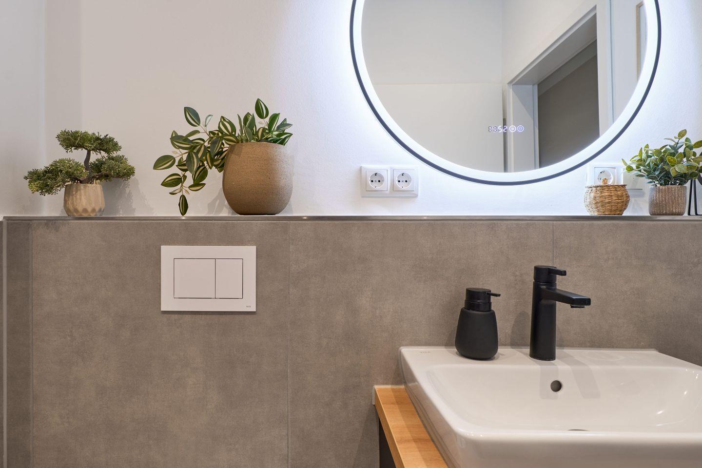 Das Badezimmer ist modern in neutralen Naturtönen gestaltet und besticht mit einem beleuchteten Spiegel samt Spiegelheizung – ein echtes Highlight für das tägliche Frischegefühl. Ein Föhn ist ebenfalls vorhanden.