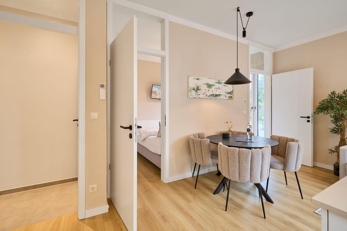 Der Essbereich und die voll ausgestattete Küche lassen keine Wünsche offen. Neben einer Nespresso-Maschine, einer Filterkaffeemaschine und einem Wasserkocher stehen auch Toaster, Mikrowelle, Backofen, Geschirr sowie Töpfe und Pfannen zur Verfügung.
