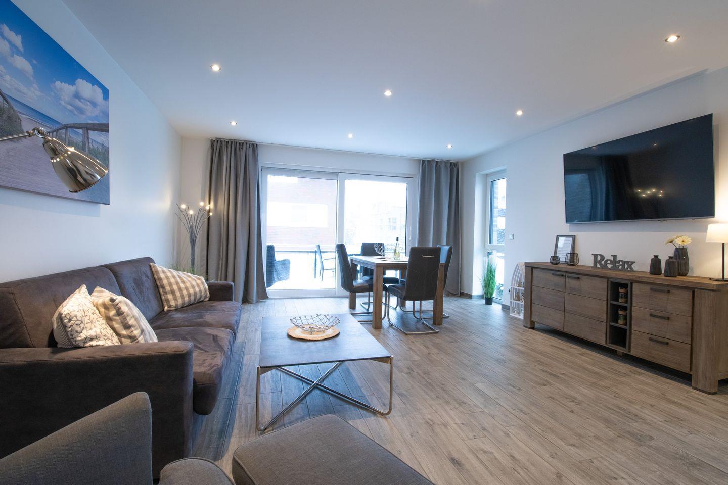 Der großzügige Wohnbereich mit gemütlichem Sofa und Smart-TV lädt zum Entspannen ein. Durch die offene Raumgestaltung entsteht ein luftiges Ambiente. Die sonnige Terrasse ist ideal für ein Frühstück im Freien oder einen ruhigen Ausklang am Abend.