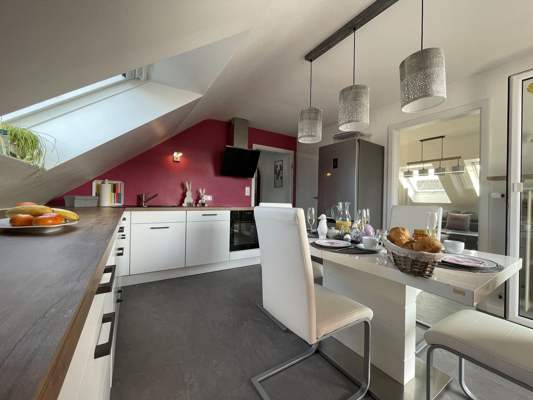 Diese 4 Sterne Ferienwohnung liegt im 1. Stock mit gemütlichen Dachschrägen. Egal, ob Sie auf dem Balkon zur Ostseite frühstücken wollen, oder doch lieber auf der überdachten Loggia (Süd-West), dass ist Ihre Entscheidung. Da in dieser Ferienwohnung keine Terrasse zur Verfügung steht, können Sie unseren 1200qm großen Garten mitbenutzen. Zwei Holzliegen stehen Ihnen zur Verfügung. Weiterhin befindet sich auf der Loggia ein Elektrogrill.