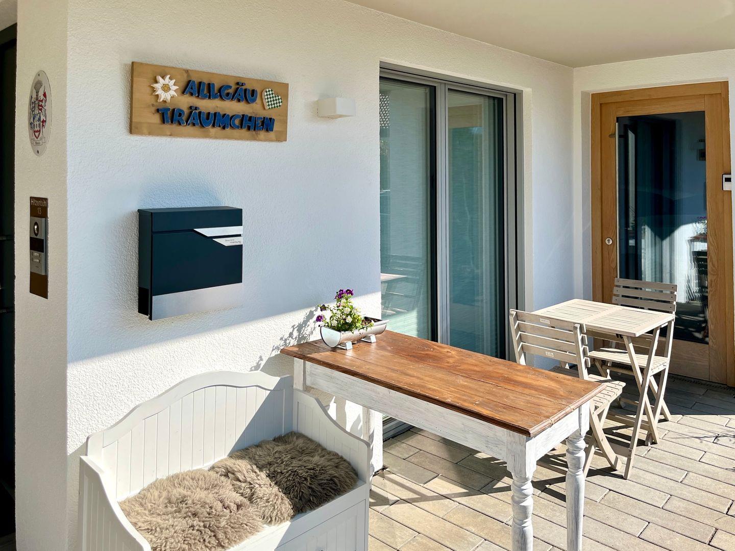 Die eigene Terrasse mit Gartenmöbeln lädt bei schönem Wetter zum Frühstück im Freien oder zu einem ruhigen Tagesausklang ein – mit Blick ins Grüne und frischer Allgäuer Bergluft. Frühaufsteher können direkt vom nahegelegenen Höhenweg aus den Sonnenaufgang über den Vorarlberger Bergen bestaunen.