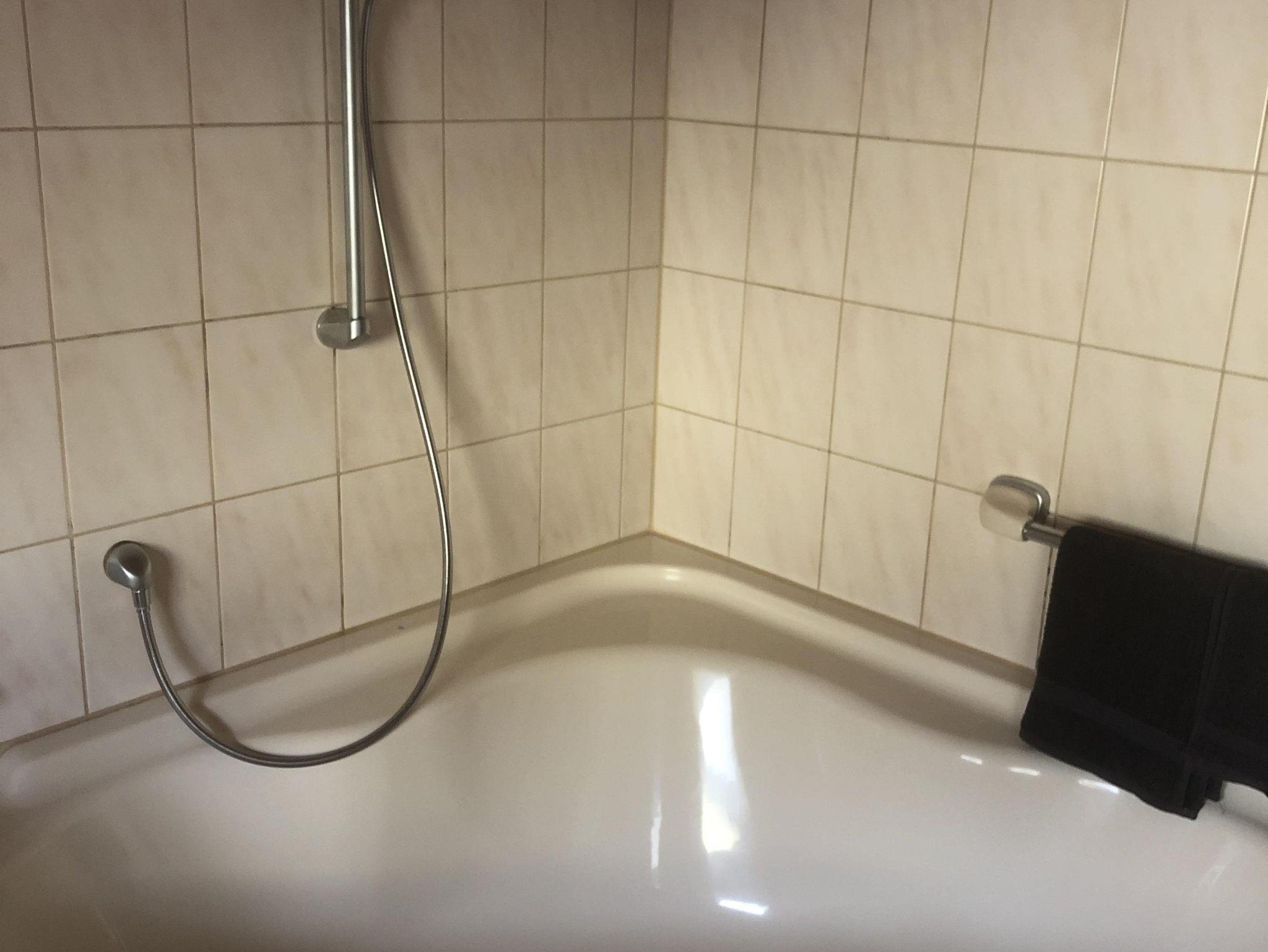 Das Badezimmer hat eine Badewanne mit Duschstange, Urinal, WC und Bidet. Handtücher sind im Mietpreis inbegriffen.