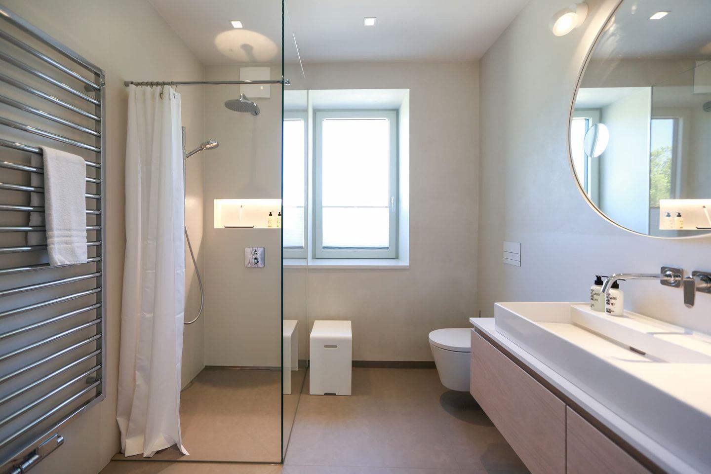 Das exklusive neu erbaute Ferienhaus ist geeignet für bis zu 14 Personen sowie 2 Kleinkinder, max. 2 Vierbeiner sind ebenfalls willkommen. Die Schlafmöglichkeiten erstrecken sich auf insgesamt 4 Doppelzimmer, 2 davon mit Fernsehern ausgestattet sowie ein großes Zimmer im Dachgeschoß mit 4 Alkovenbetten, die auch für Erwachsene geeeignet sind. Im Yogaraum gibt es noch 2 Schlafsofas. Drei geräumige Bäder, eines davon auch für Gäste mit eingeschränkter Mobilität konzipiert sowie drei separates Gäste-WCs, alle ausgestattet mit italienischen Fliesen und Fußbodenheizung tragen zum Wohlfühlen bei. Das Masterdoppelzimmer hat ein geräumiges Bad mit freistehender Badewanne. Das große Wohn-Esszimmer mit angrenzender Küche hat eine geräumige Sitzecke mit großem Fernseher.