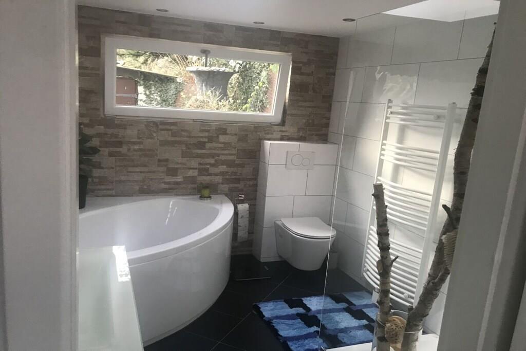 Meine Gäste erwartet ein kleines Haus mit großem Garten direkt am Waldrand von Schlangenbad Wambach. Hier gibt es viele herrliche Möglichkeiten sich mit seinem Vierbeiner auszutoben, spazieren zu gehen, Fahrrad fahren, einen entspannten Abend vorm Kamin zu verbringen oder mal nach Rüdesheim, Mainz, Wiesbaden oder Frankfurt zu fahren. Alles ist mit dem Auto oder öffentlichen Verkehrsmitteln gut zu erreichen. Gleichermaßen ist das Haus geeignet für Geschäftsleute, Messeaussteller oder- besucher. Der Wohnraum des freistehenden Hauses ist modern und gemütlich konzipiert. Die Böden sind pflegeleicht gefliest oder mit Echtholzdielen versehen. Es gibt nur eine Wohnebene, im Haus selbst gibt es keine Treppen. Das Haus verfügt über 2 seperate Schlafzimmer mit 140 und 180 cm breiten Betten. Das Sofa im gemütlichen Wohnzimmer bietet eine weitere Schlafmöglichkeit, Fernseher (Smart TV) BOSE Wave SoundTouch und einen Kamin. Für das erste Anheizen des Kamins ist für Holz gesorgt. Für weiteres heizen mit dem Kamin bitte gut getrocknetes Holz z. B. im Baumarkt besorgen. Die Küche ist gut ausgestattet mit Kaffeemaschine, Backofen, Herd etc. Selbstverständlich ist WLAN überall verfügbar. Das Badezimmer verfügt über eine ebenerdige Dusche und über eine Badewanne.
